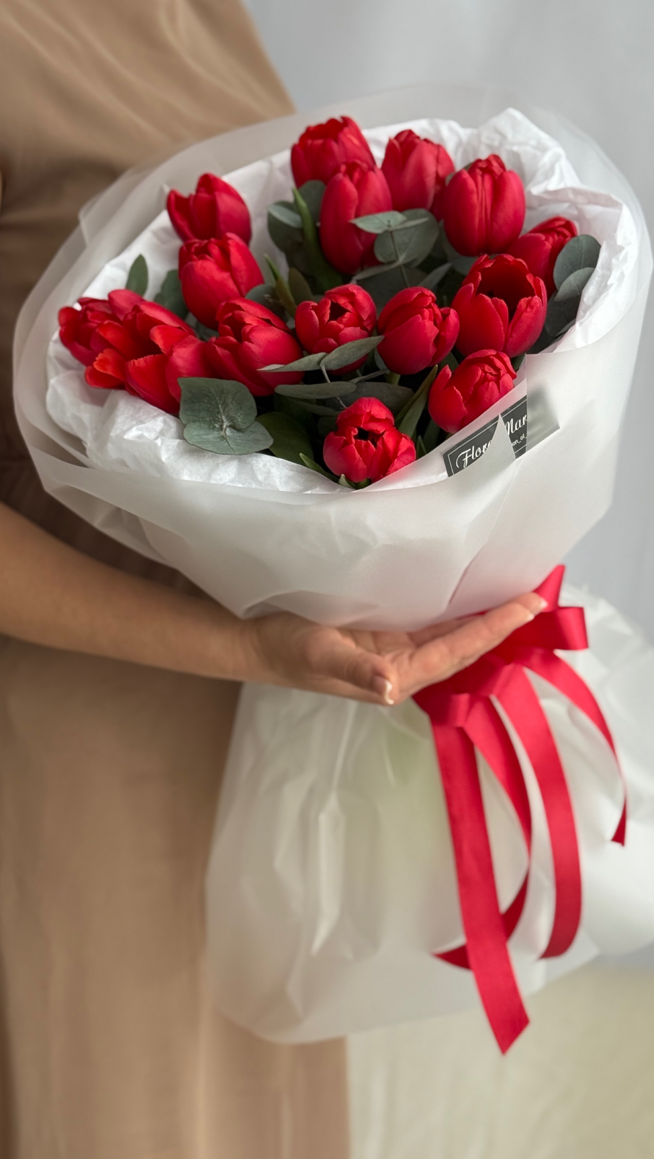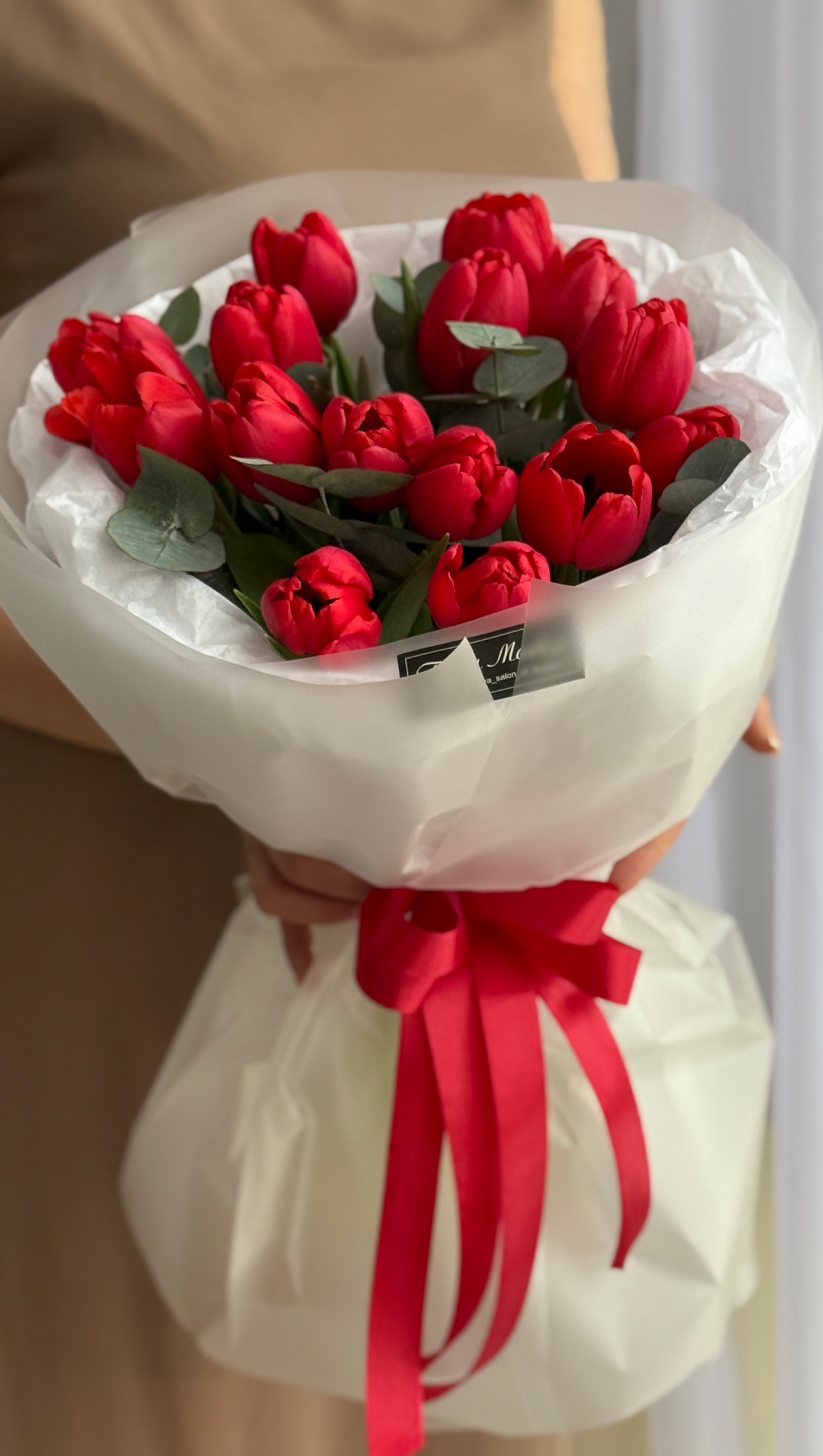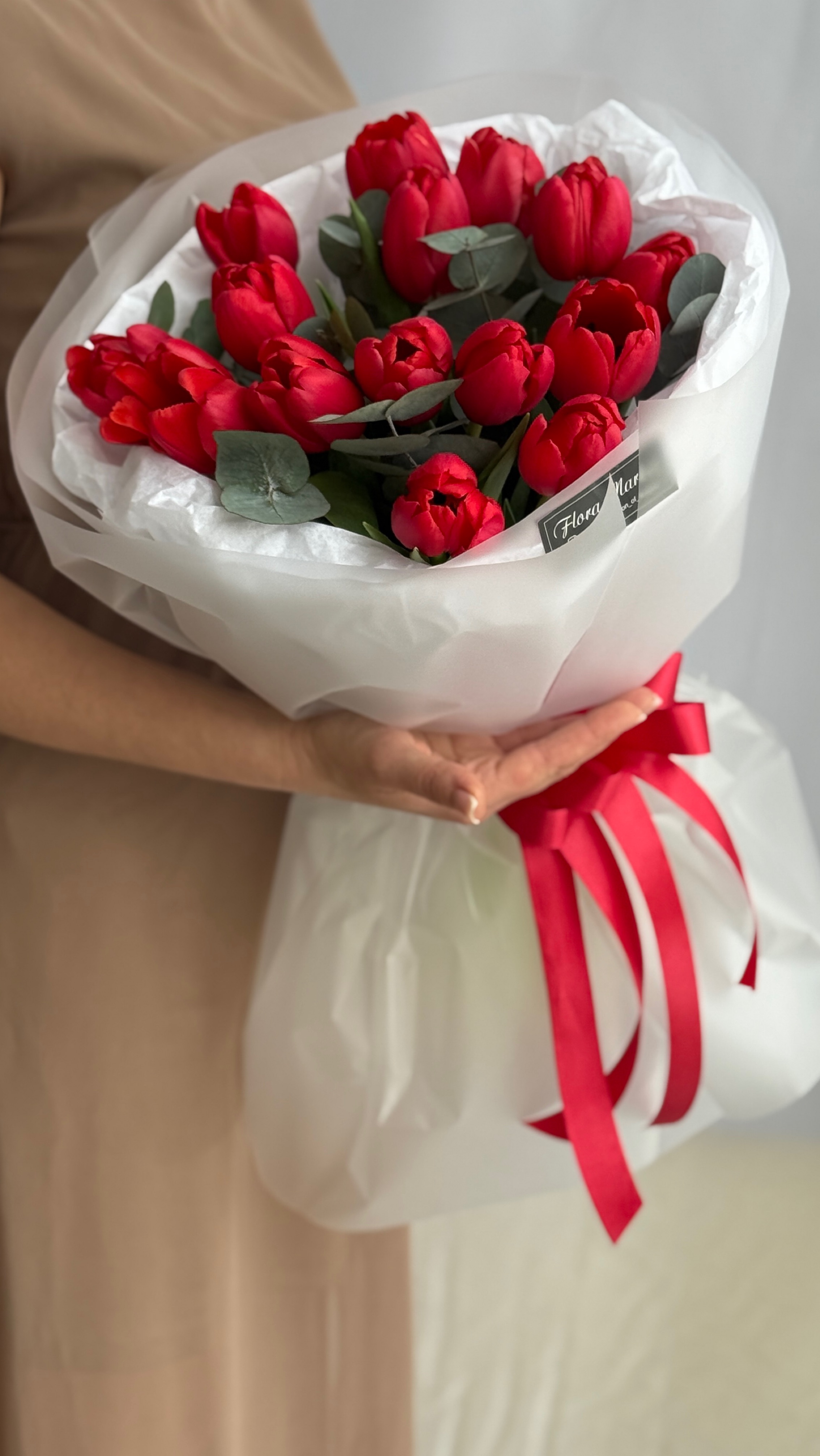 Премиальные красные тюльпаны и элегантный эвкалипт в воздушной упаковке — символ любви и восхищения от бренда "Флора Маркет". Идеальный подарок на День рождения, 14 февраля, 8 марта. Подчеркните свою заботу и чувства, выбрав этот изысканный букет!
