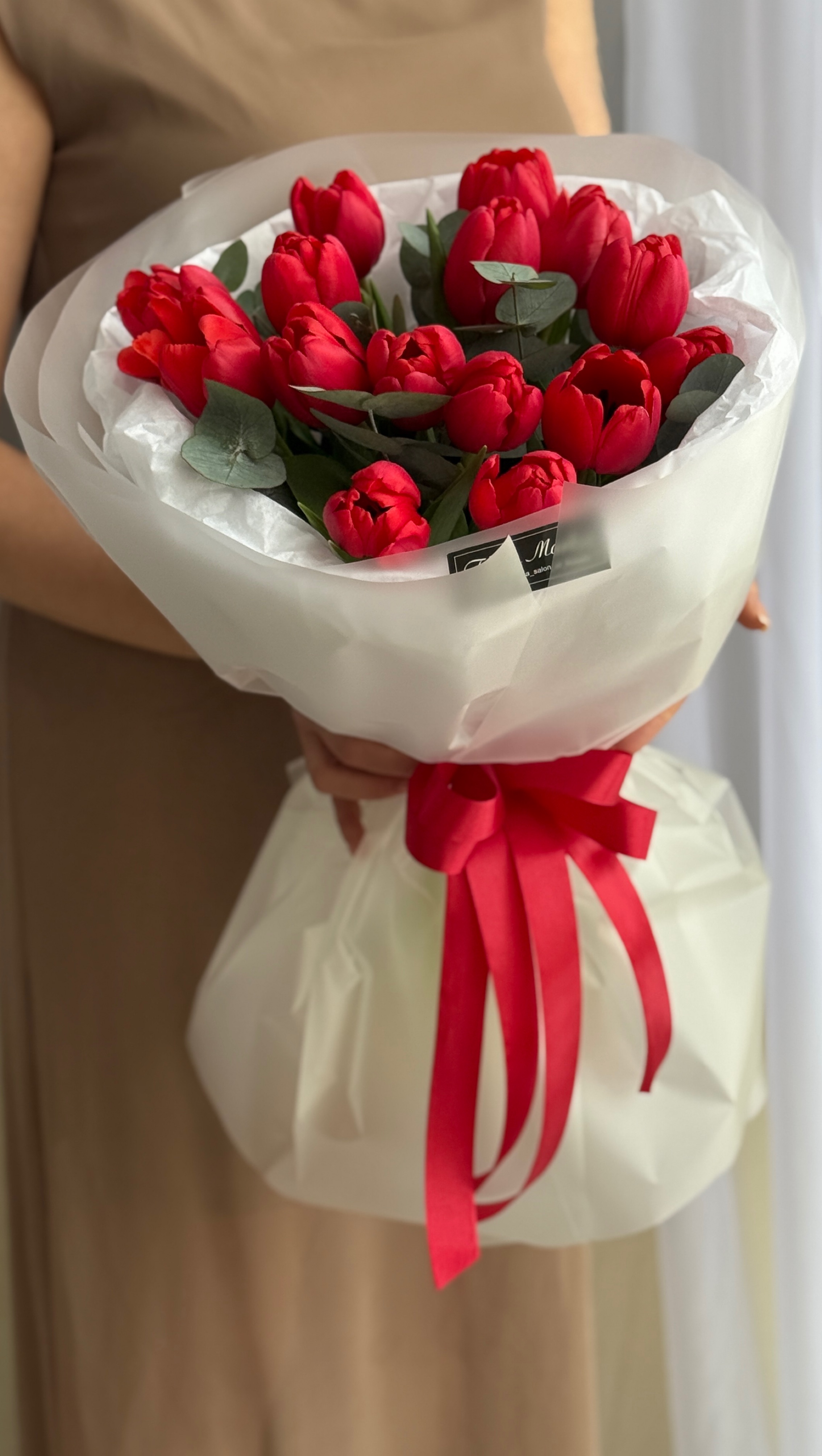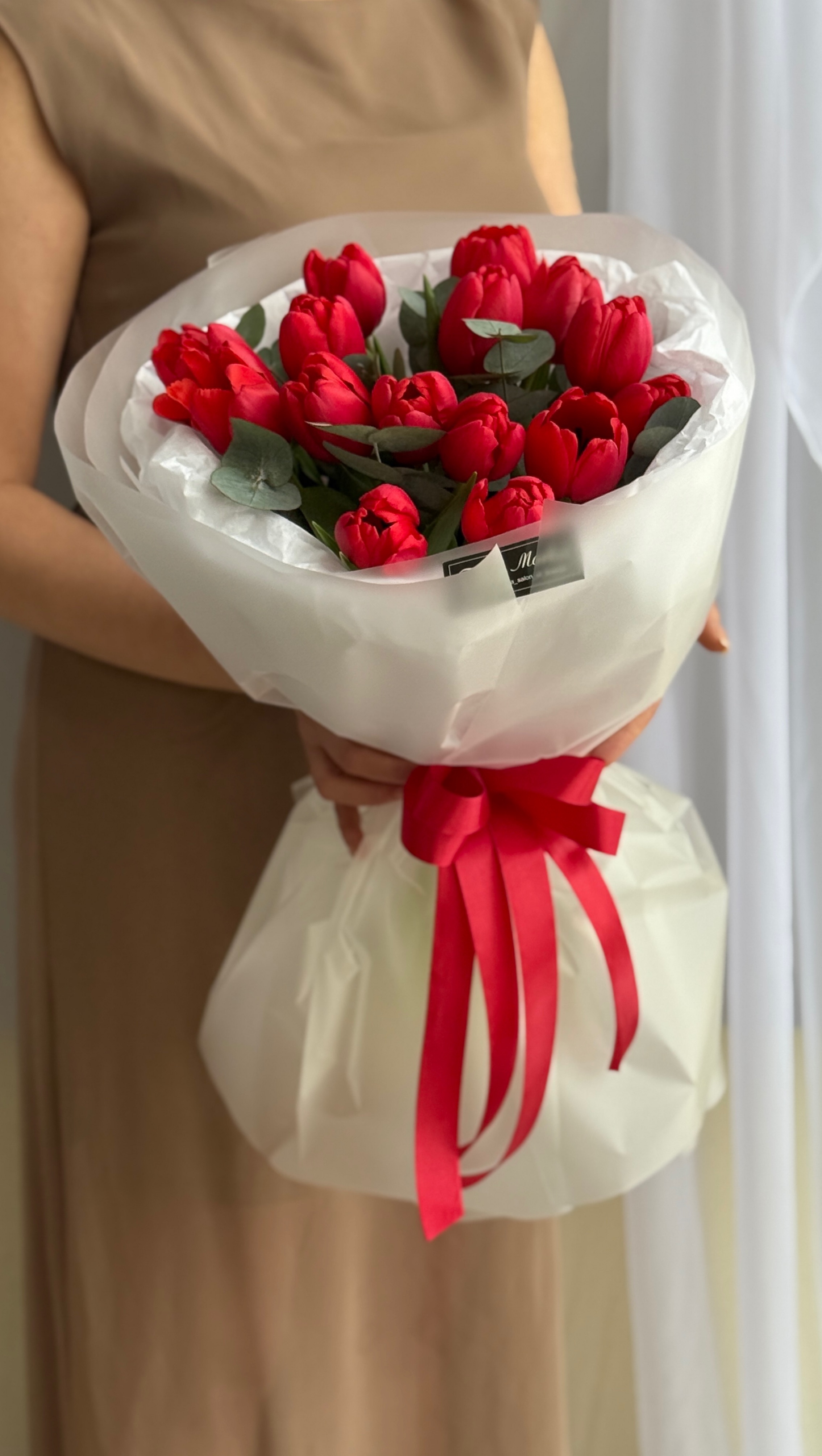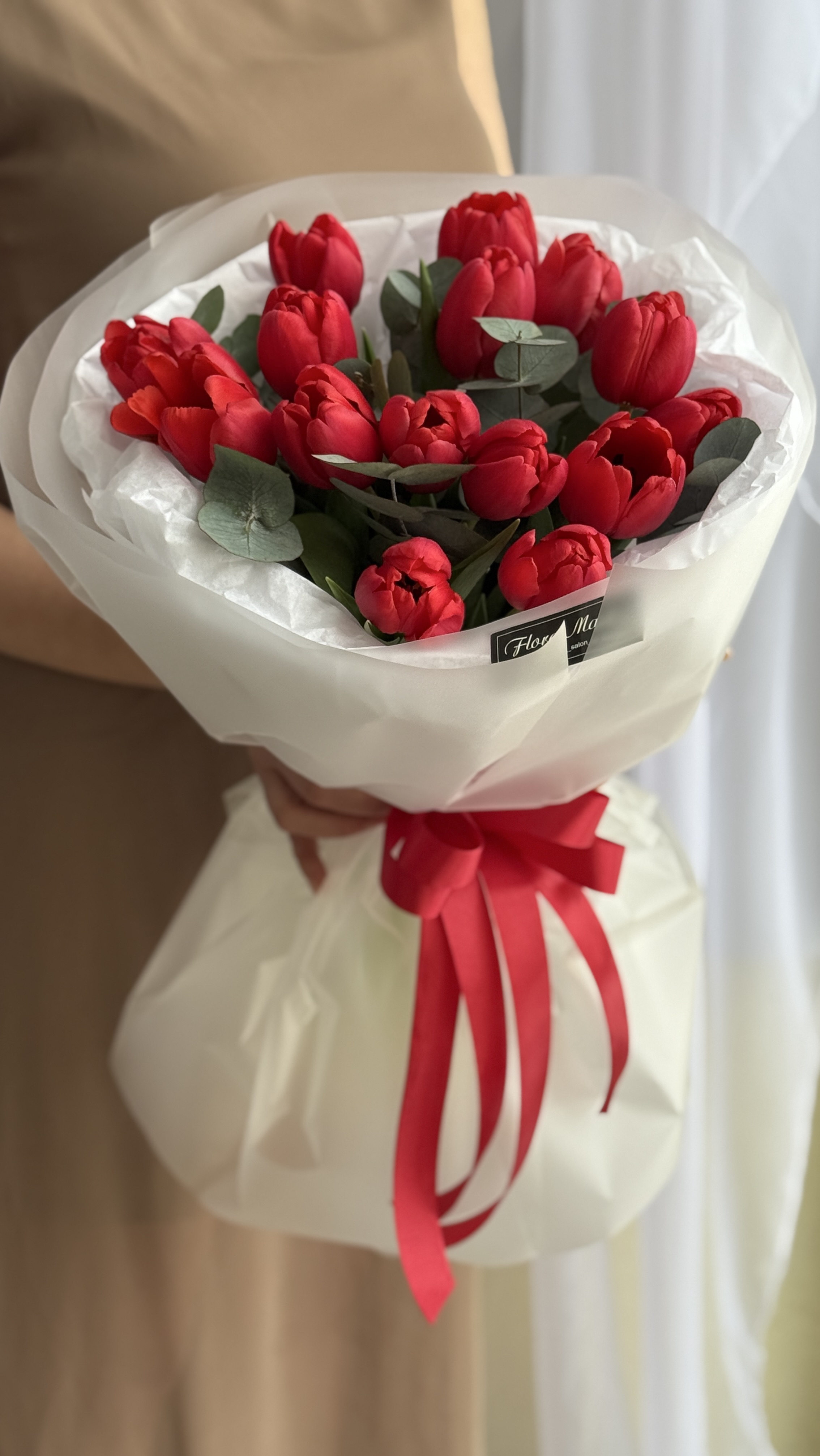 Премиальные красные тюльпаны и элегантный эвкалипт в воздушной упаковке — символ любви и восхищения от бренда "Флора Маркет". Идеальный подарок на День рождения, 14 февраля, 8 марта. Подчеркните свою заботу и чувства, выбрав этот изысканный букет!