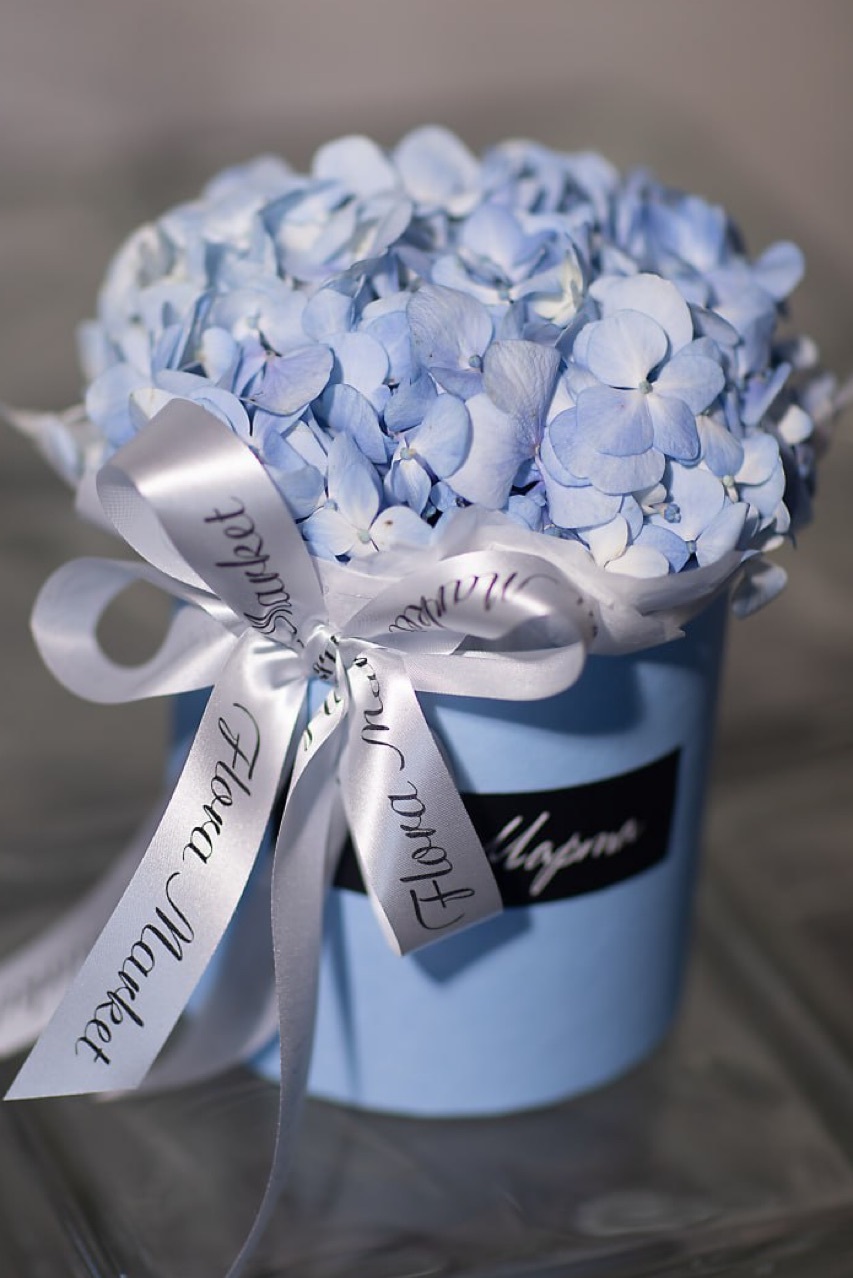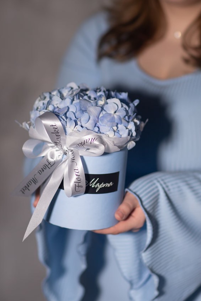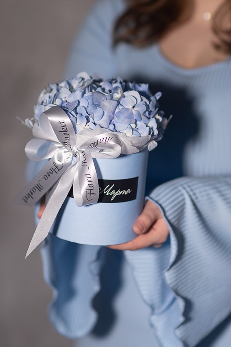 Композиция из нежно - голубой гортензии в шляпной коробке «с 8 Марта».