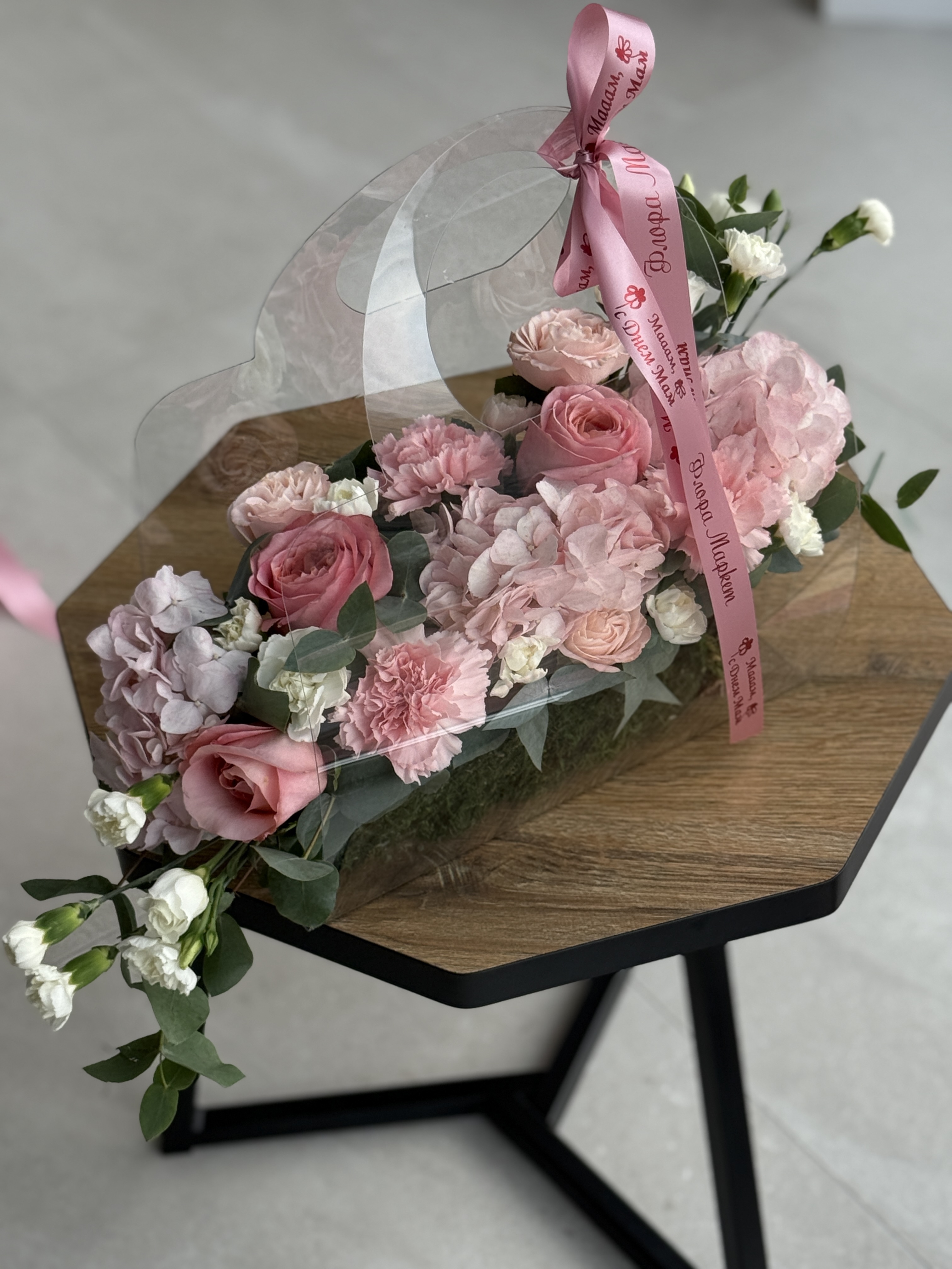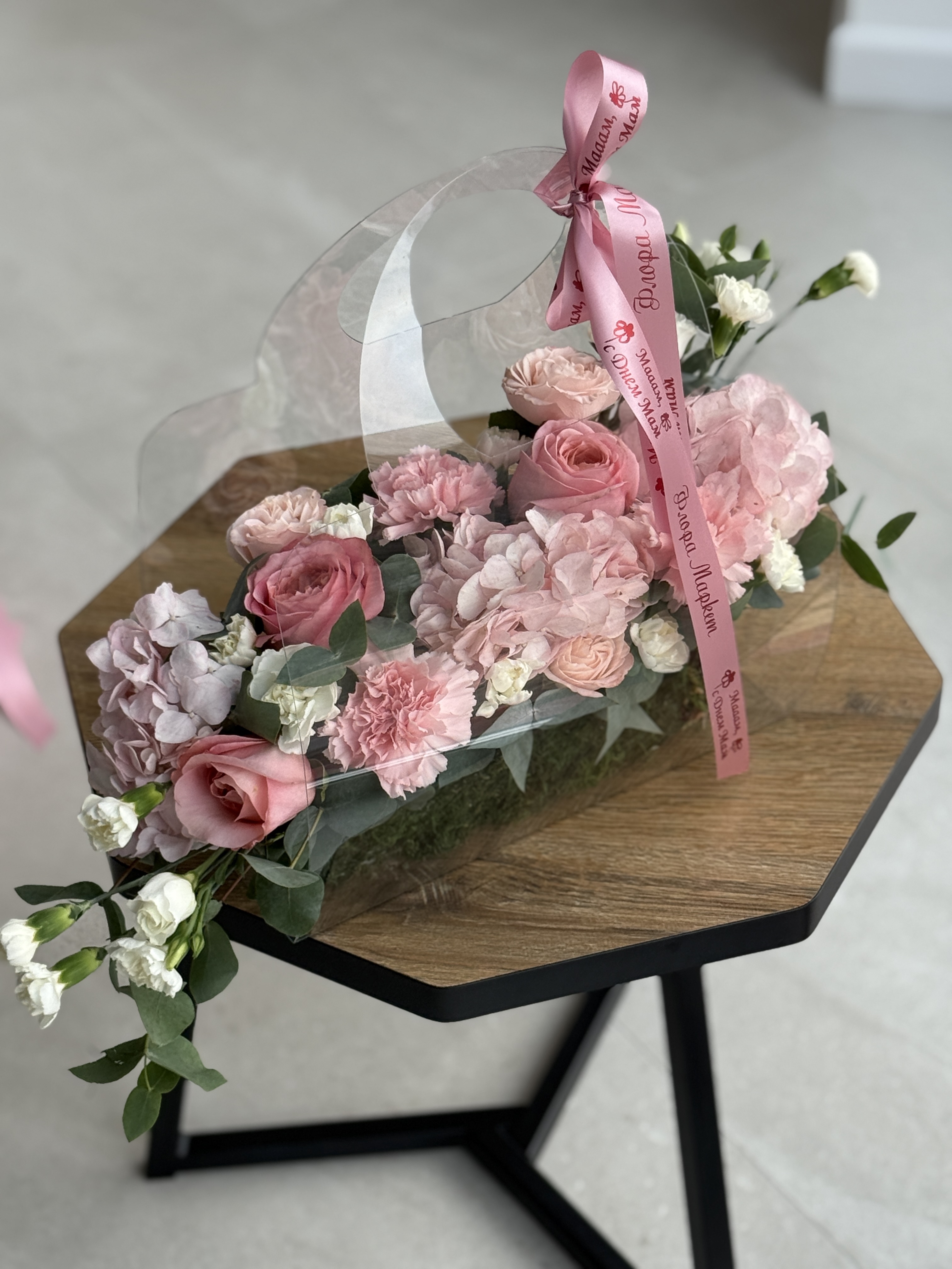 Композиция из сезонных цветов розовой гаммы в прозрачном боксе от Флора Маркет.
