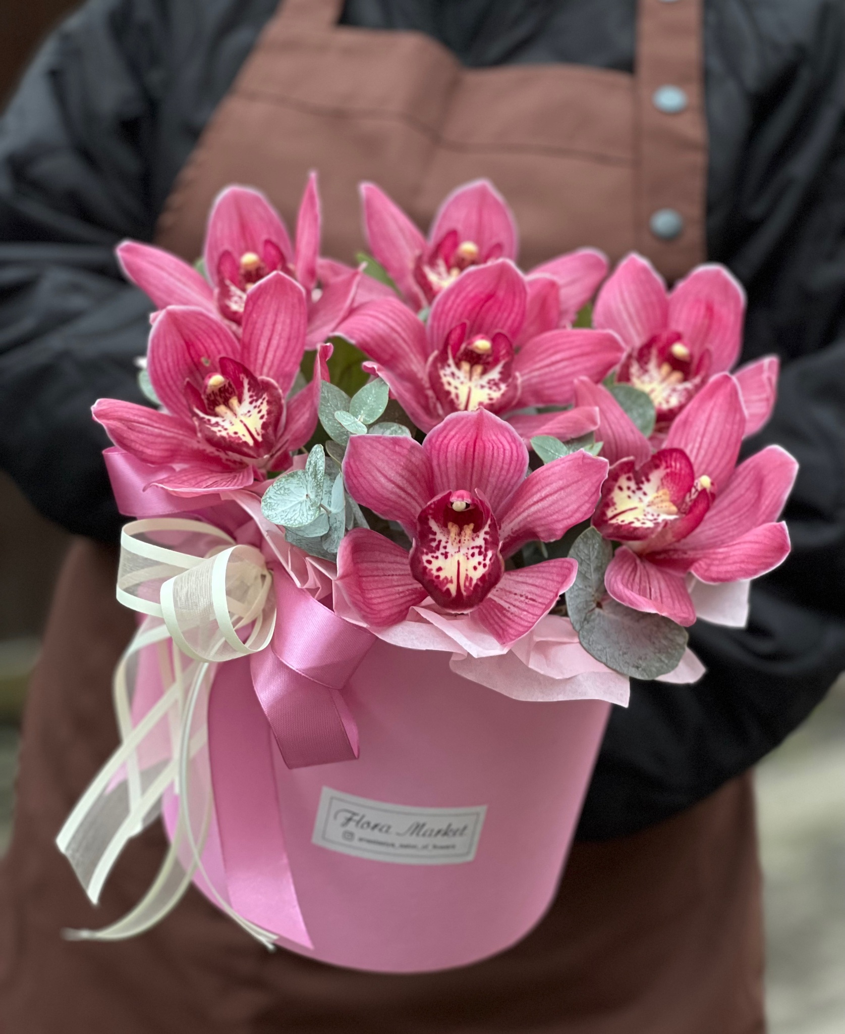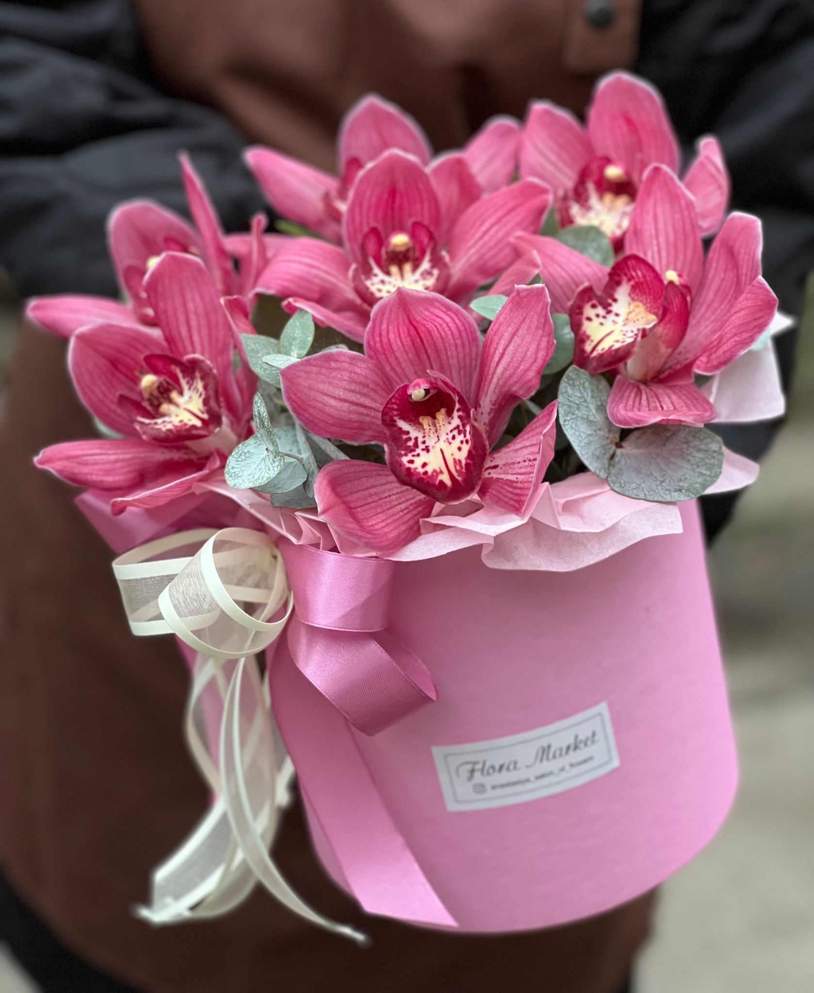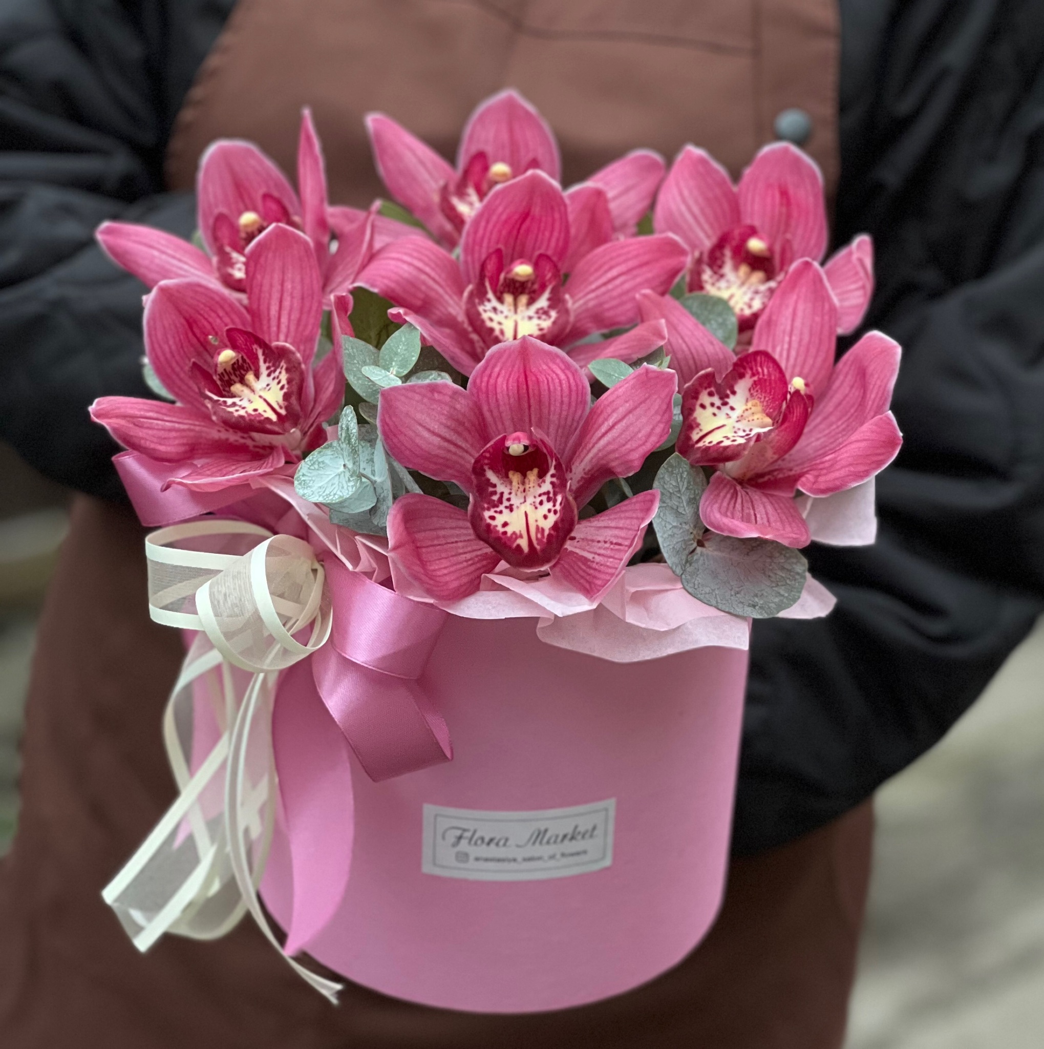 Композиция из цимбидиума и эвкалипта в шляпной коробке