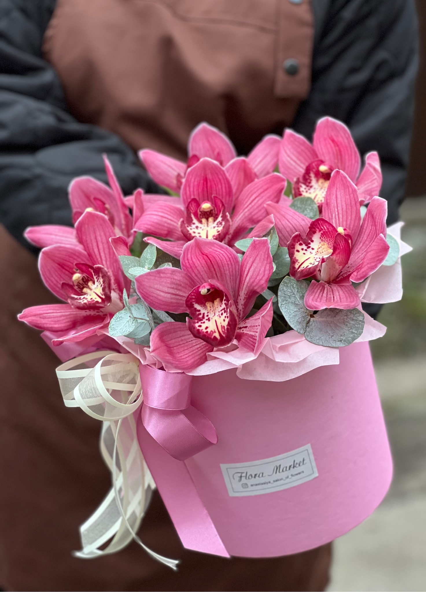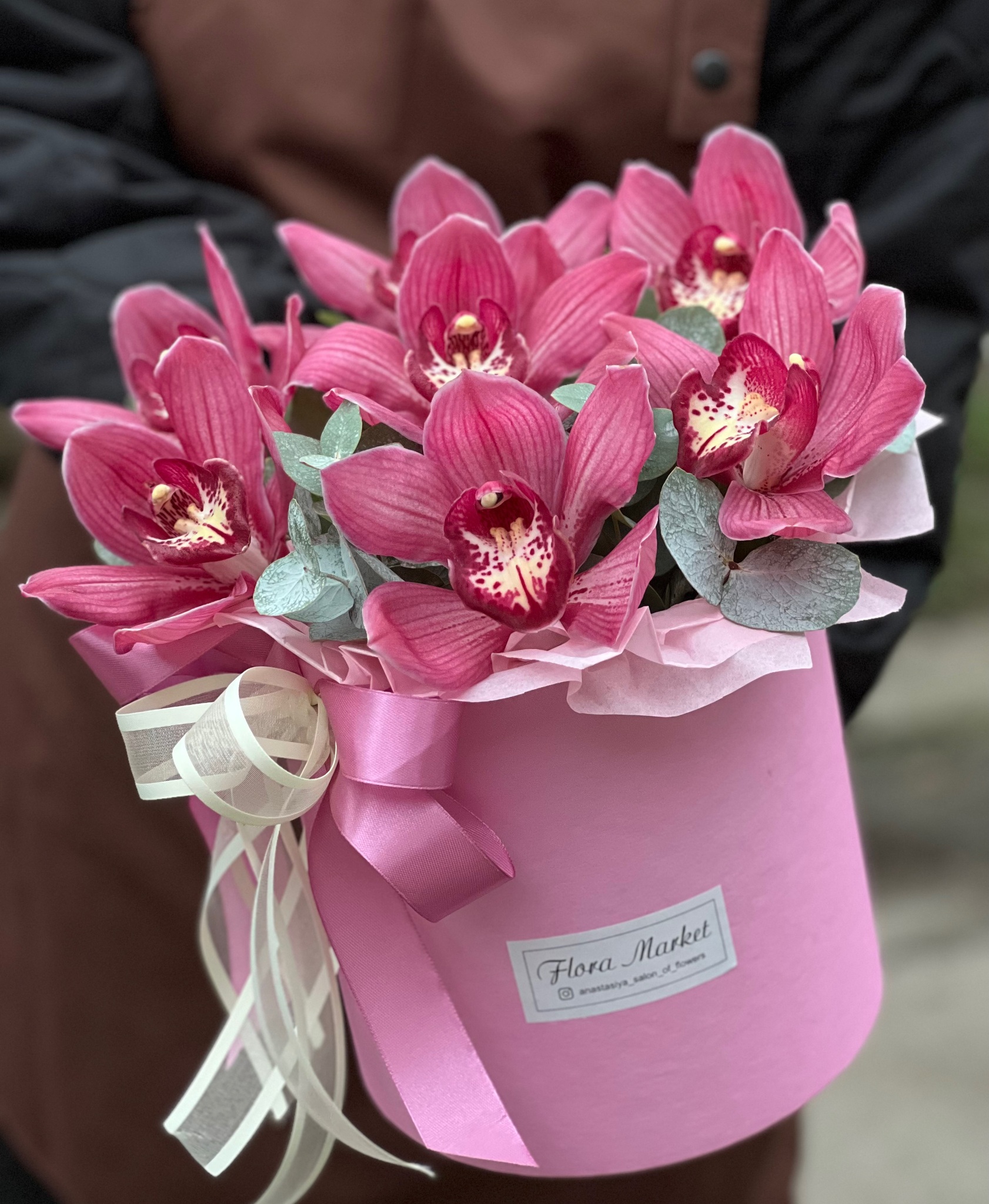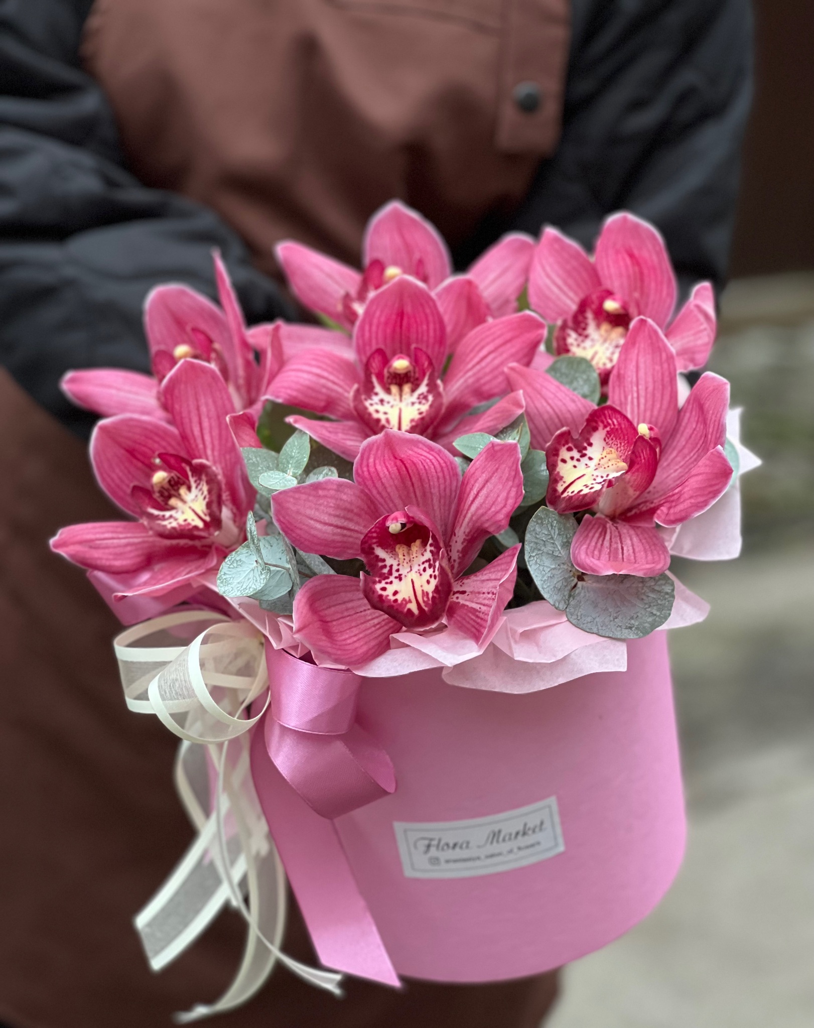 Композиция из цимбидиума и эвкалипта в шляпной коробке