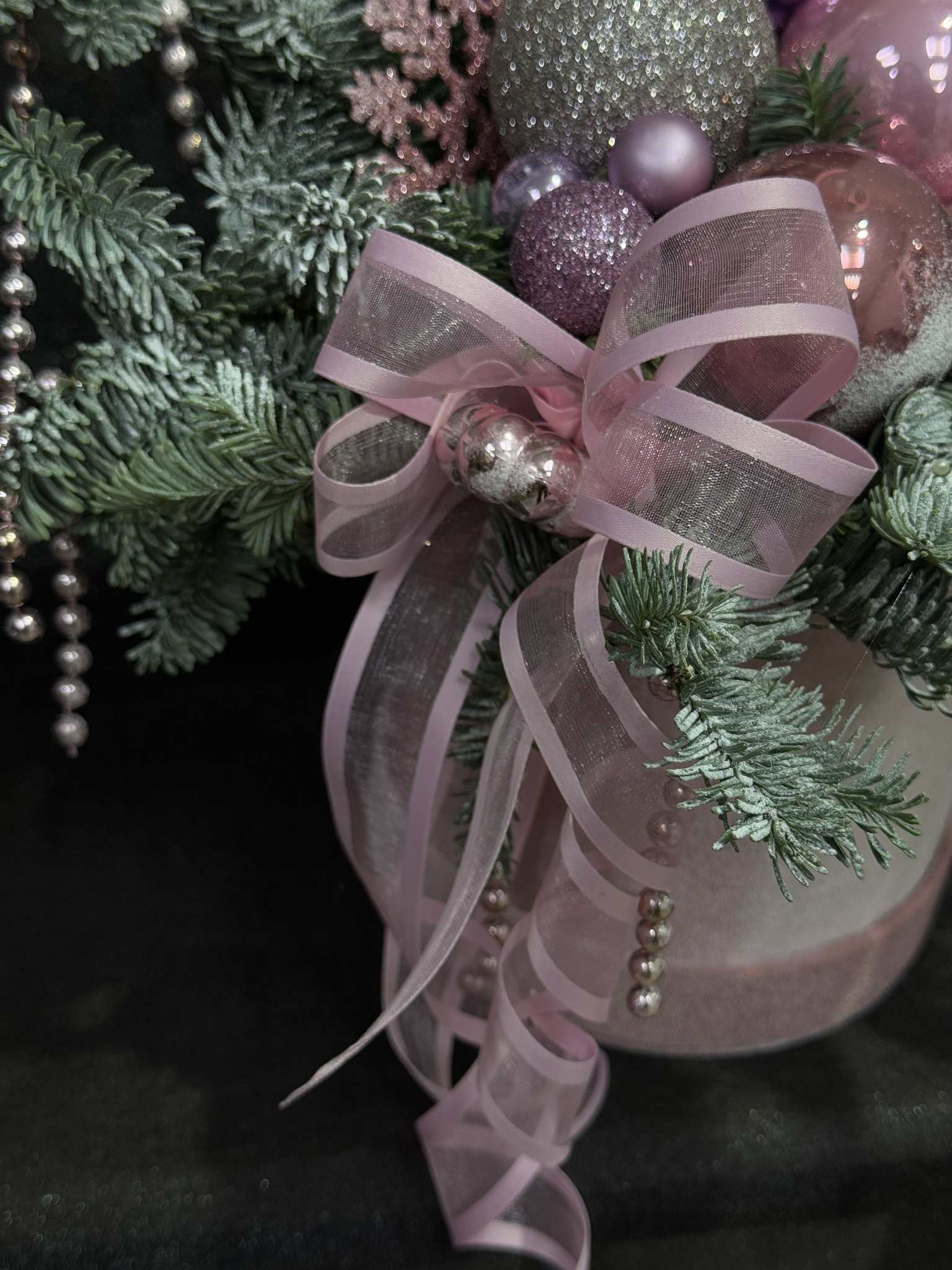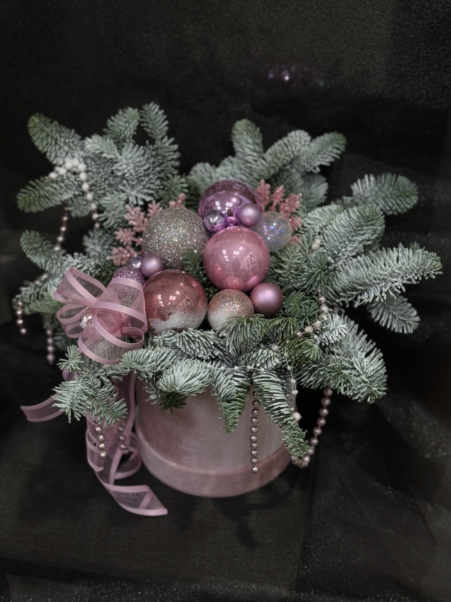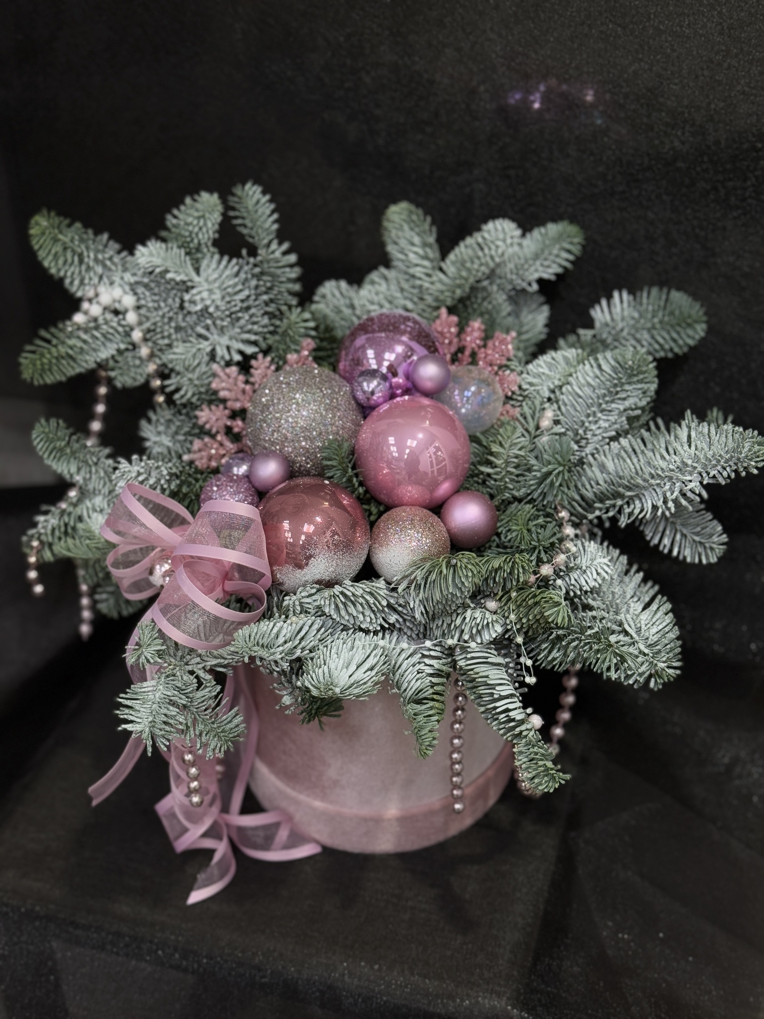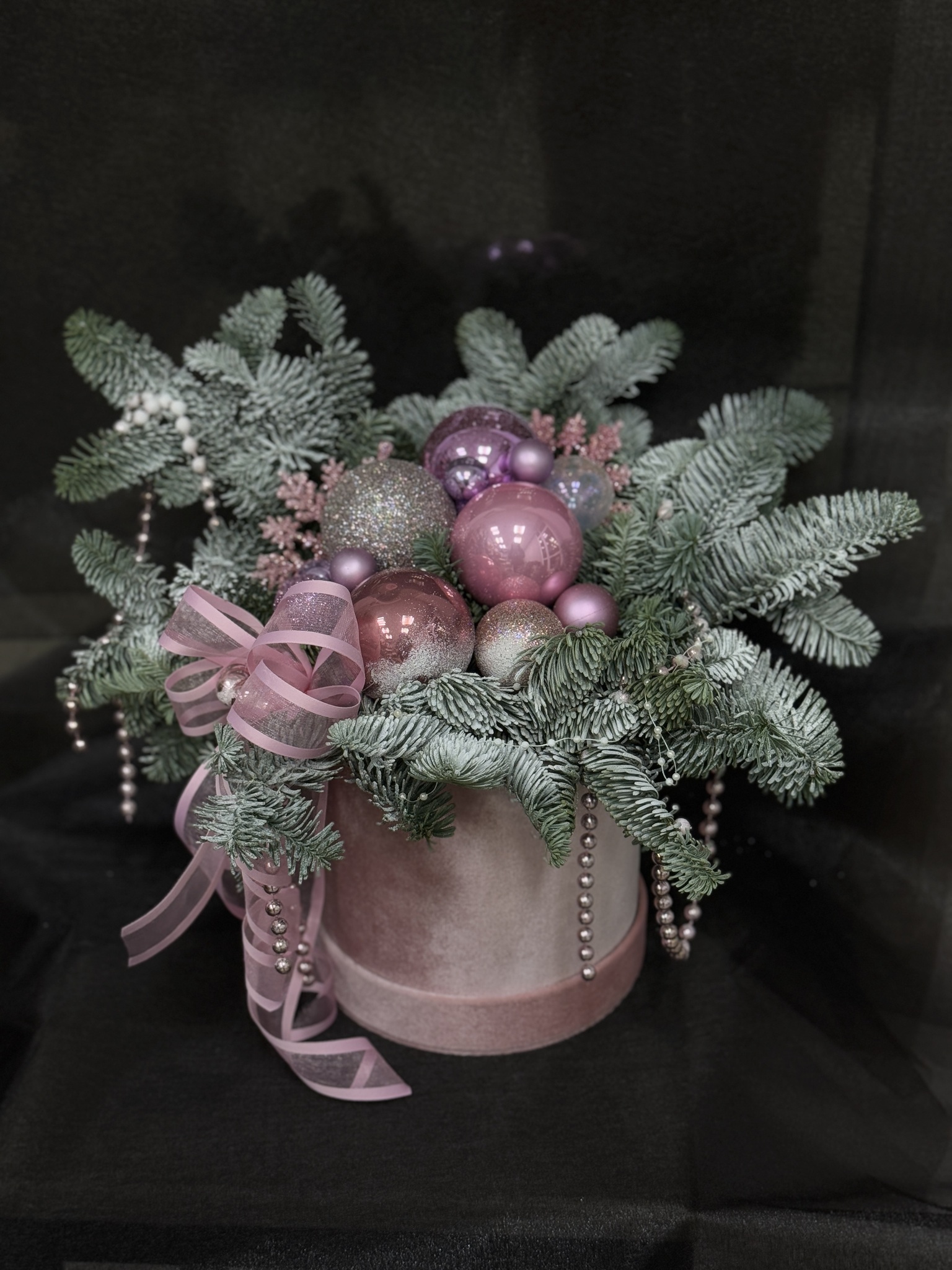 Эта роскошная новогодняя композиция станет идеальным украшением вашего дома! Живой нобилис в стильной бархатной коробке подарит ощущение праздника и создаст волшебную атмосферу Нового года и Рождества. Нежные пудрово-розовые тона подчеркнут очарование зимних праздников. Подарите себе и своим близким кусочек новогоднего чуда от бренда Флора Маркет – новинку, которая порадует глаз и согреет сердце!