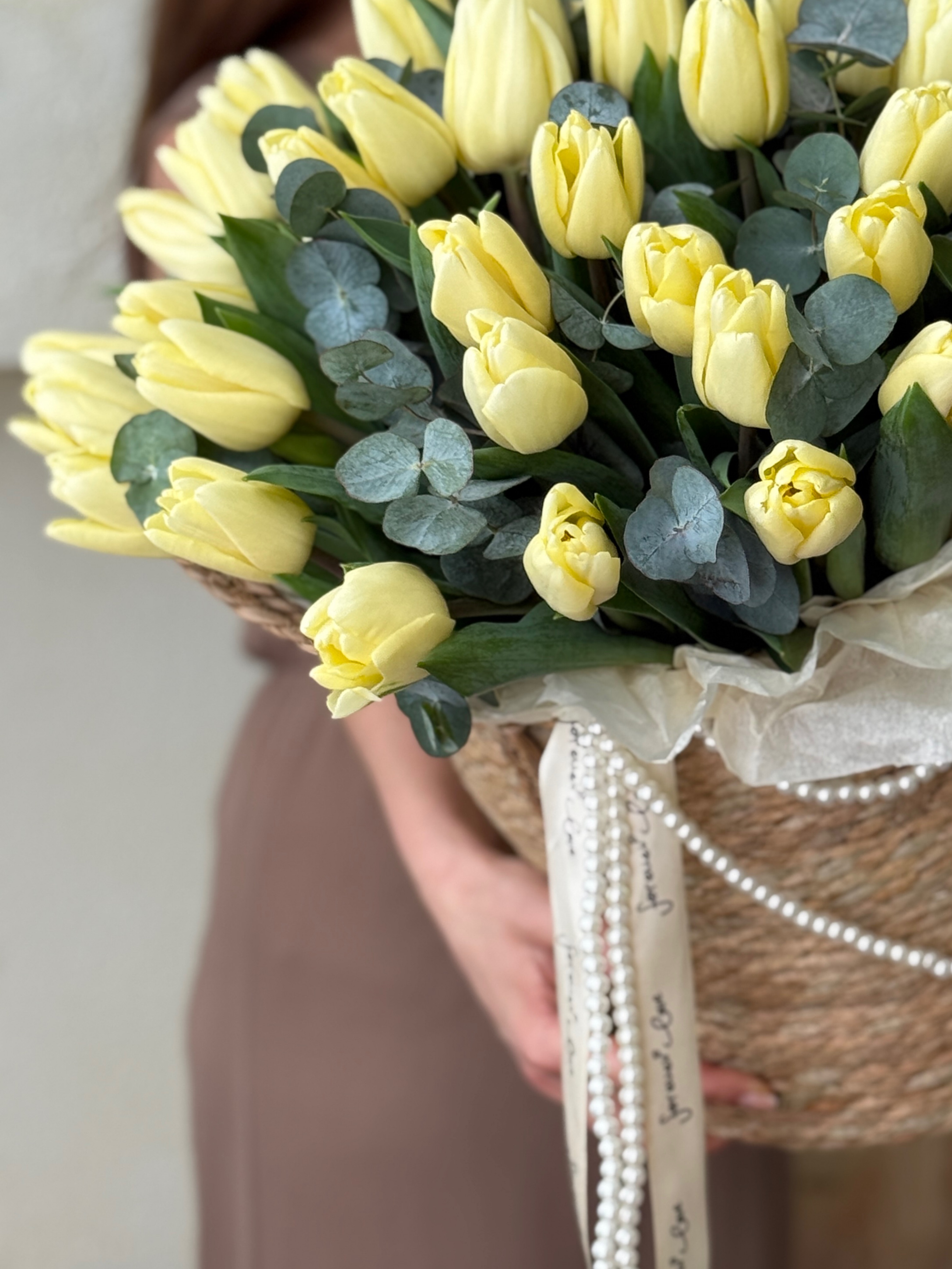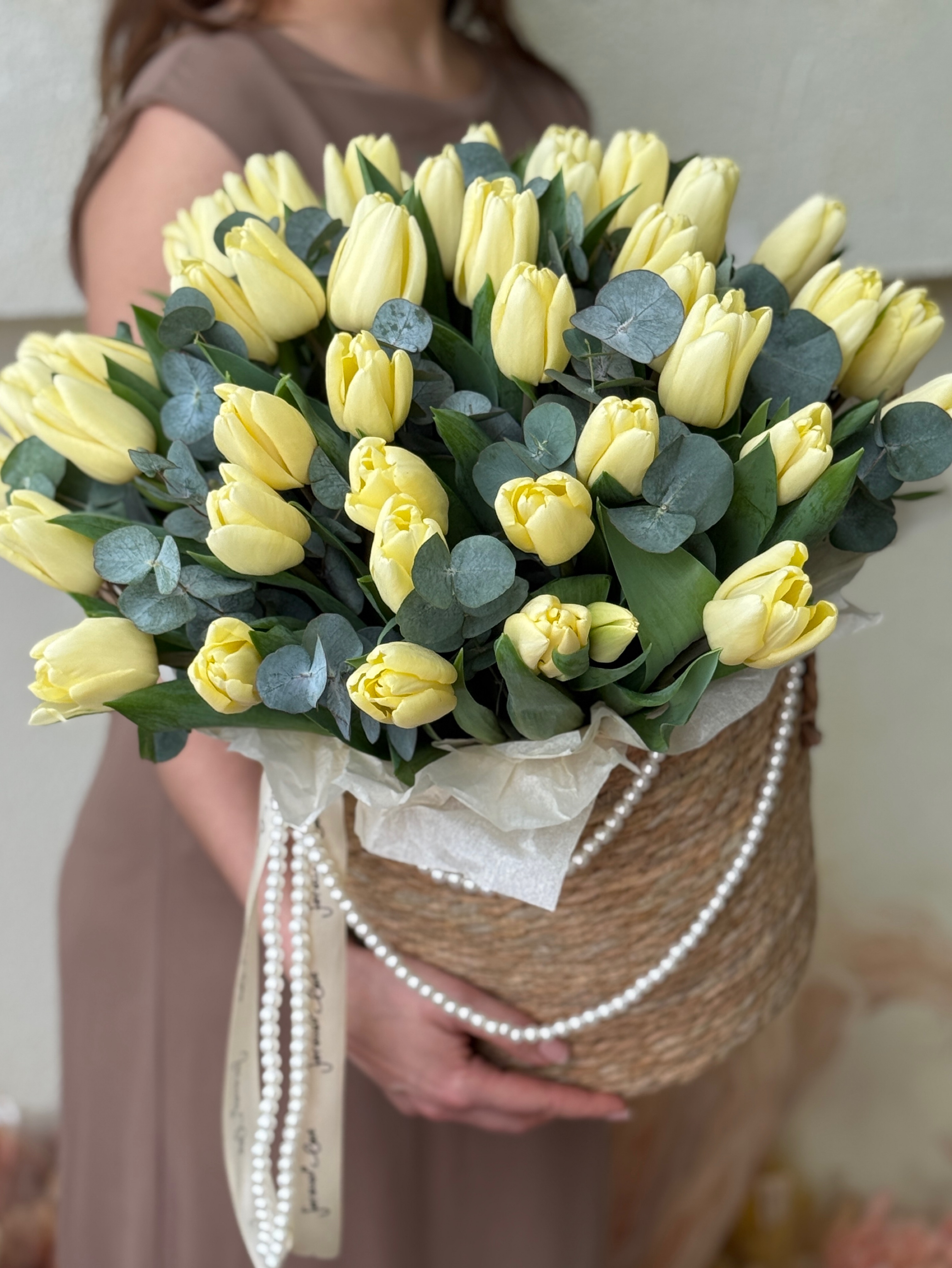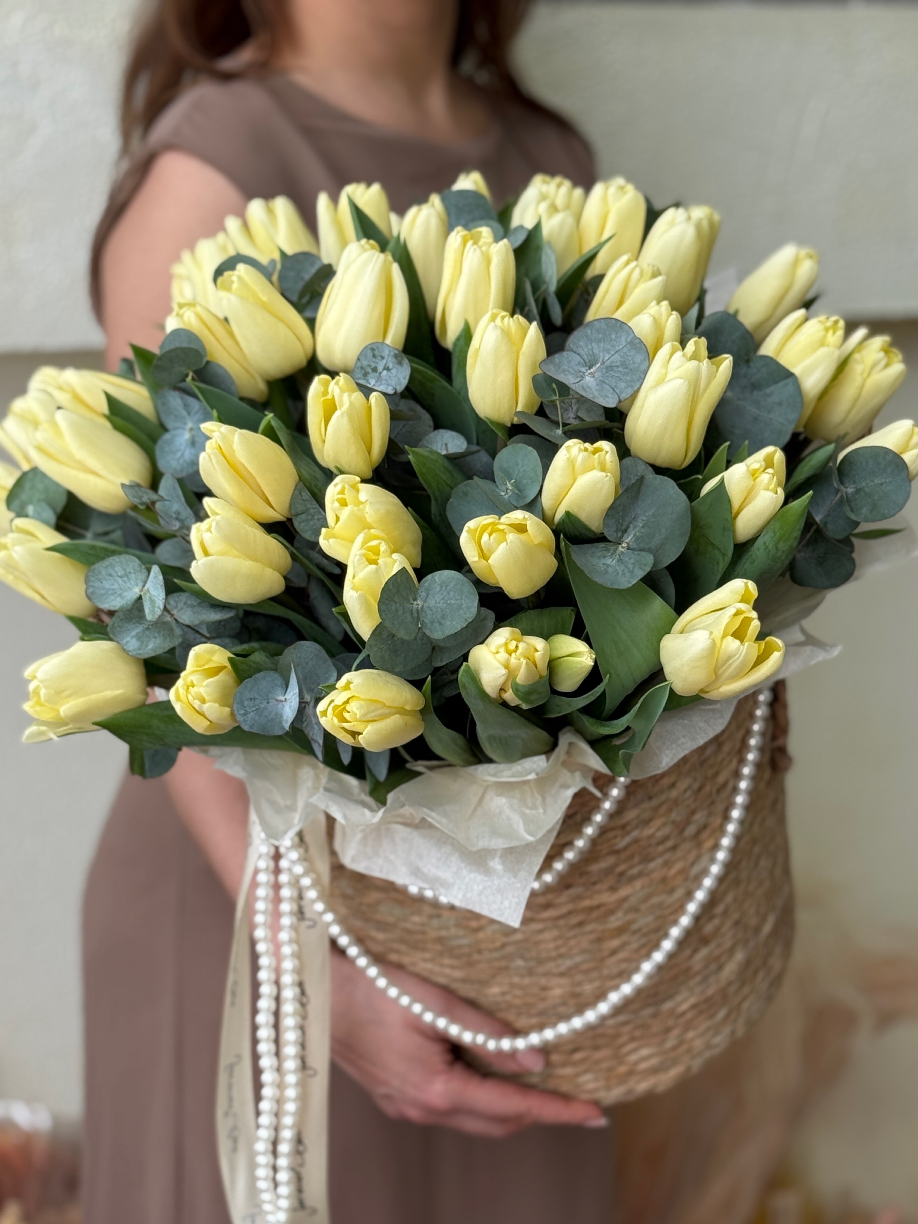 Нежные кремовые тюльпаны и эвкалипт в элегантной корзине от Флора Маркет.