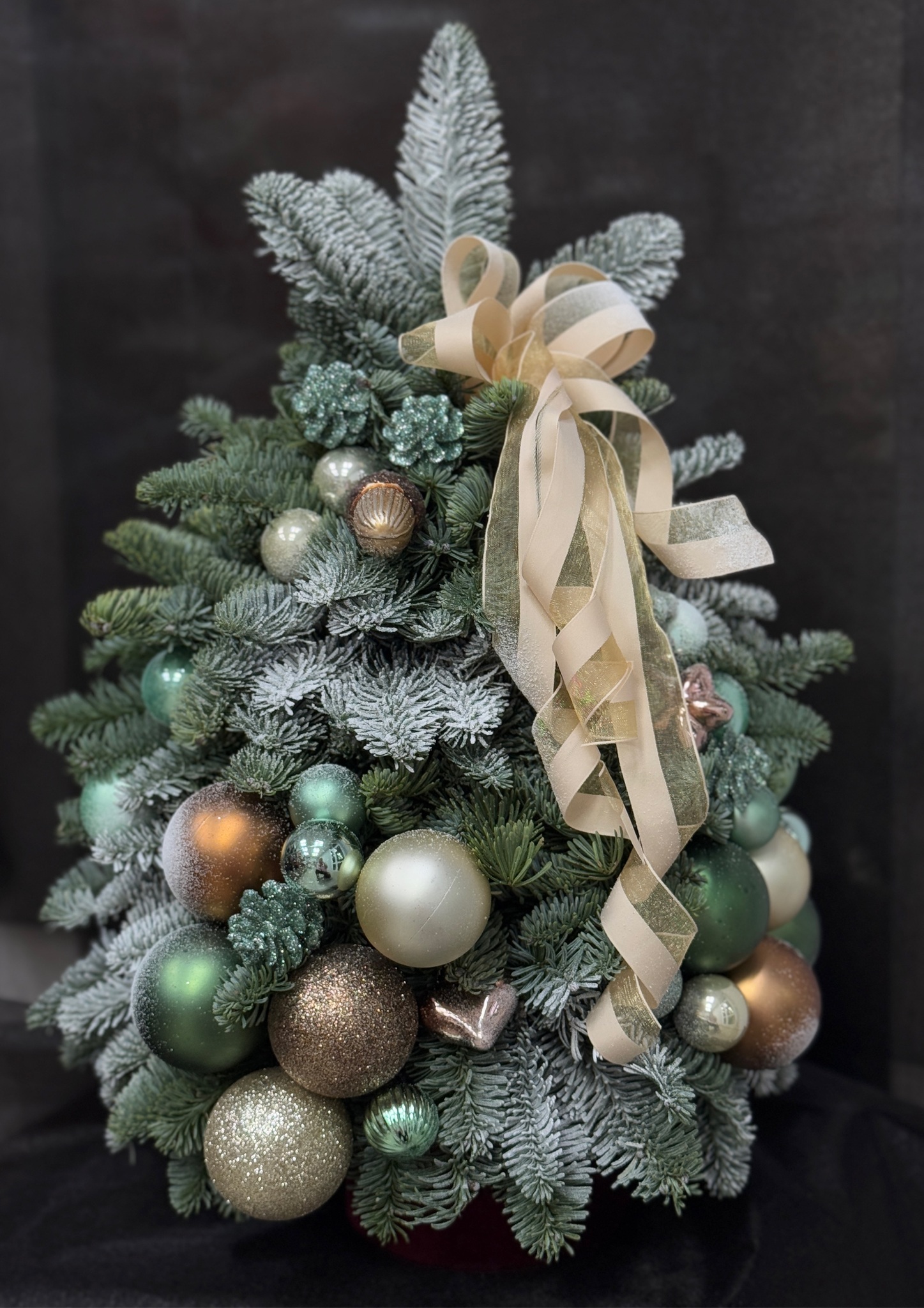 Новогодняя композиция из нобилиса "Елочка ручной работы", оформленная в золотых, бронзовых и изумрудных оттенках , 40-50 см.