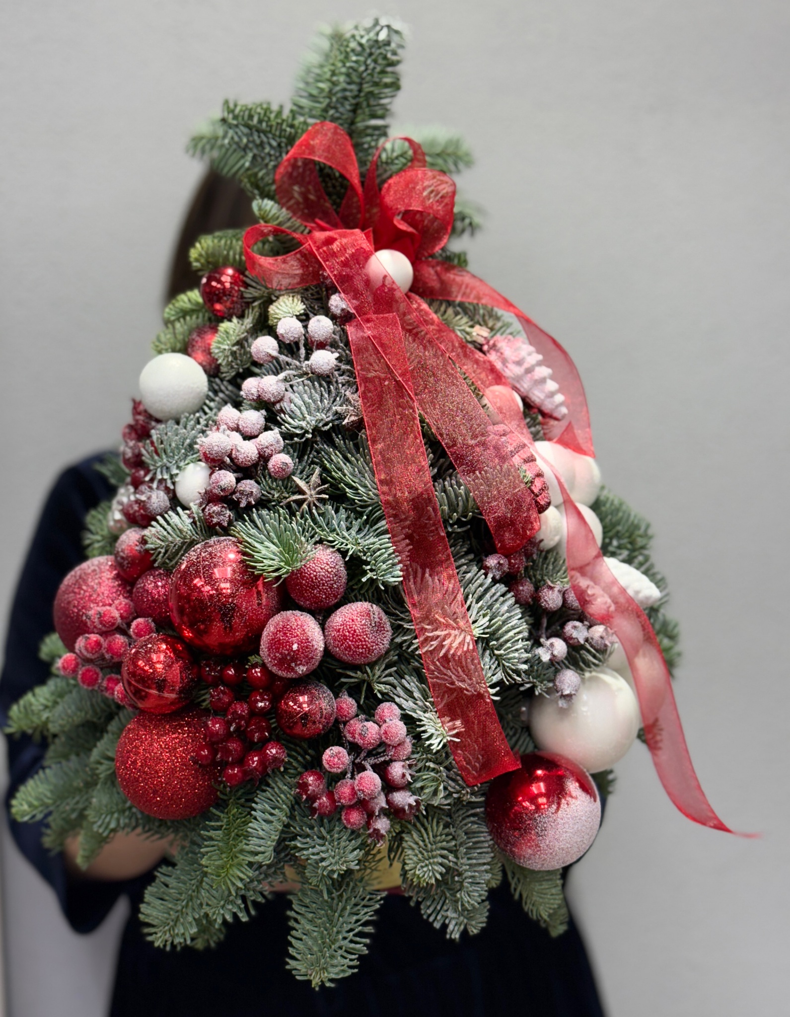 Новогодняя композиция из живого нобилиса ручной работы, декорированная в ярко-красных и белых оттенках, 55-60 см