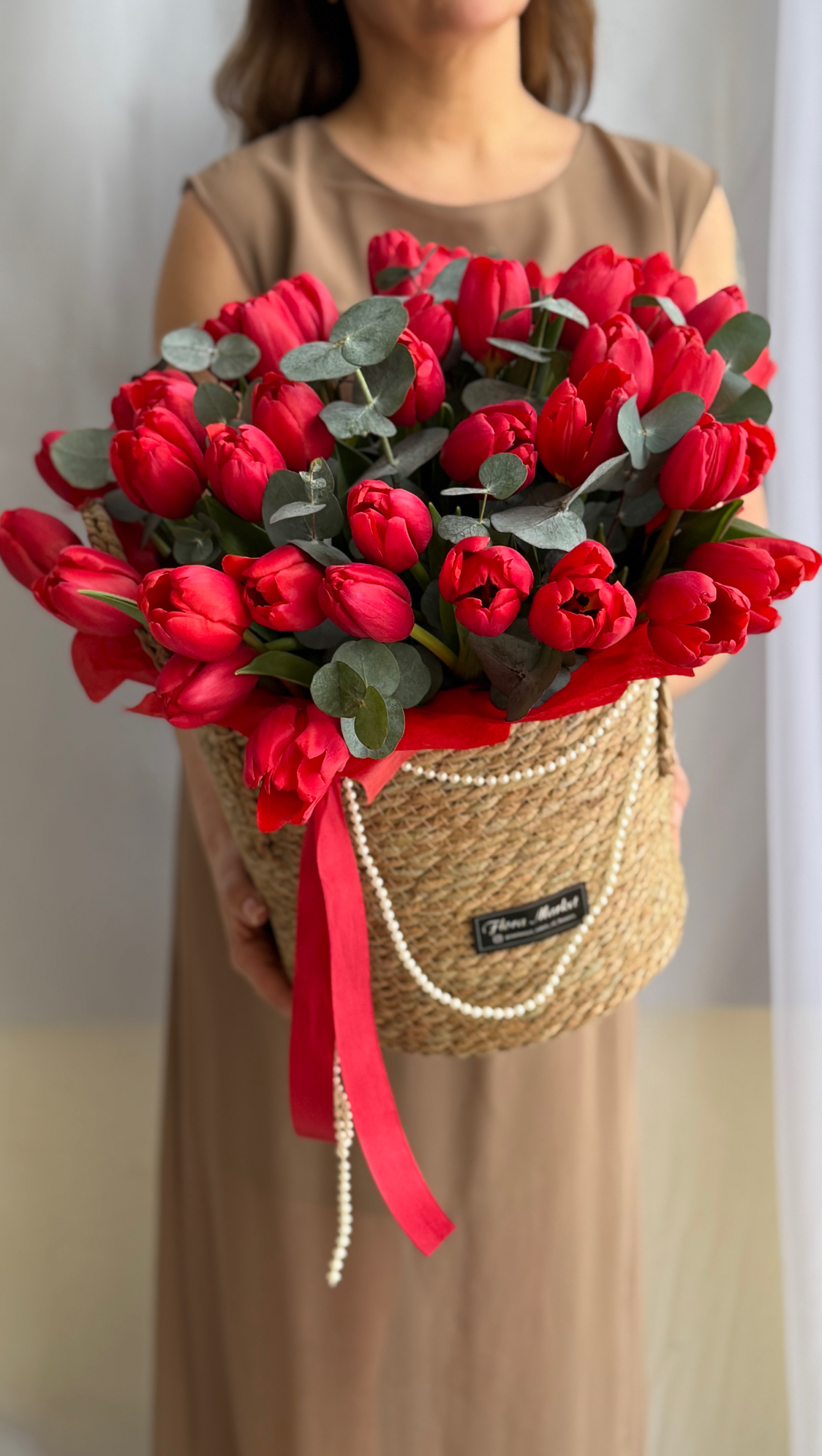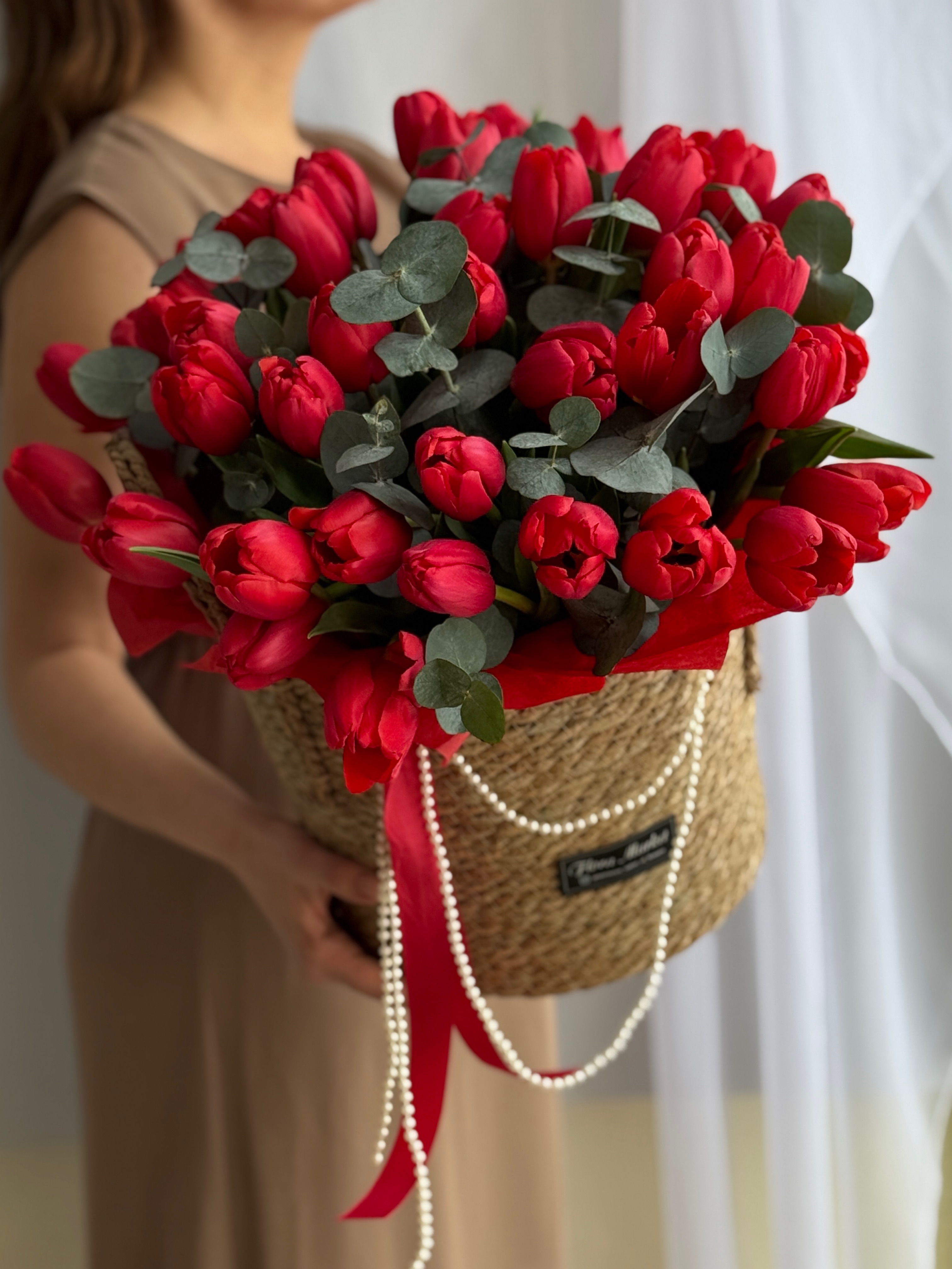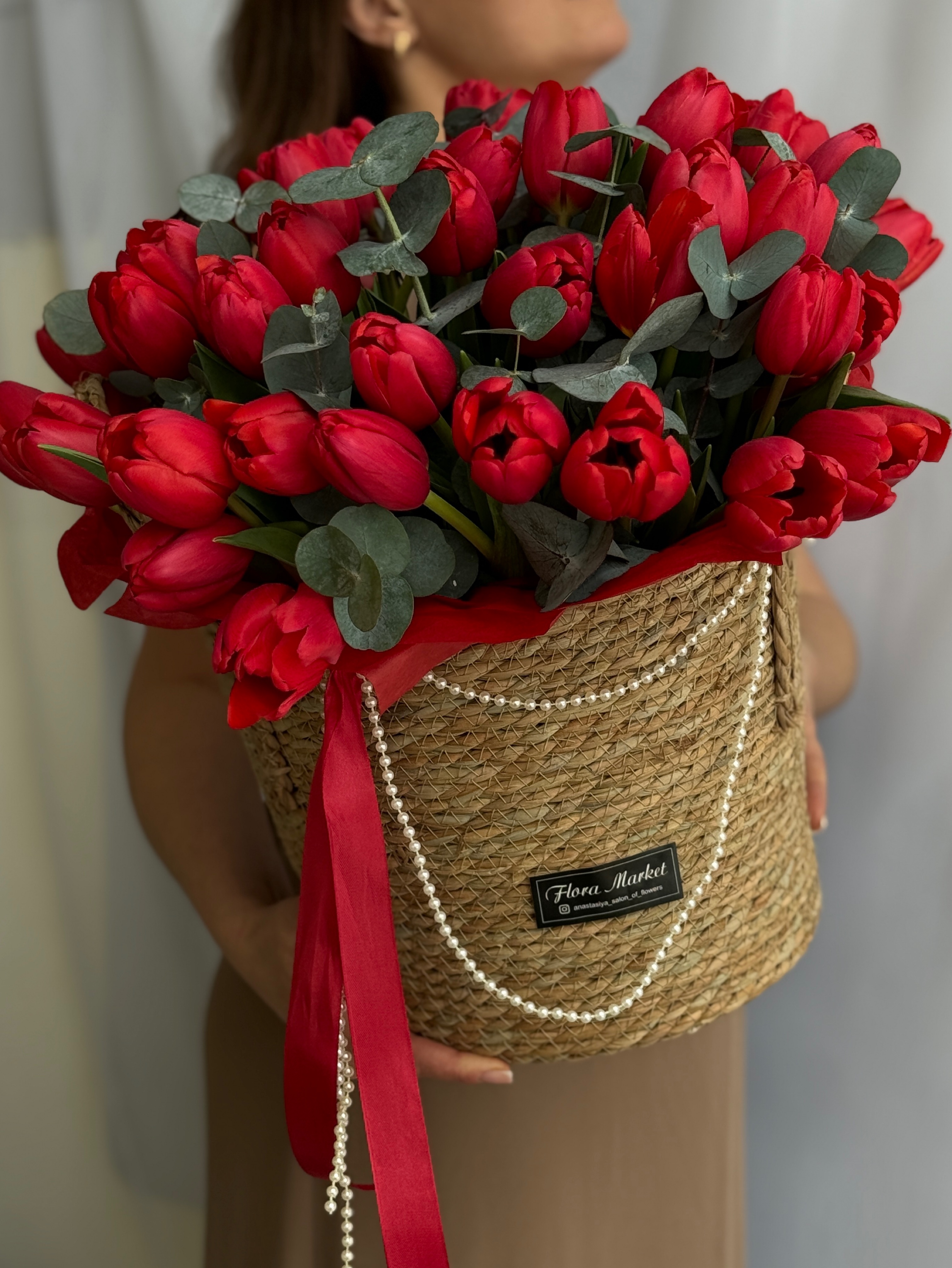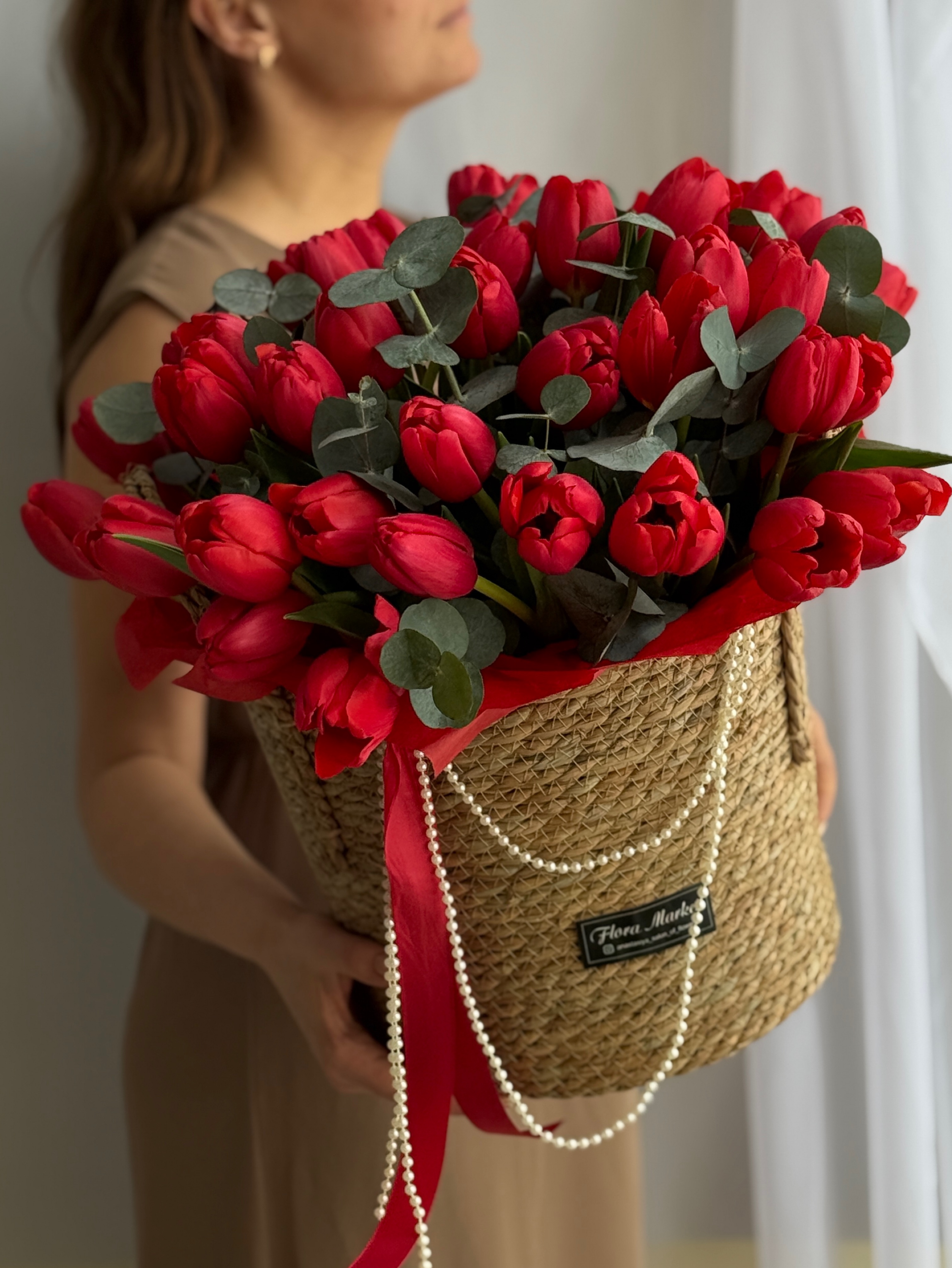 Яркие красные тюльпаны и ароматный эвкалипт в стильной корзине от Флора Маркет.