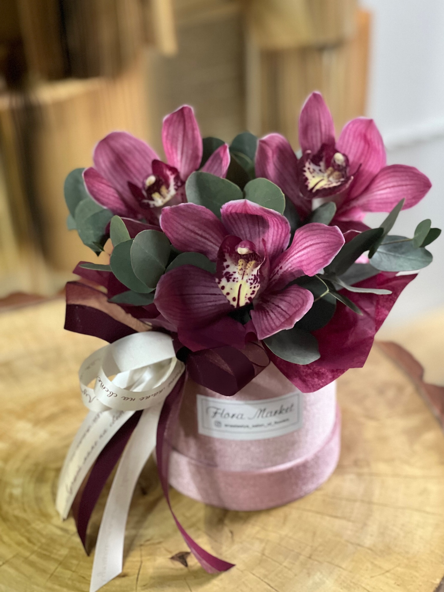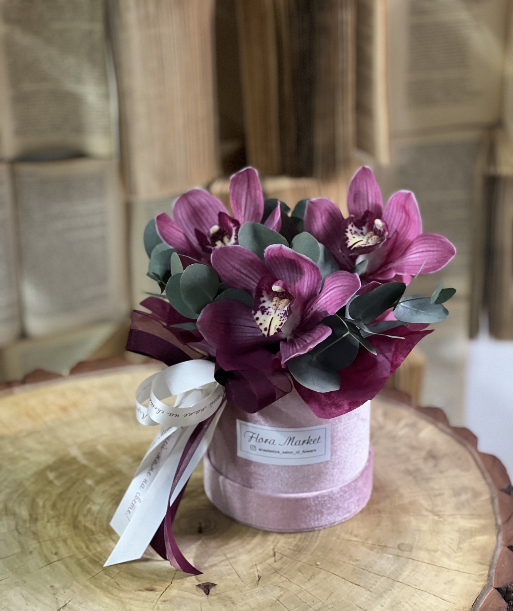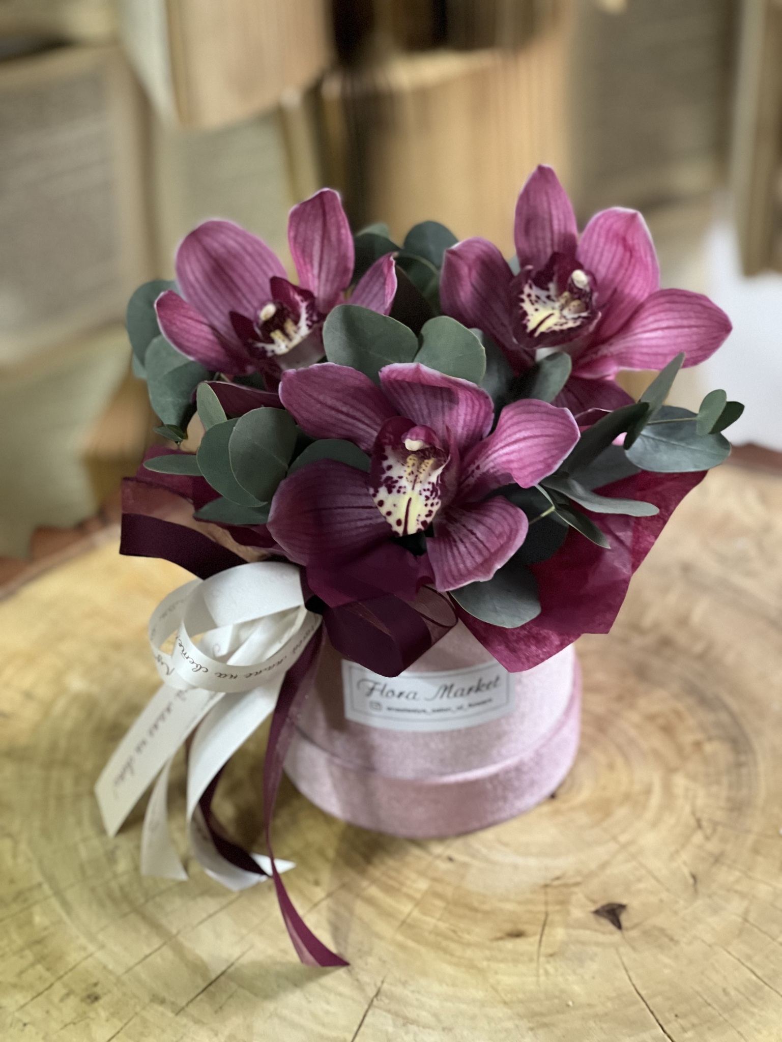 Орхидея Цимбидиум и эвкалипт в бархатной шляпной коробке.