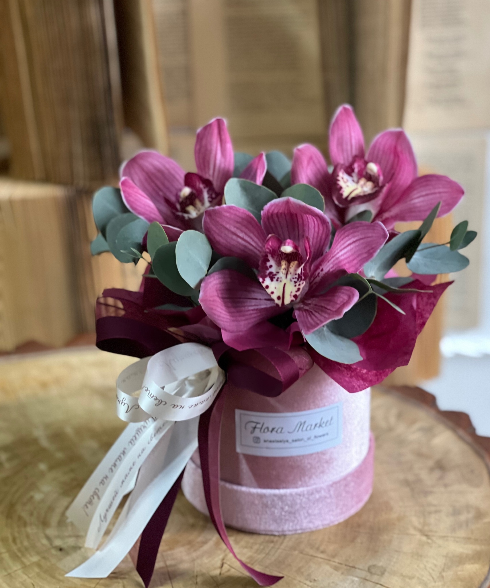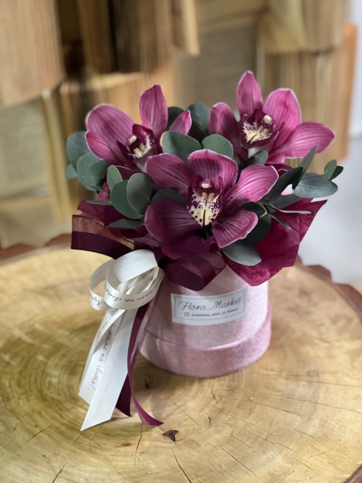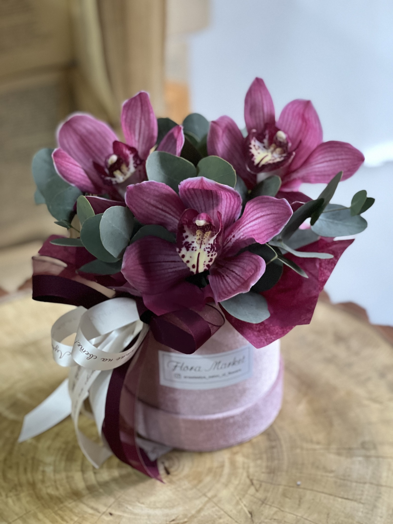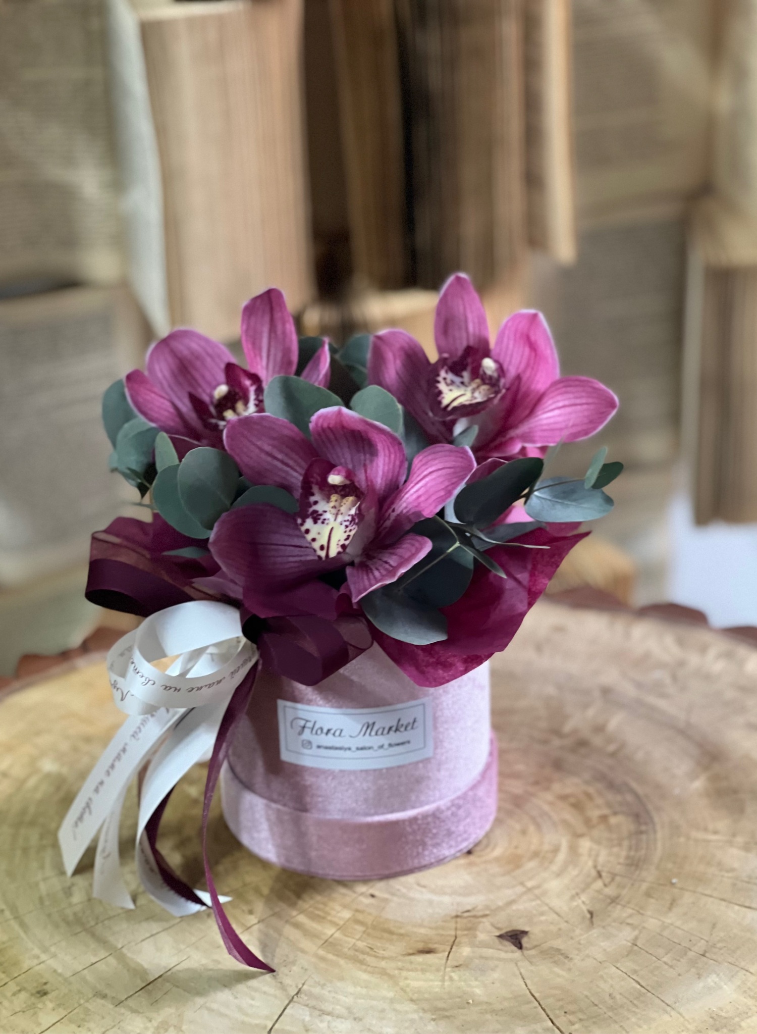 Орхидея Цимбидиум и эвкалипт в бархатной шляпной коробке.