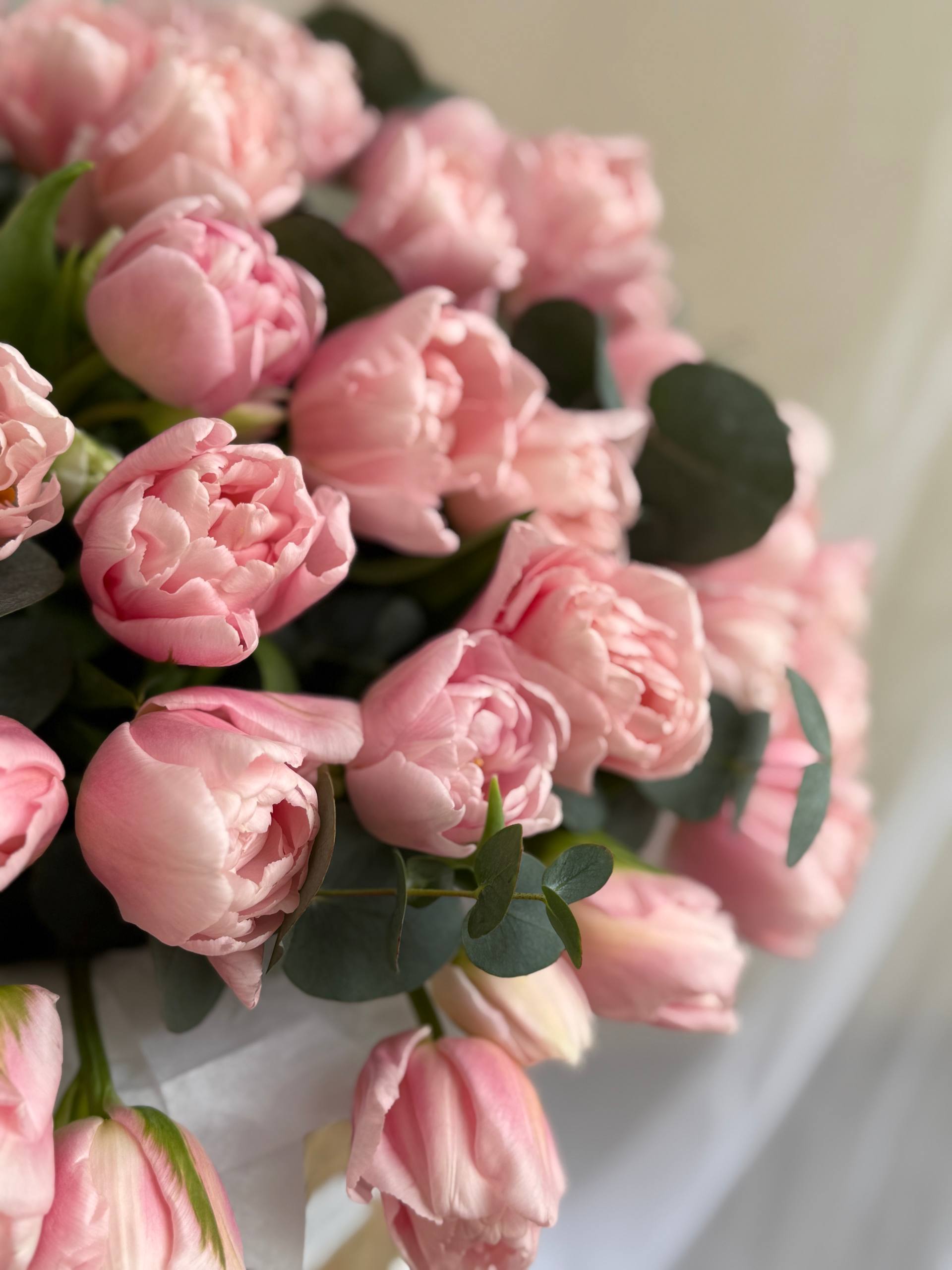 Нежные пионовидные тюльпаны премиального сорта в сочетании с ароматным эвкалиптом – воплощение весенней свежести и изысканности! Идеальный подарок на 8 Марта, способный тронуть сердце близких. Элегантная композиция от бренда "Флора Маркет" подчеркнет Ваше внимание к деталям и безупречный вкус.