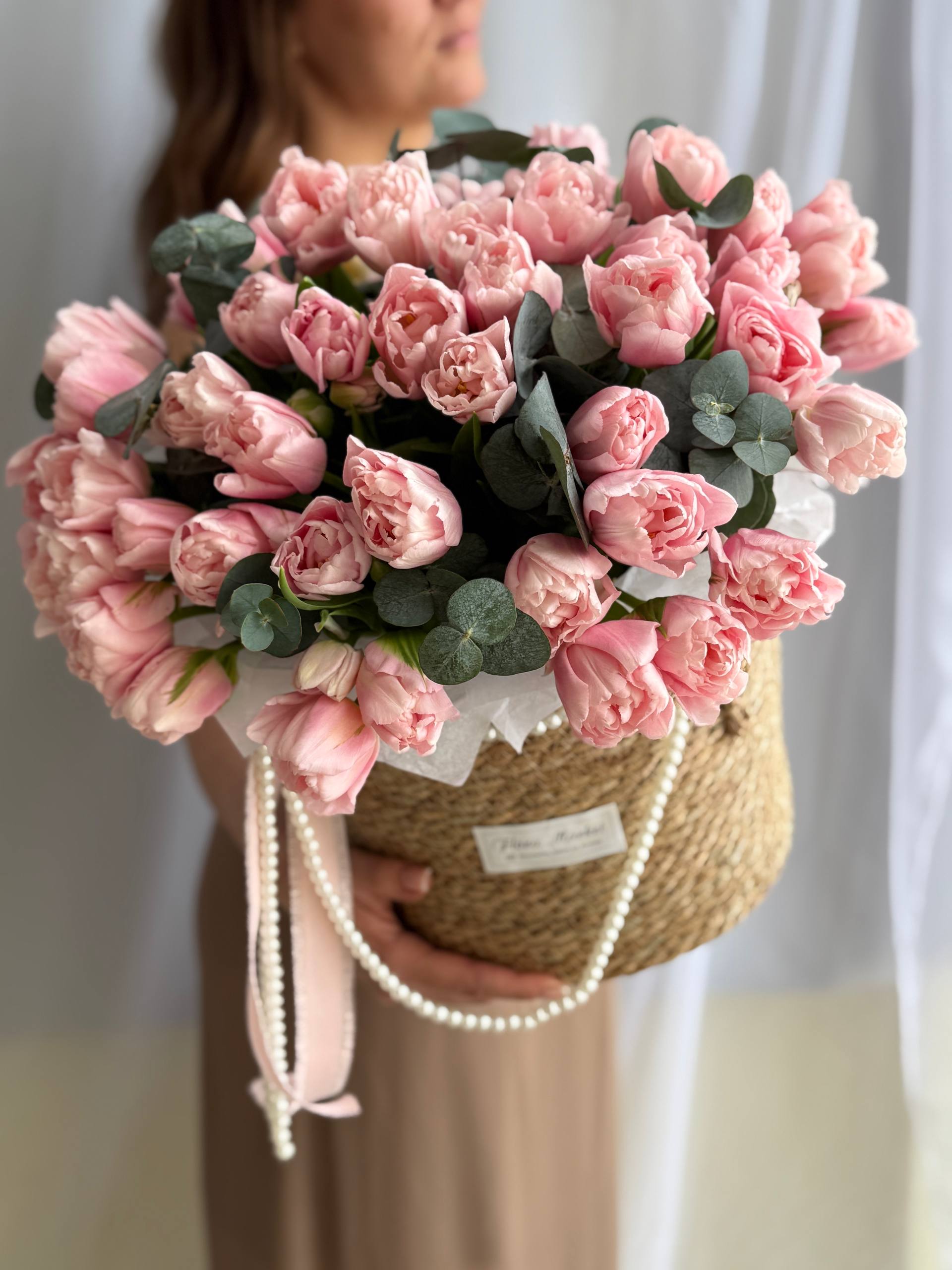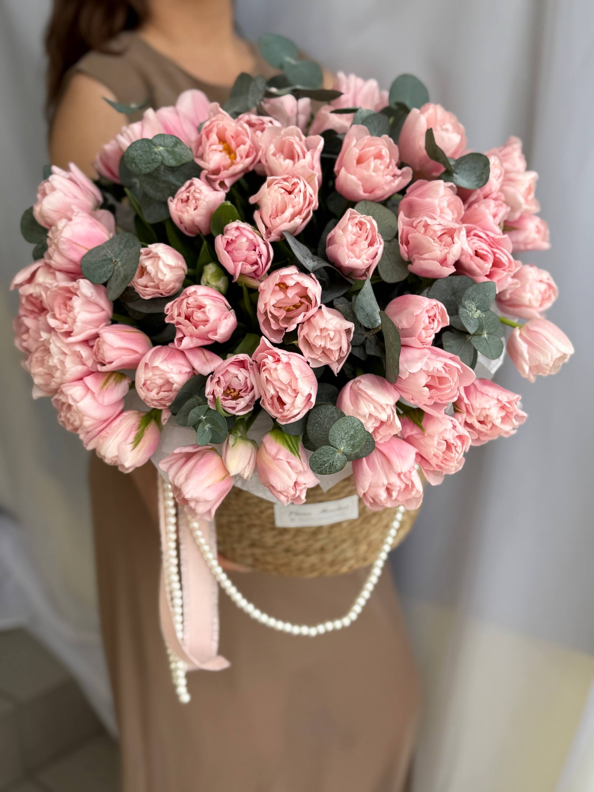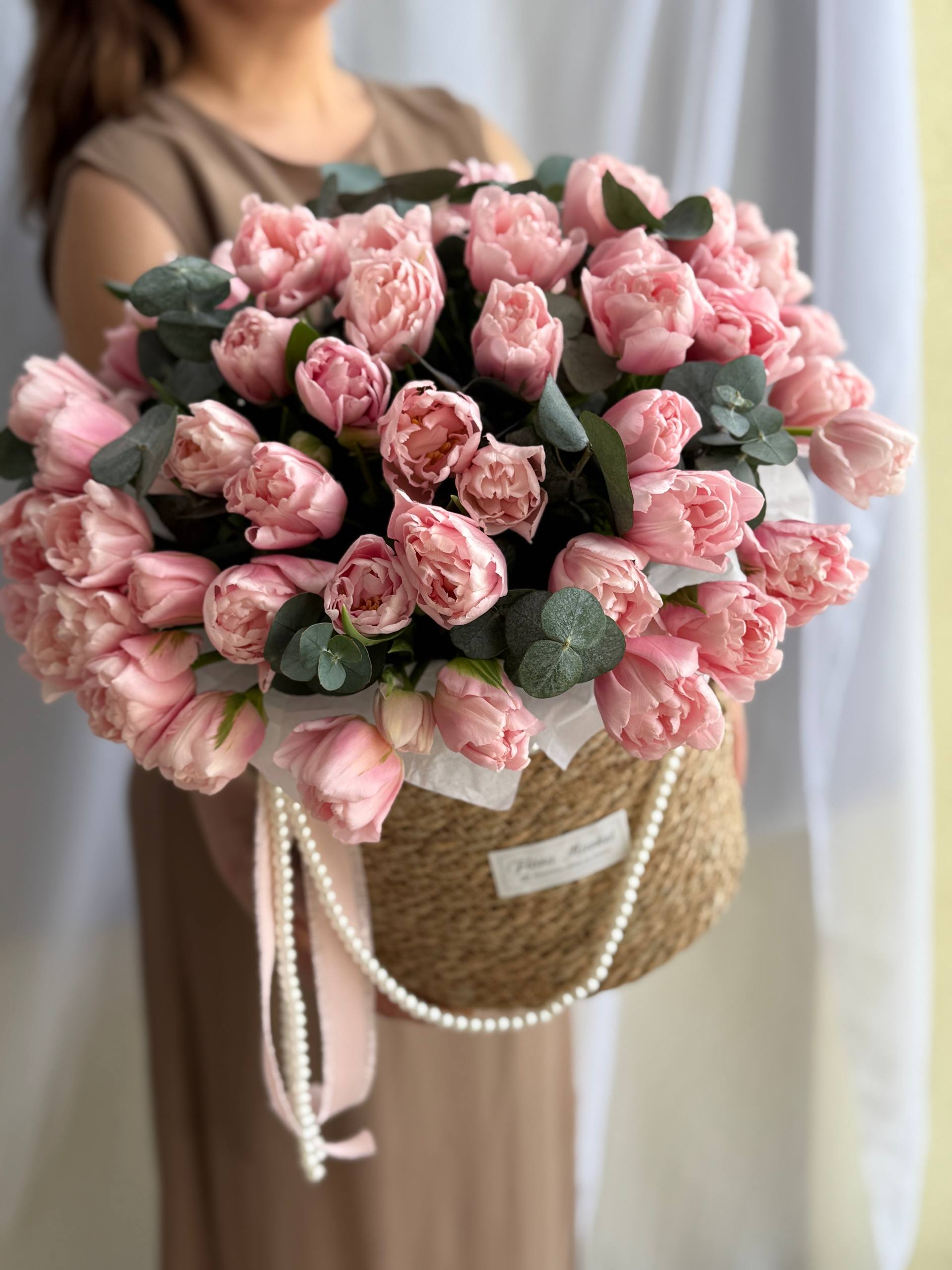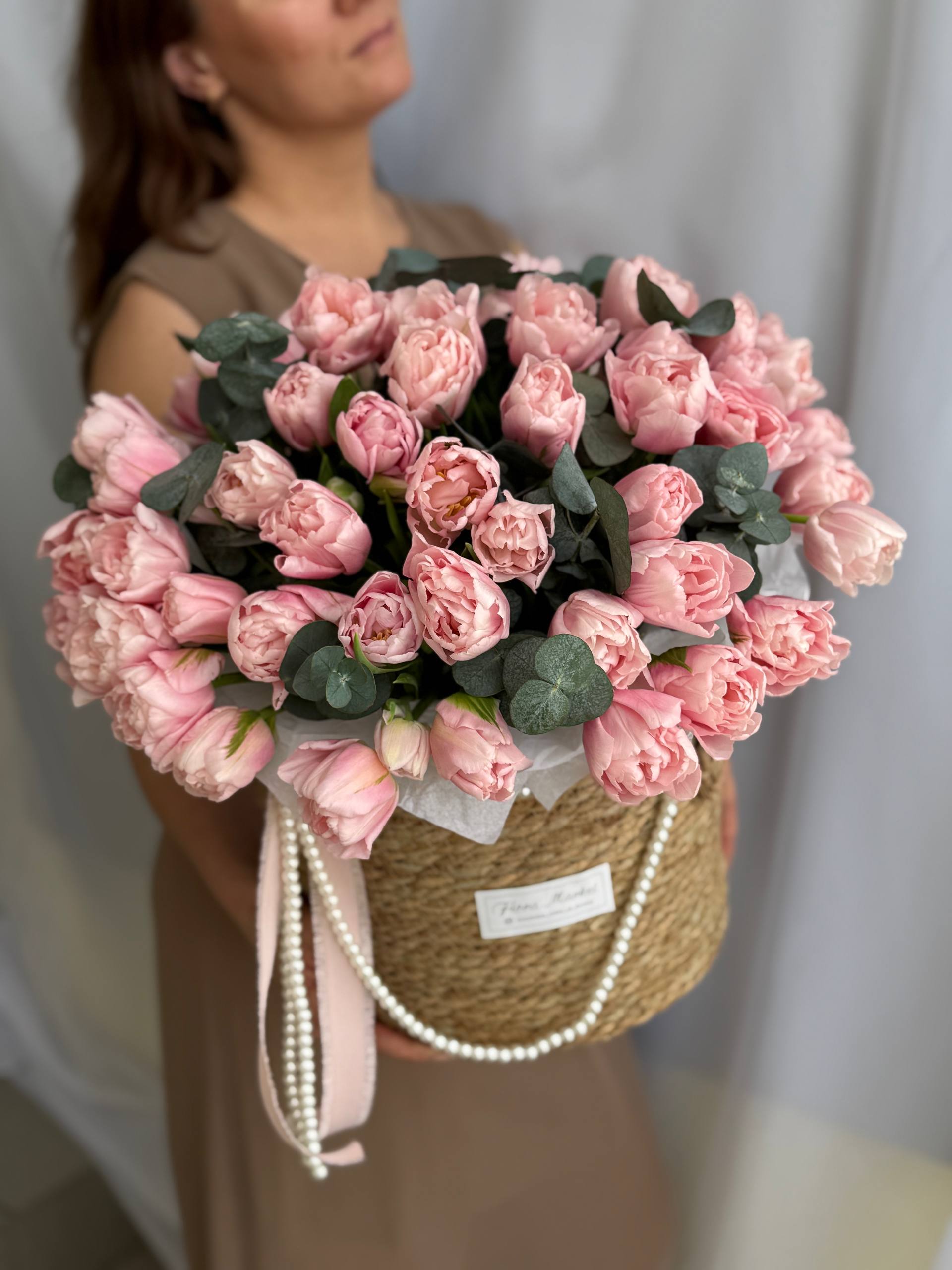 Пионовидные нежно-розовые тюльпаны премиум сорта и эвкалипт в элегантной корзине от Флора Маркет.