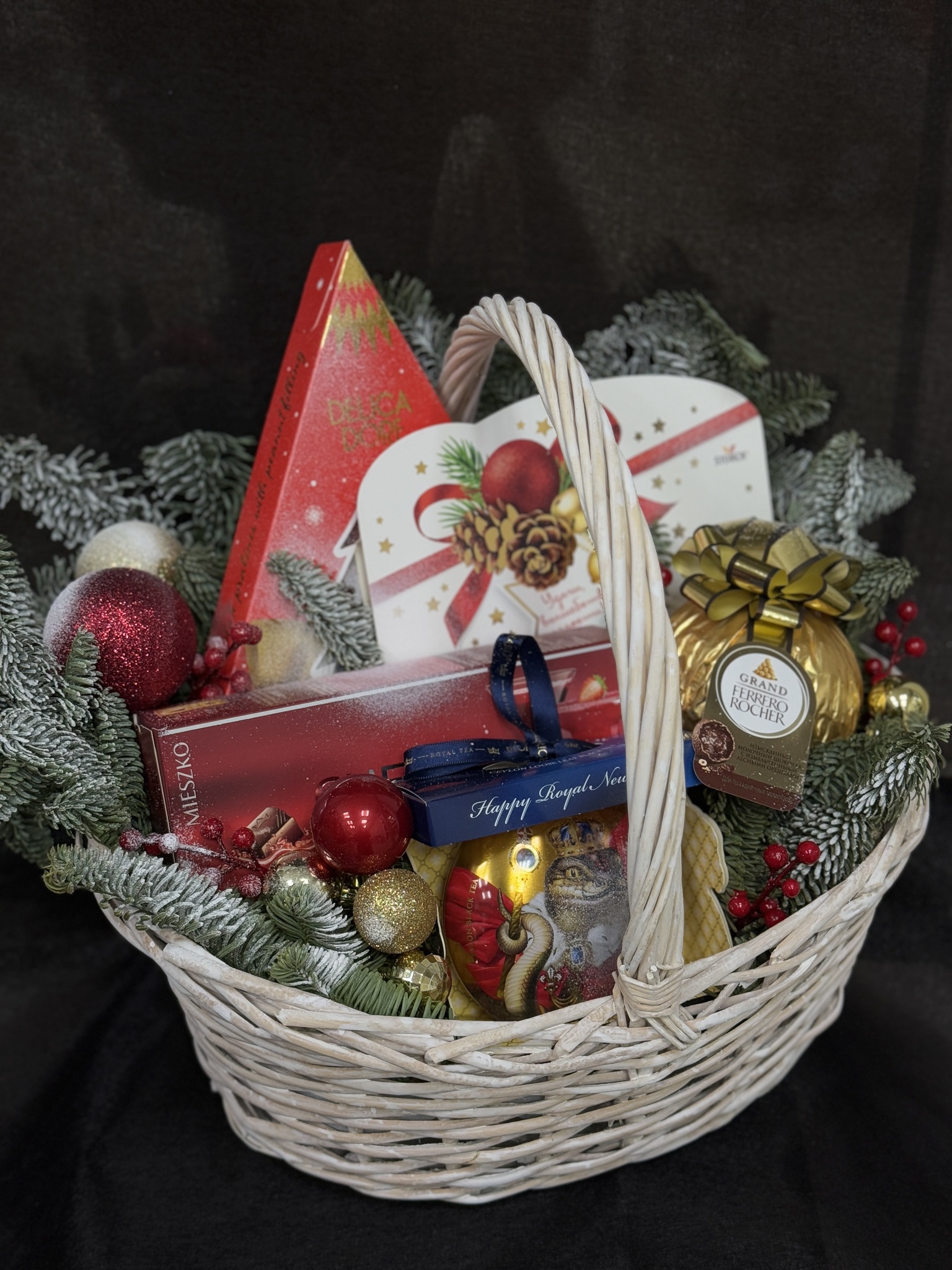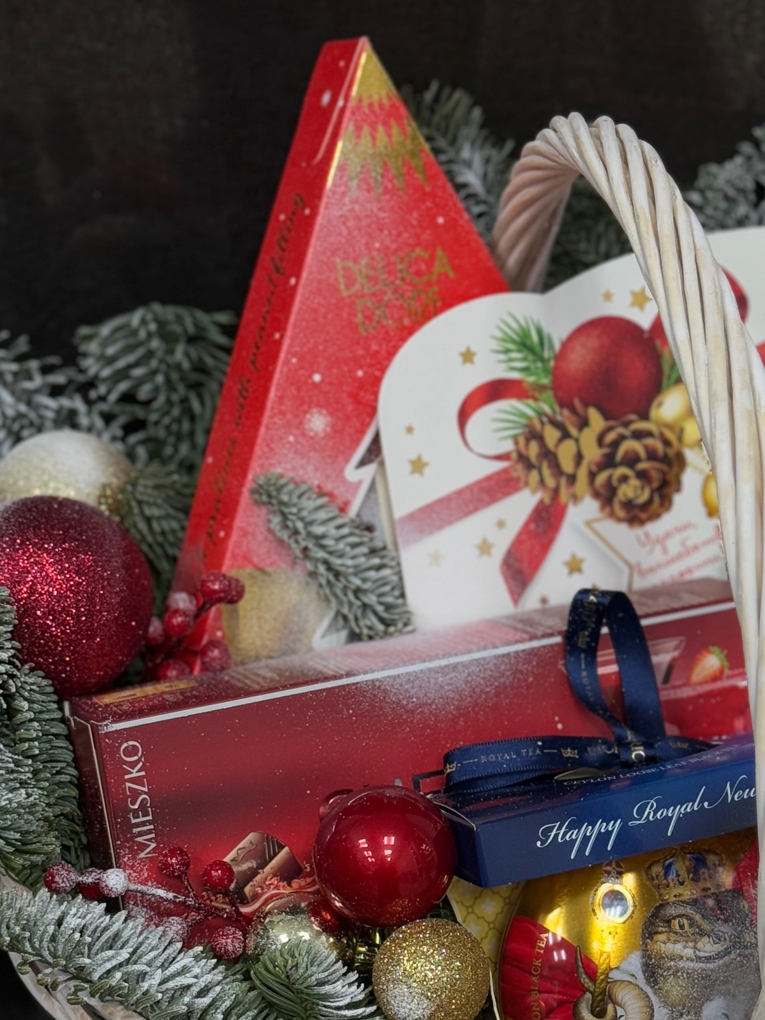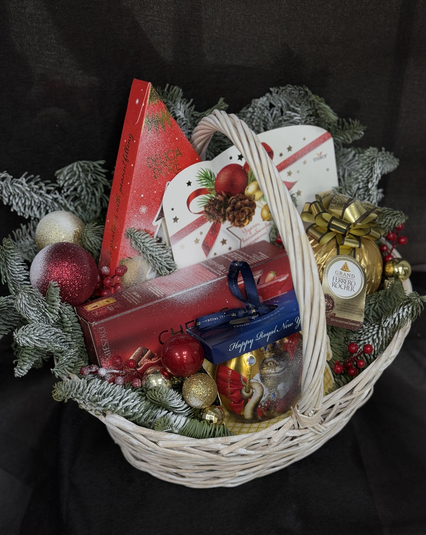 Погрузитесь в атмосферу праздника вместе с нашим подарочным набором! Он идеально подойдет для встречи Нового года и Рождества. Декорированная корзина сочетает элегантность ароматных веточек живого нобилиса и ярких елочных шаров – это красота природы и праздничного настроения в одном подарке. Внутри вас ждет наслаждение вкуснейшими конфетами и насыщенный чай, который согреет сердце каждого получателя. Этот подарок станет настоящей находкой среди суеты праздников, подчеркивая ваше внимание к деталям и стремление подарить радость близким, друзьям и коллегам.