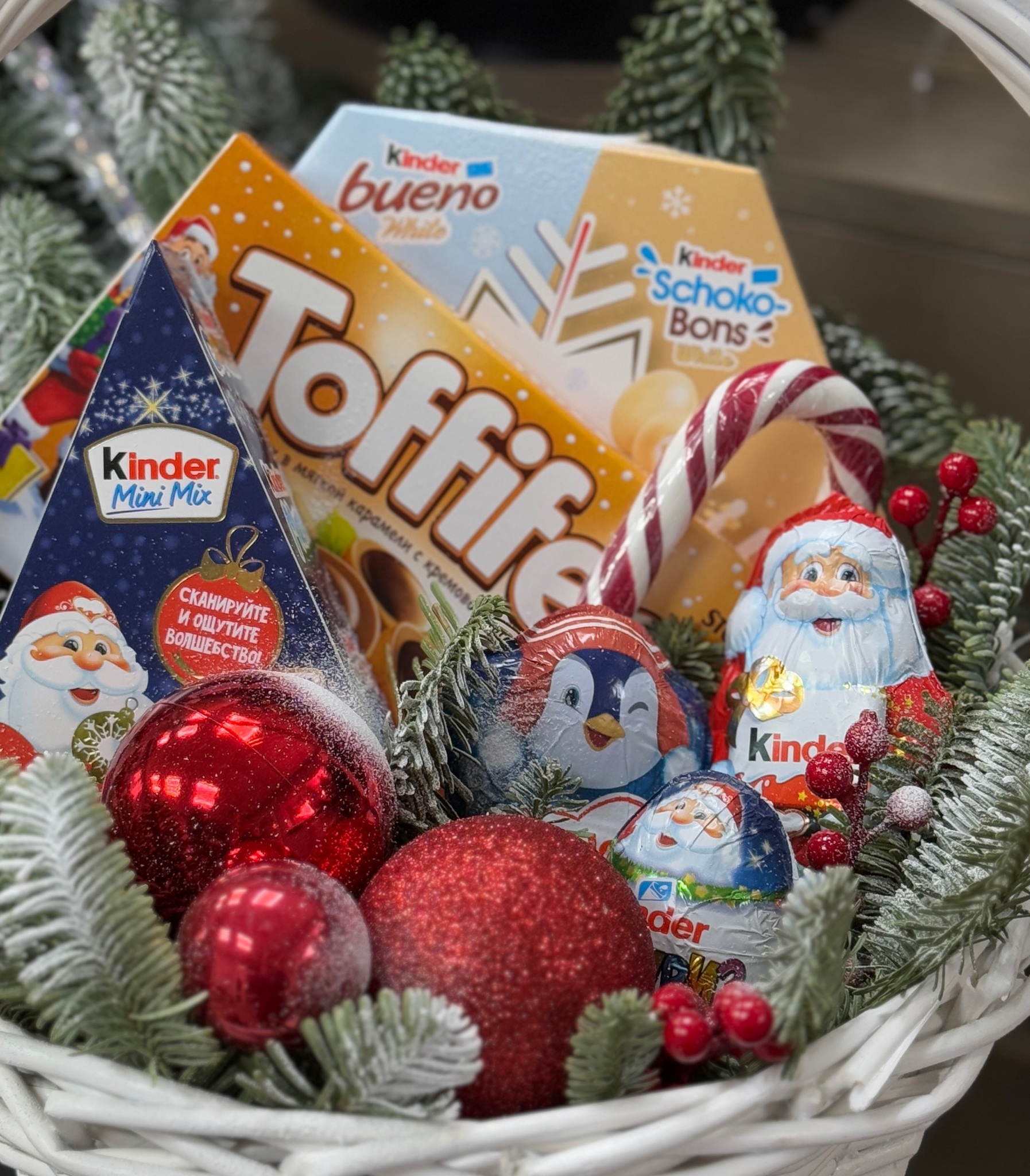 Подарочный сладкий набор конфет для детей и взрослых, декорированный пушистыми веточками живого нобилиса и яркими новогодними шарами.