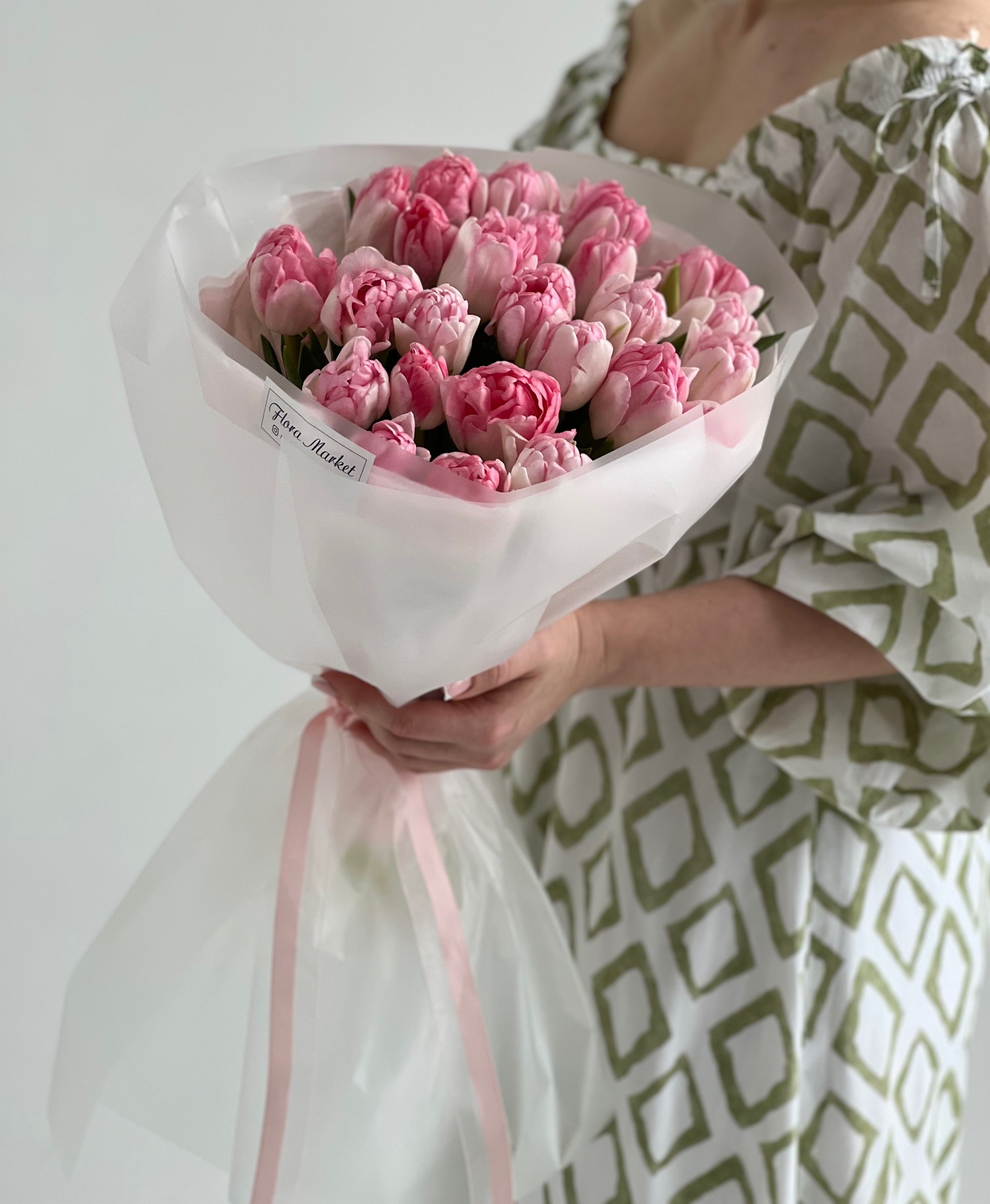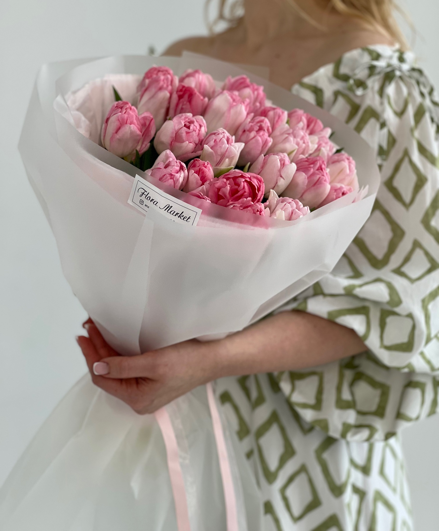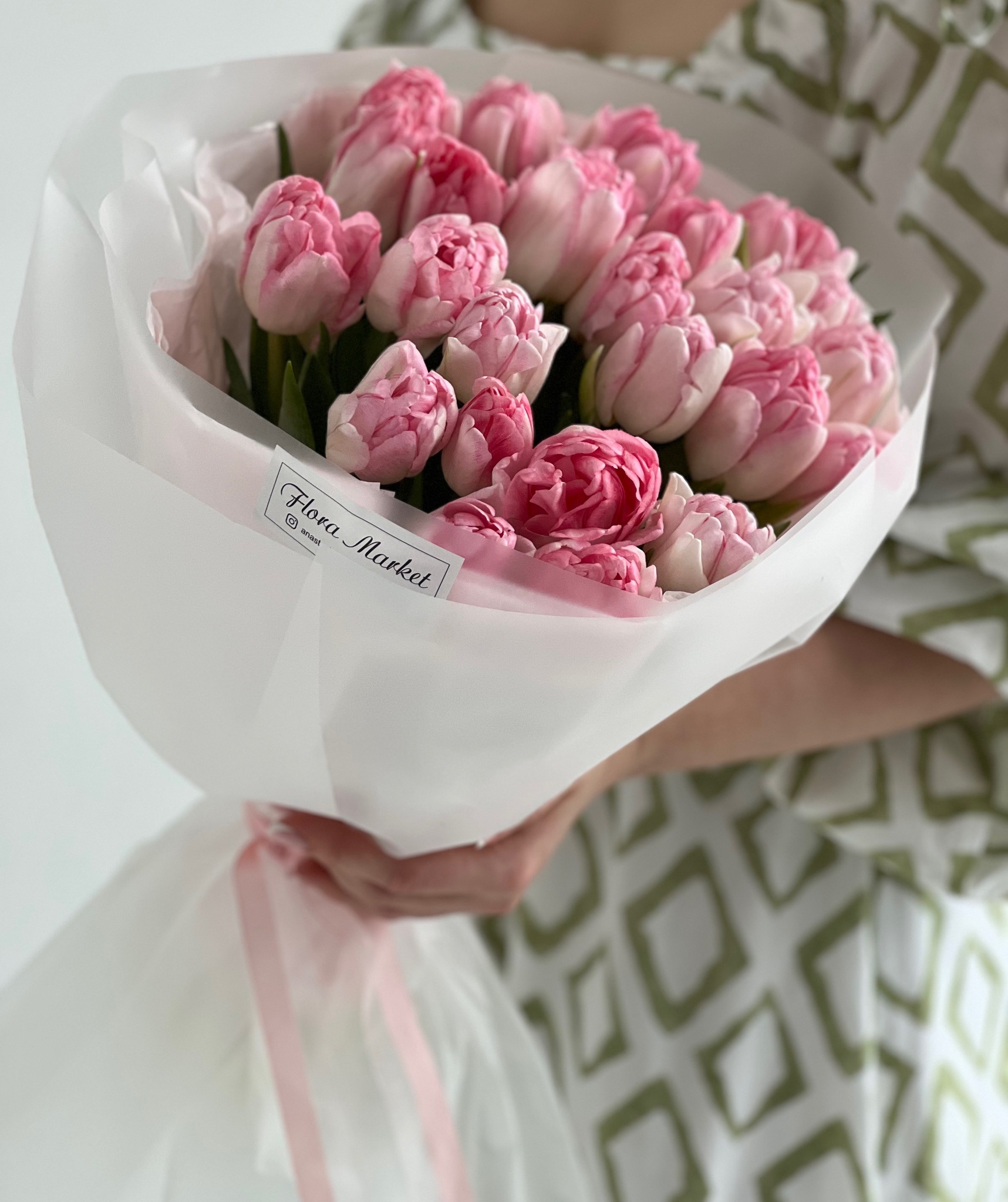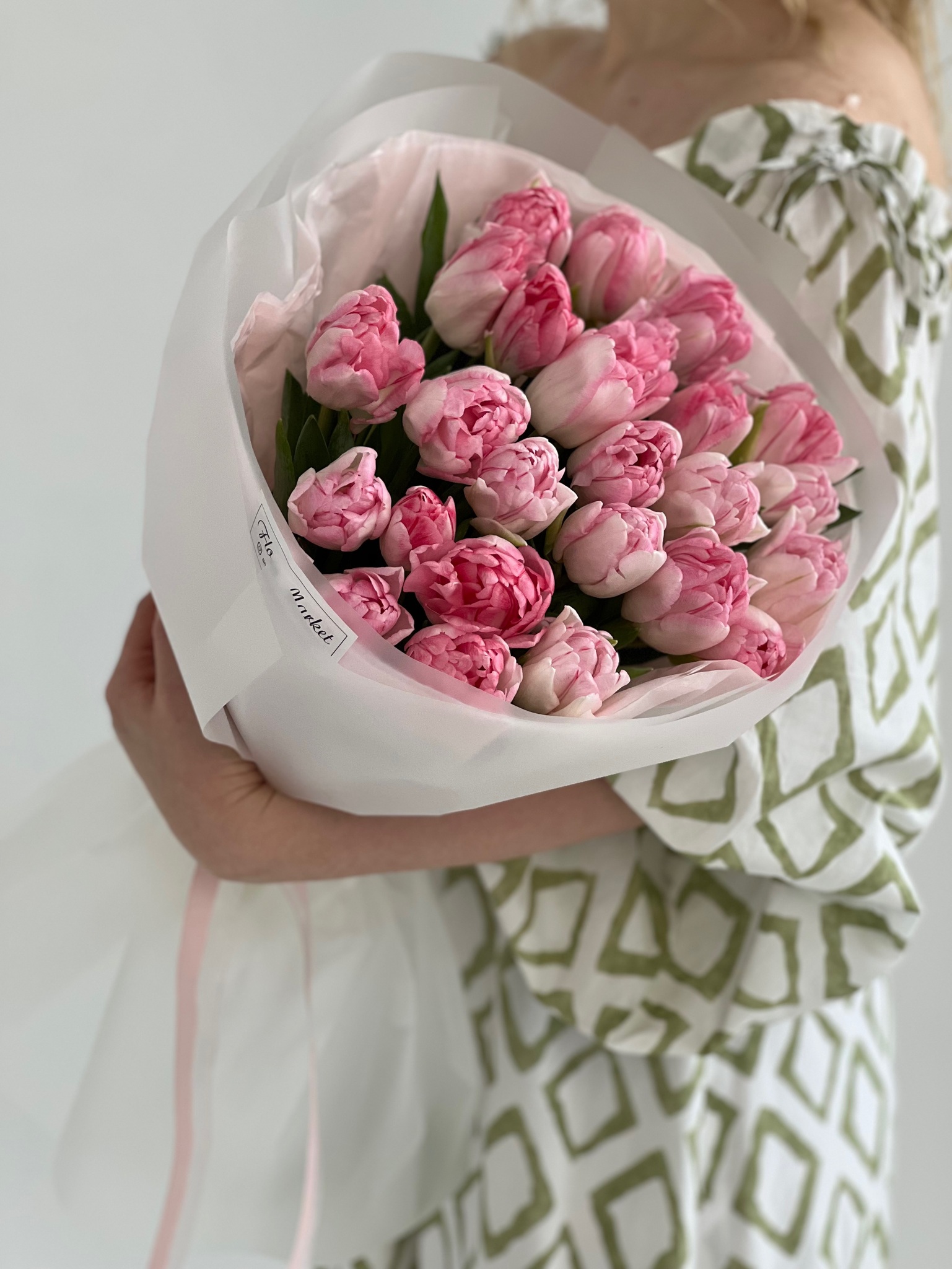Роскошные пионовидные тюльпаны нежно-розового оттенка в авторском оформлении от Флора Маркет.