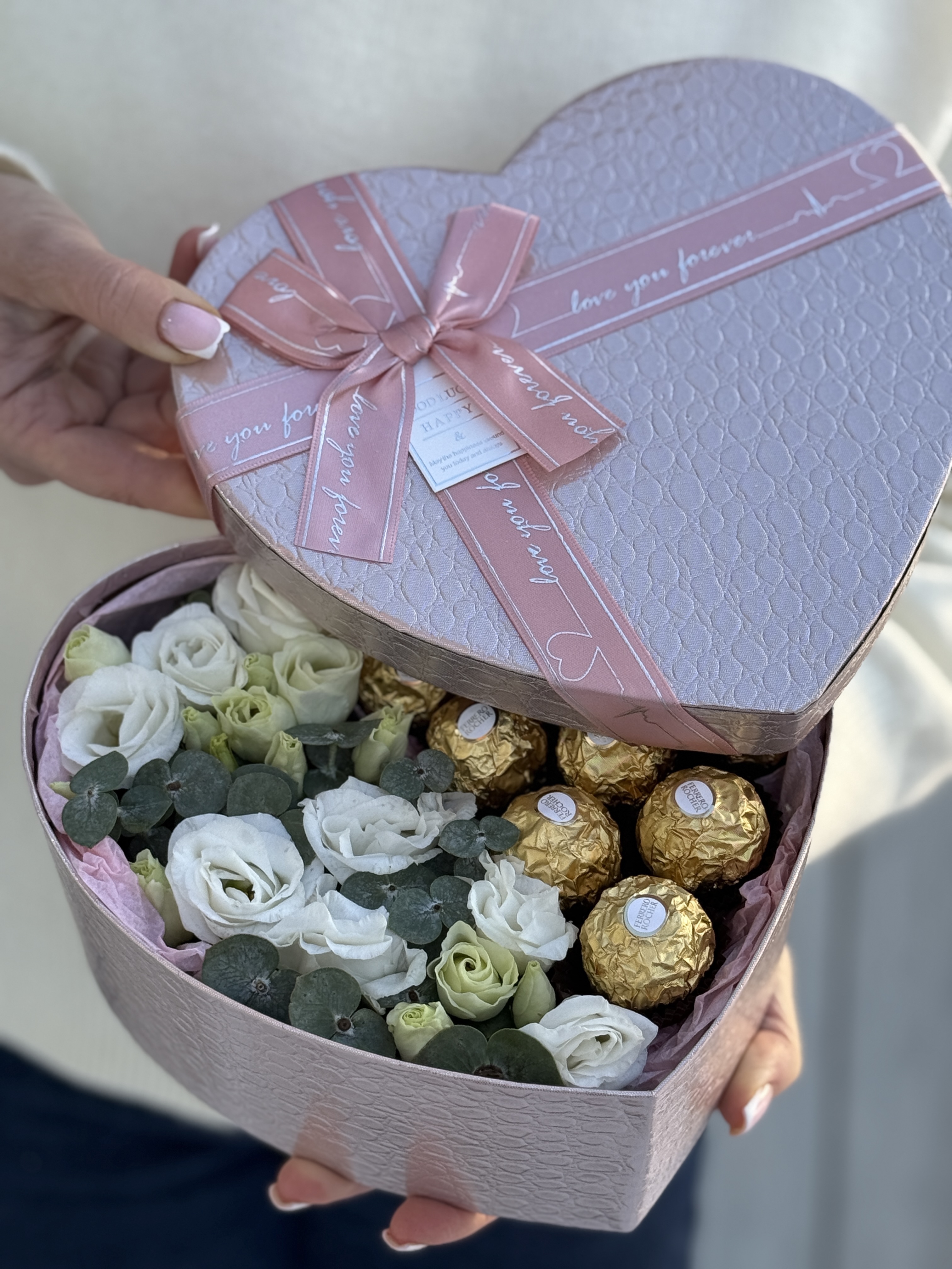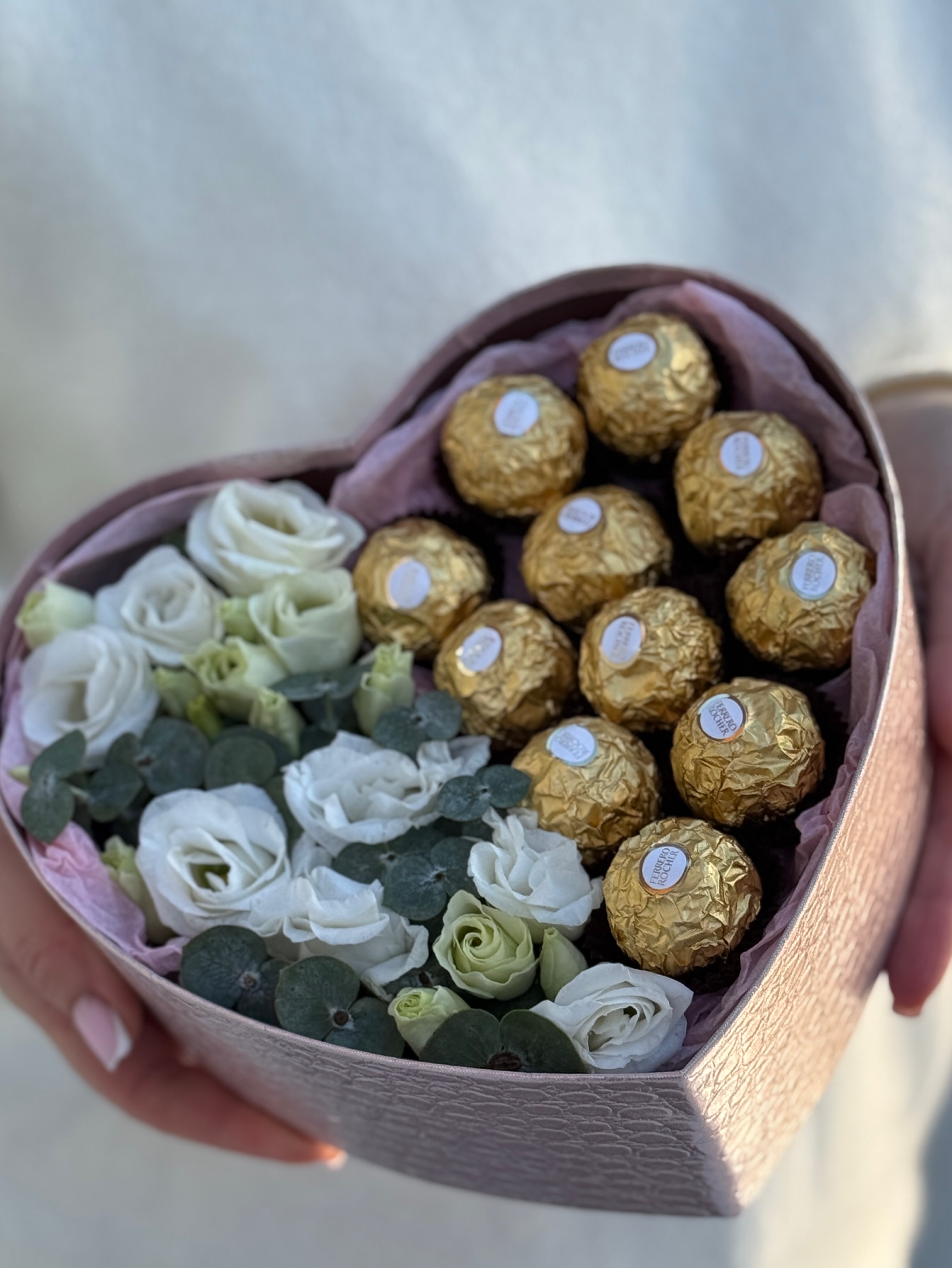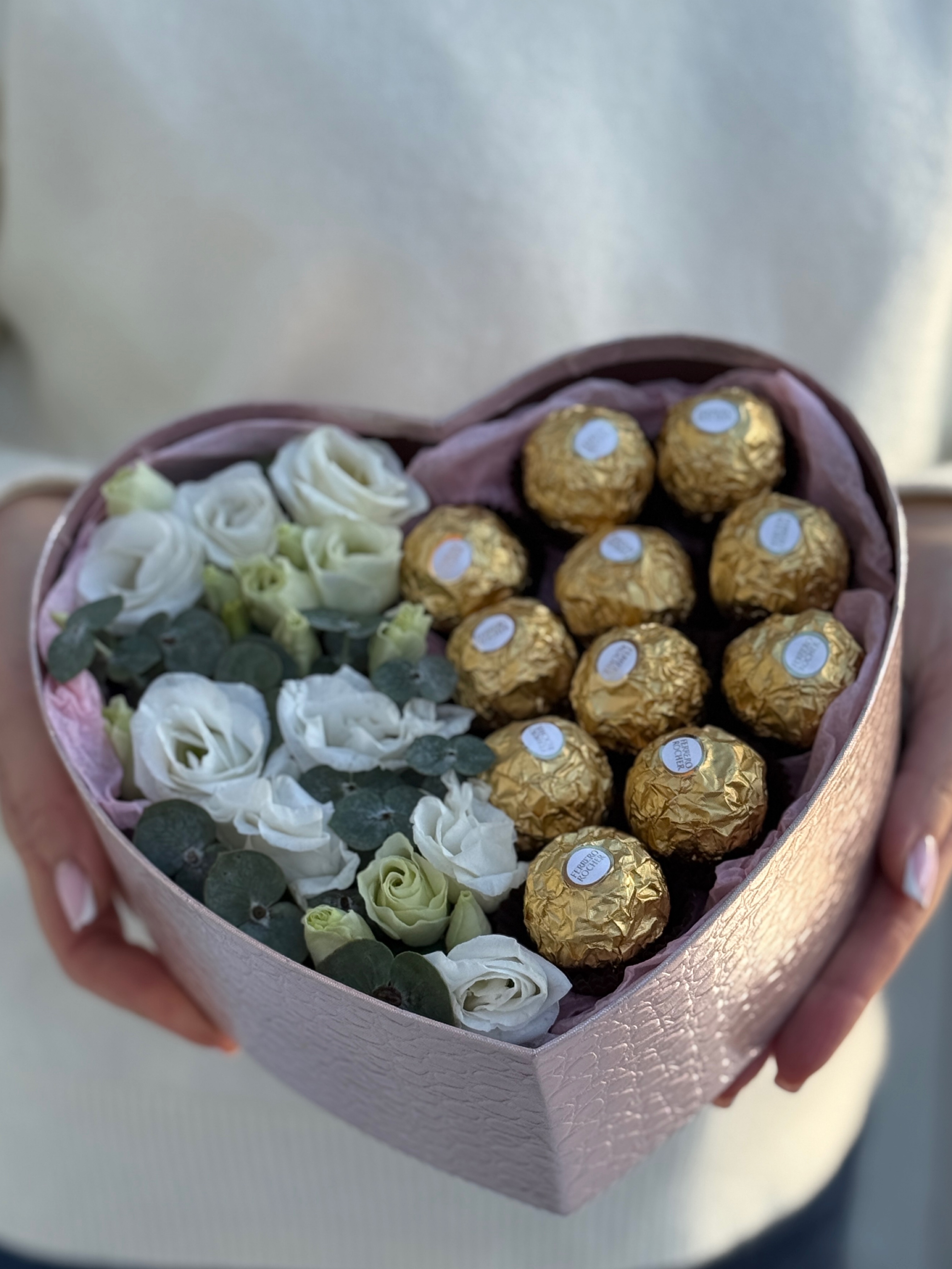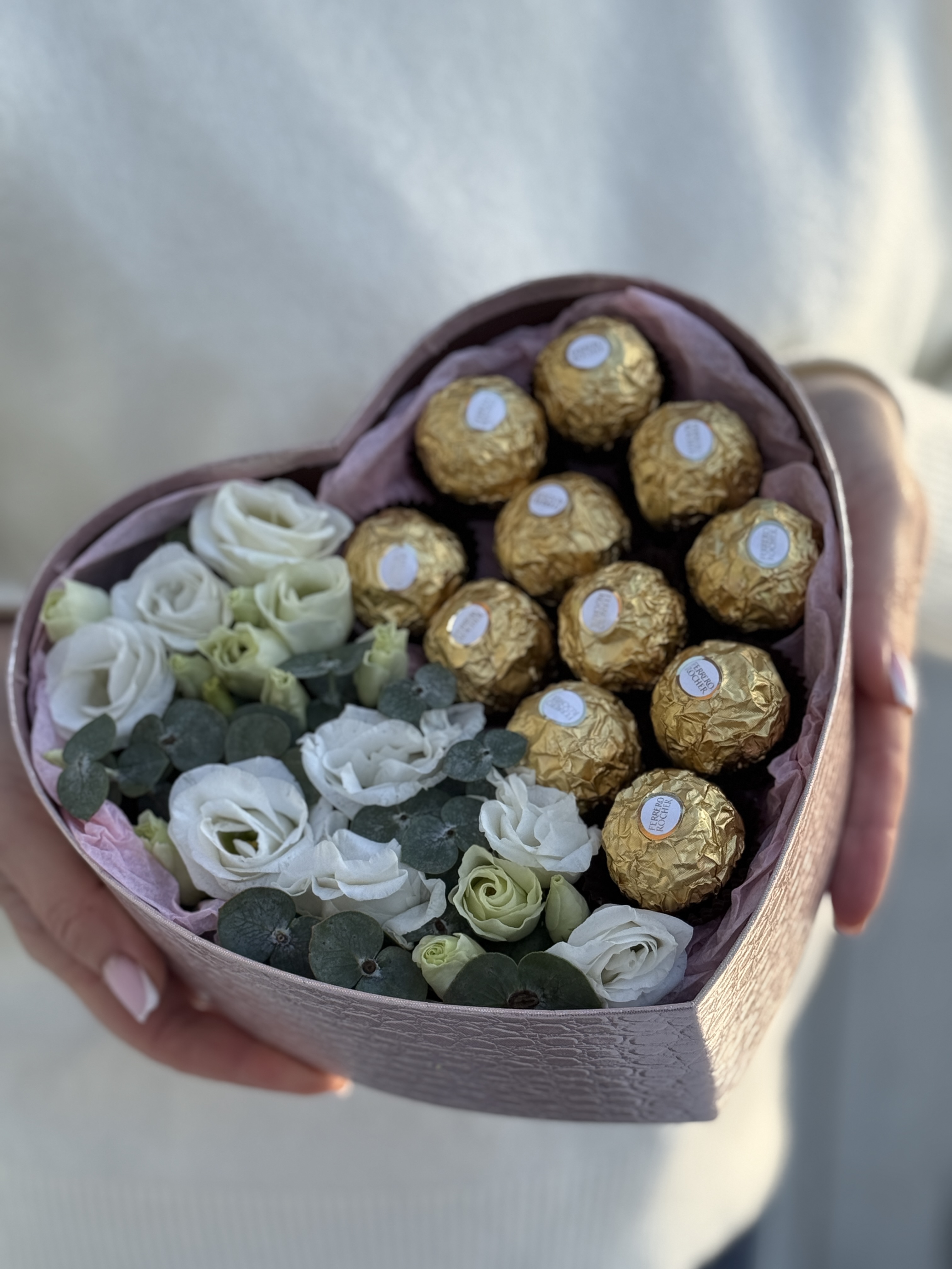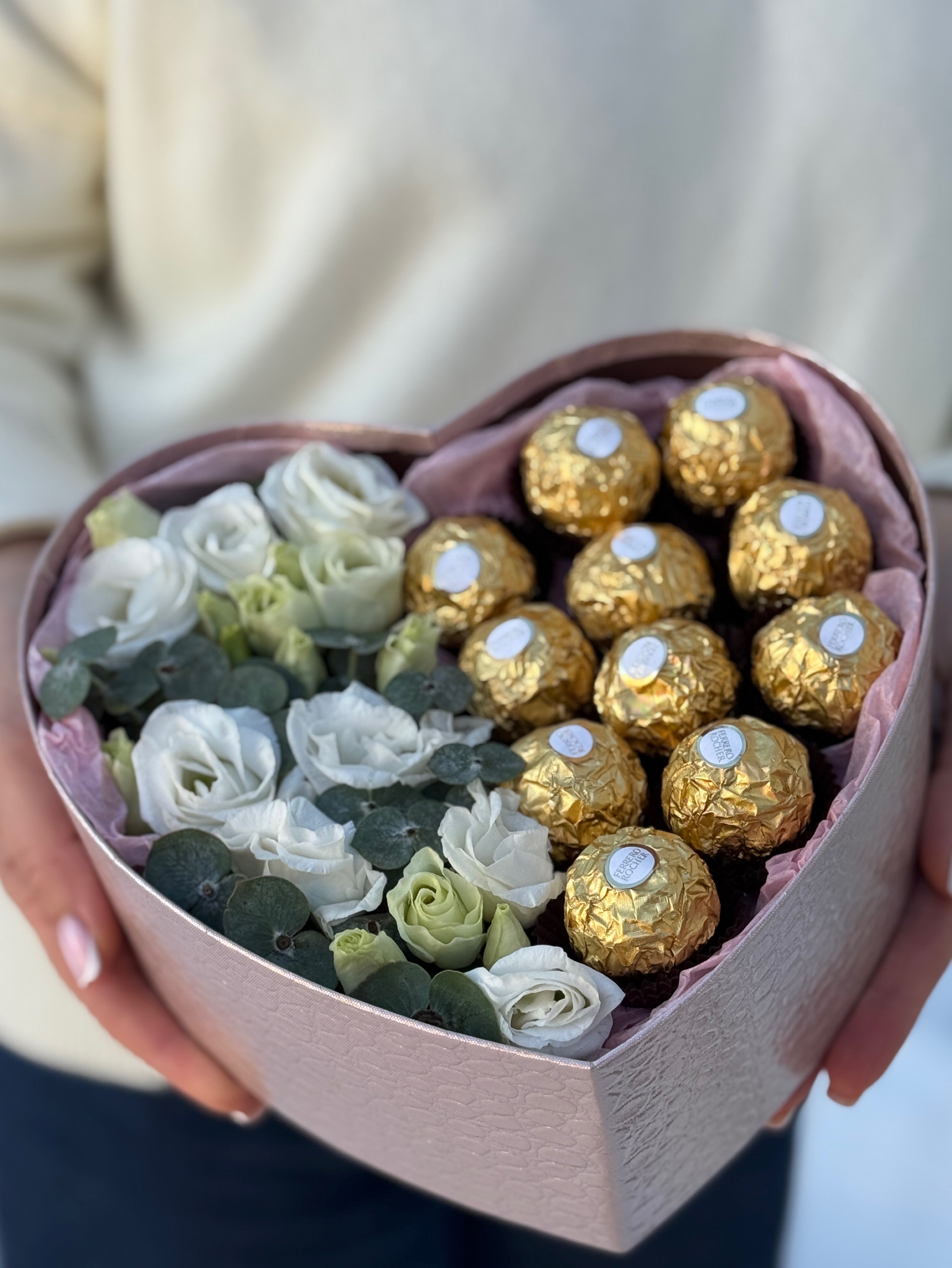 «Сердце» с лизиантусом, эвкалиптом и конфетами от Флора Маркет.