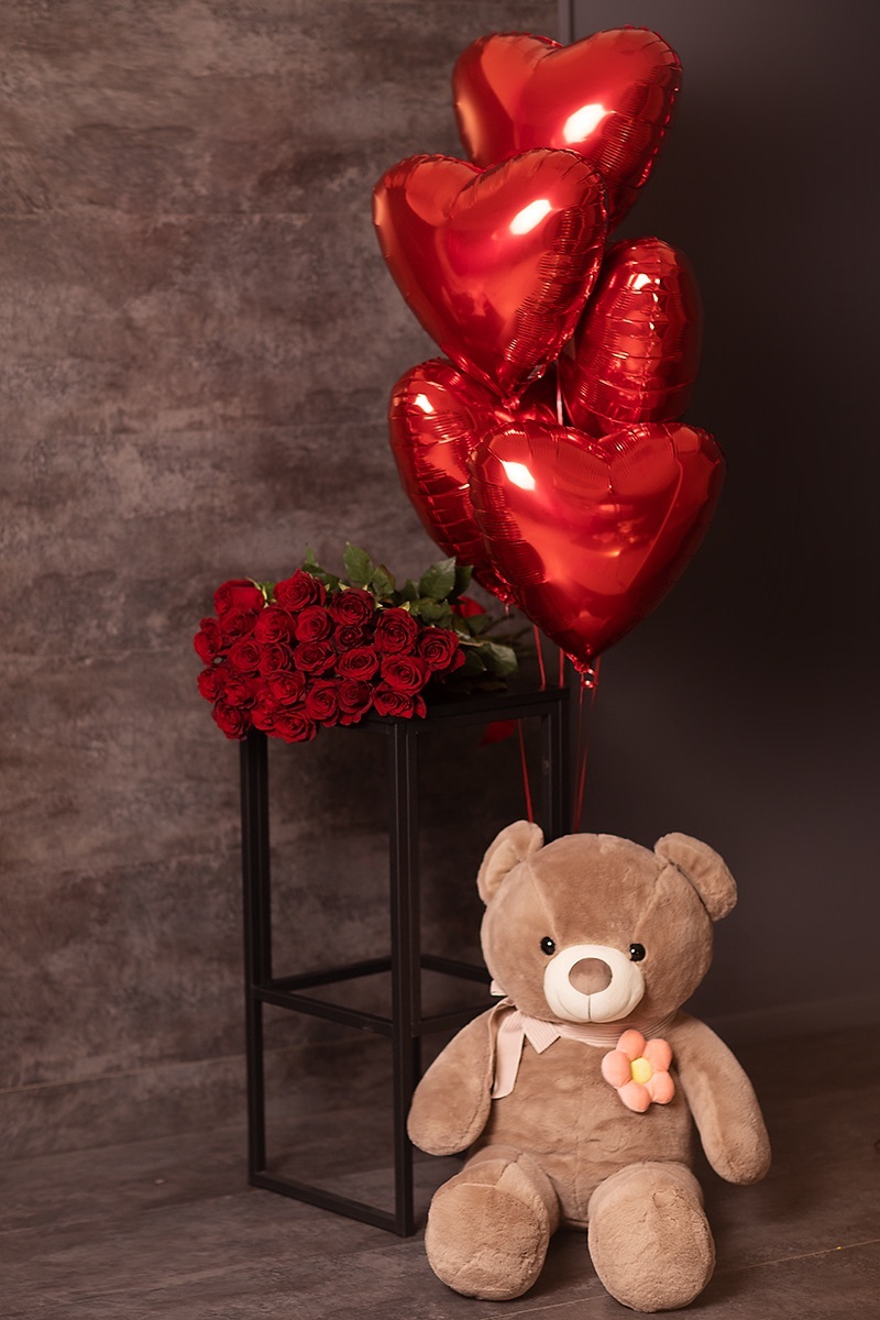 Флора Маркет представляет эксклюзивный сет «Красные розы премиум сорта, охапка шаров и огромный мягкий медведь». Этот роскошный набор создан для того, чтобы выразить самые глубокие чувства к вашей избраннице. Красные розы – символ страсти и любви, они украсят любое событие и создадут атмосферу романтики. Охапка воздушных шаров добавит легкость и игривость моменту, а огромный плюшевый мишка станет трогательным напоминанием о ваших теплых чувствах. Подарите эту симфонию любви своей любимой!