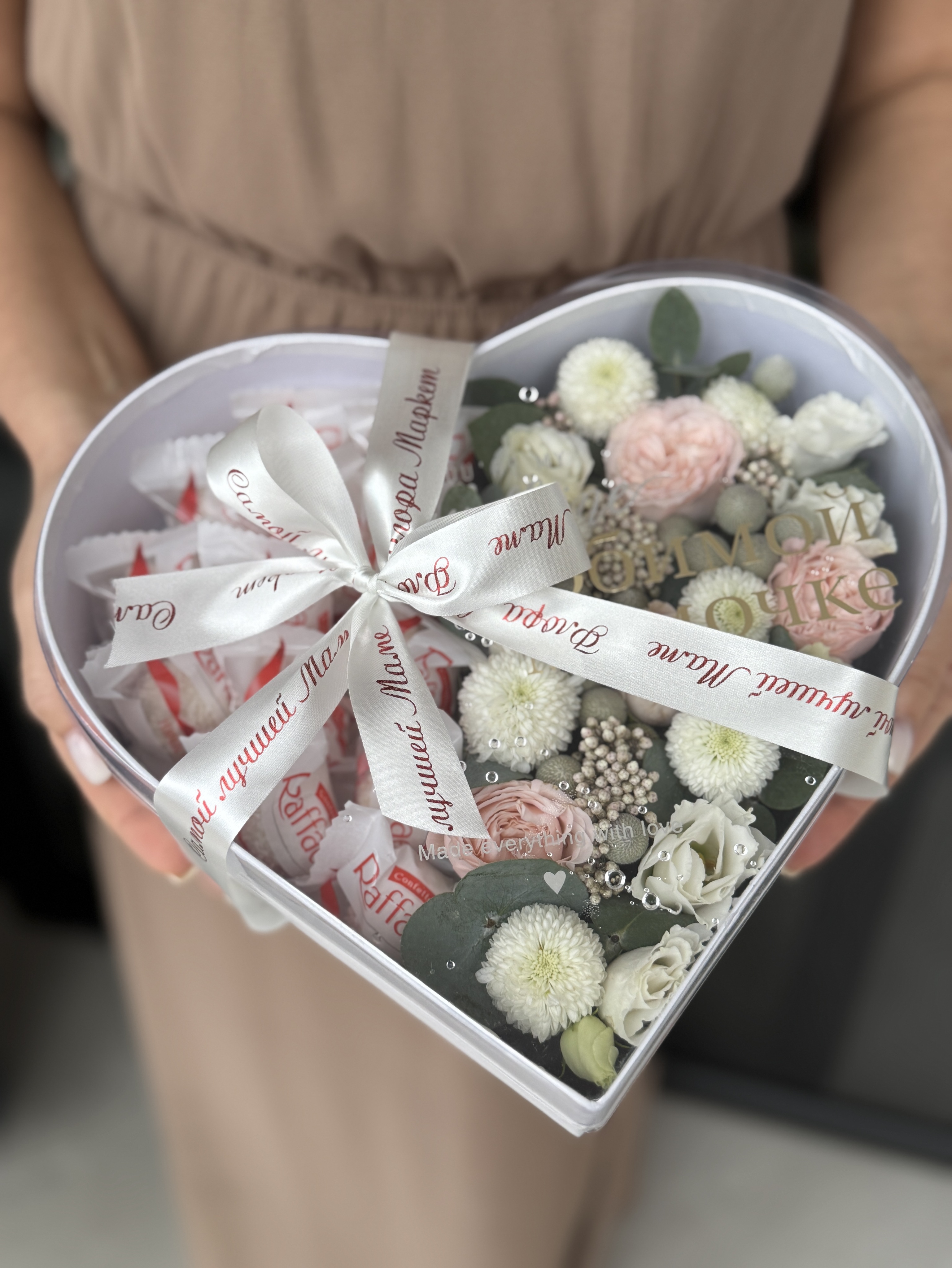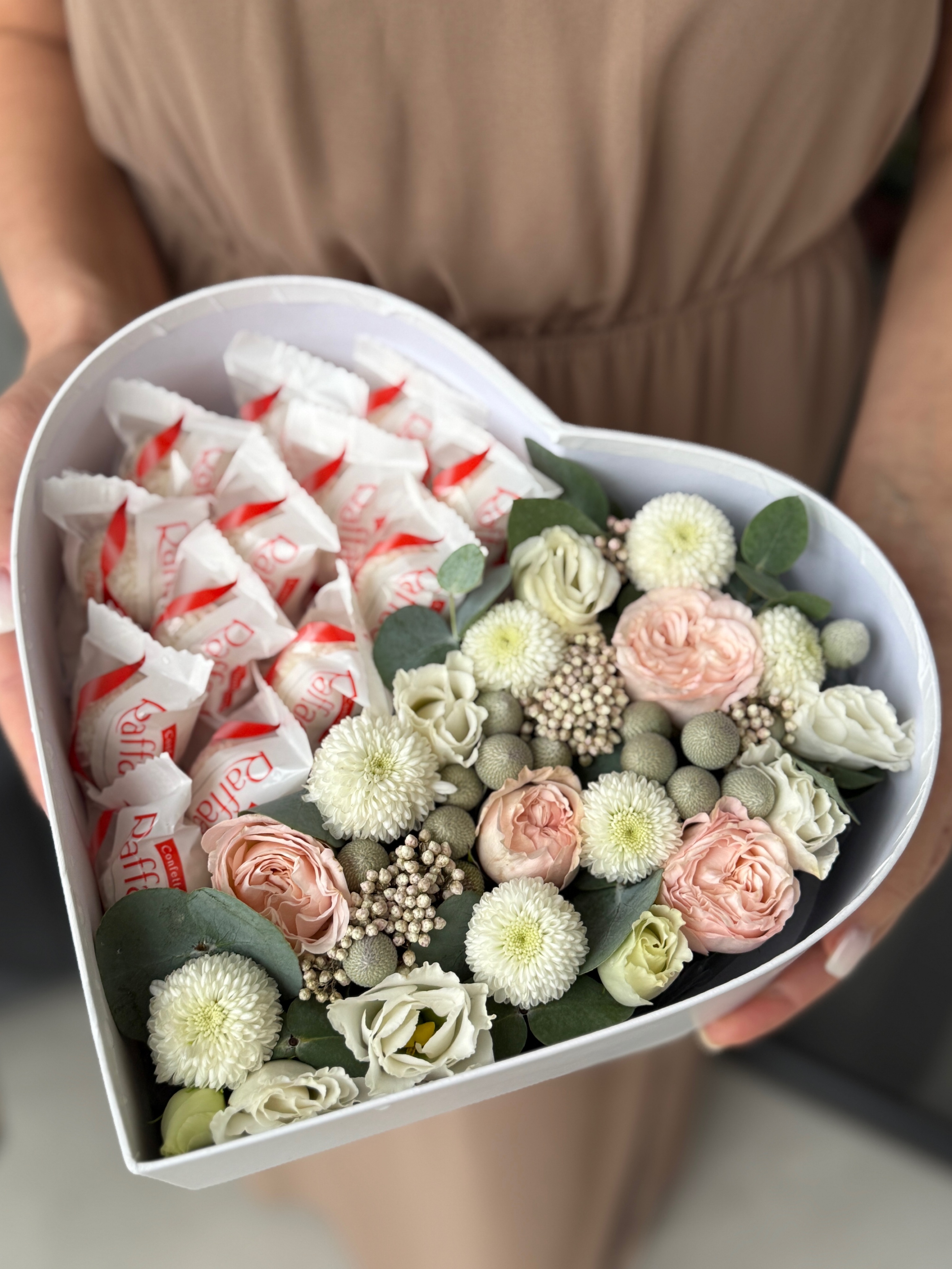 Цветочный подарок, который скажет маме о ваших чувствах без лишних слов. Нежная композиция в шляпной коробке в форме сердца — идеальное сочетание сезонных цветов и любимых конфет Raffaello: мягкие пастельные оттенки, утонченные лепестки розы, эустомы и воздушных хризантем в окружении благородной зелени плавно переходят в ряд изящных сладких акцентов. Каждая деталь этой композиции подобрана флористом с заботой и теплом специально для мамы — чтобы подарить ей улыбку, уют и немного сладкого настроения.