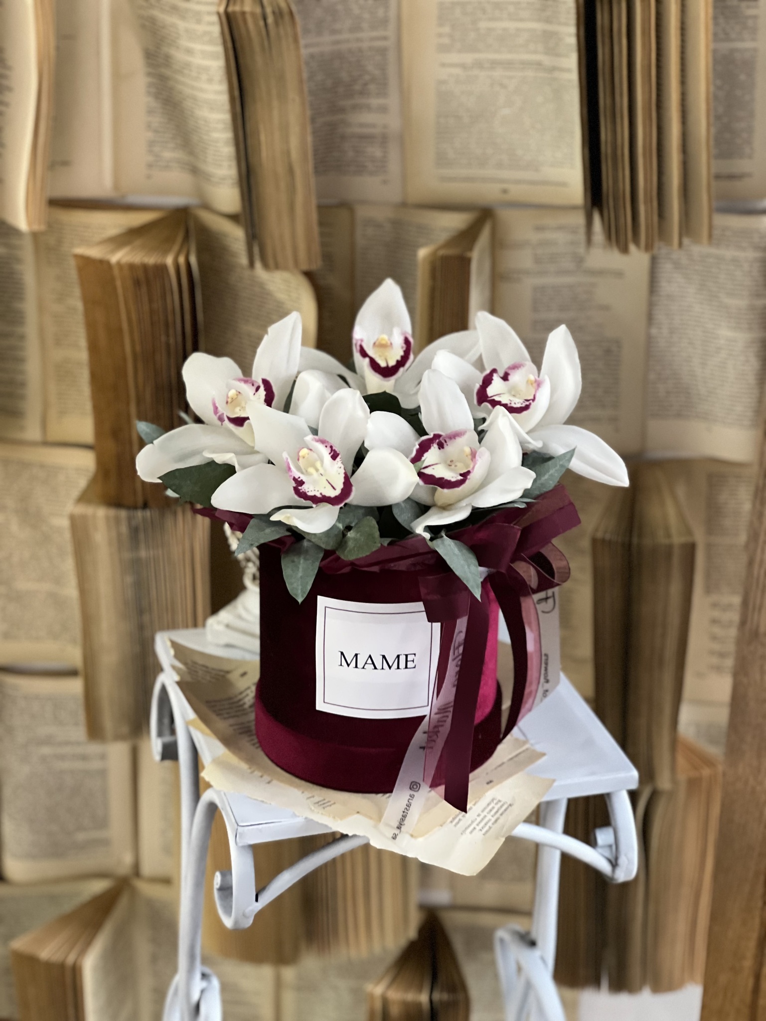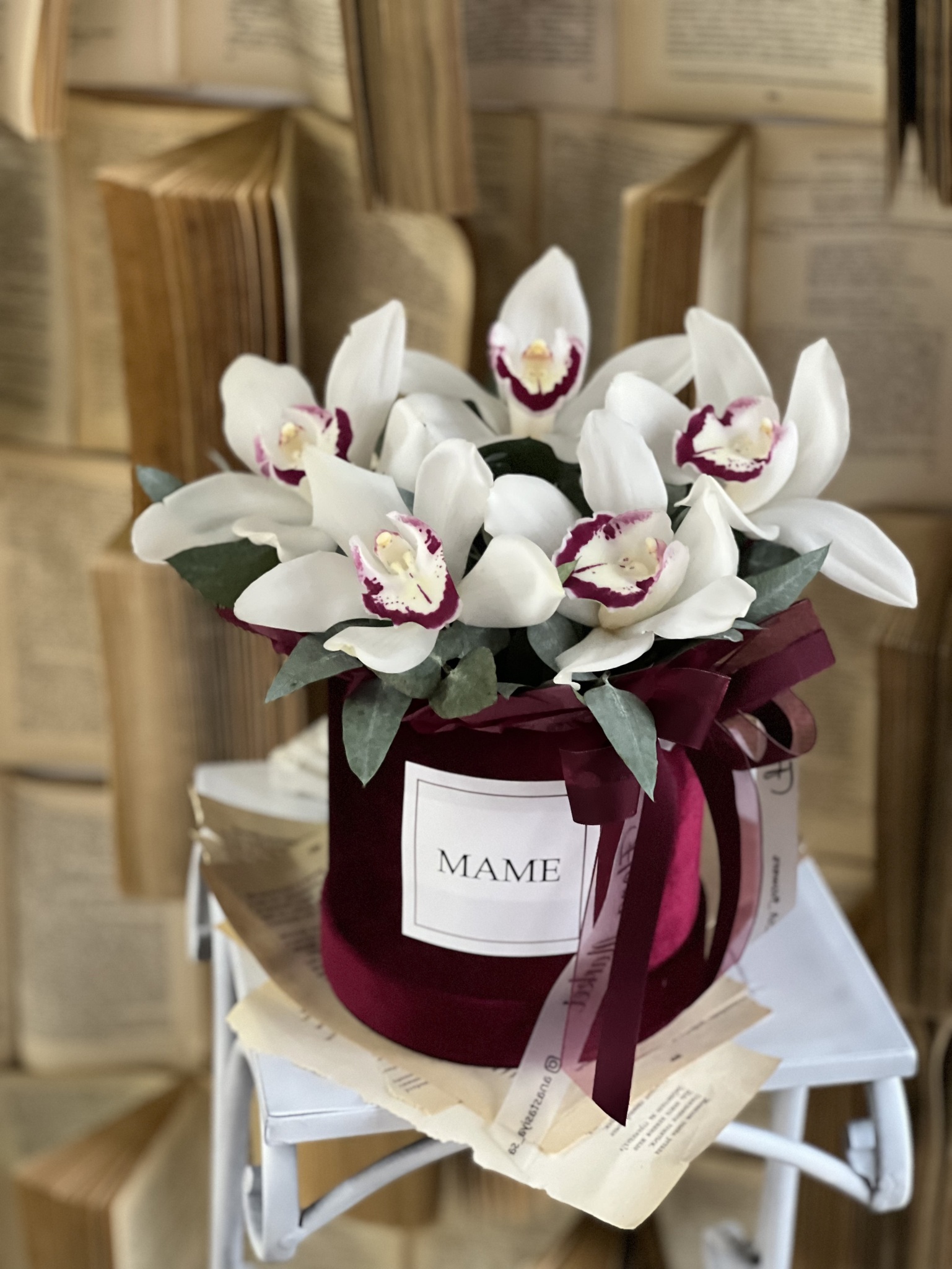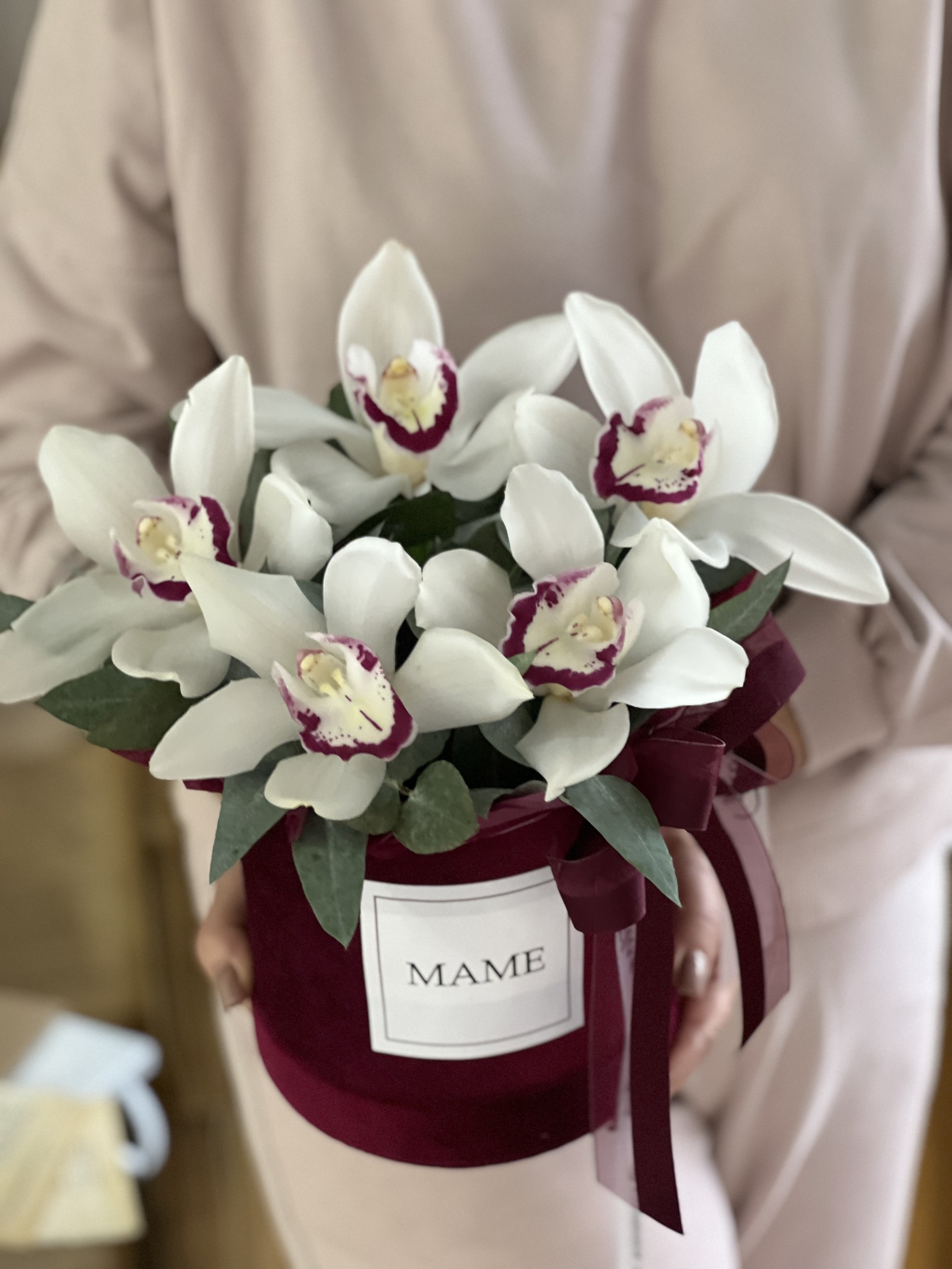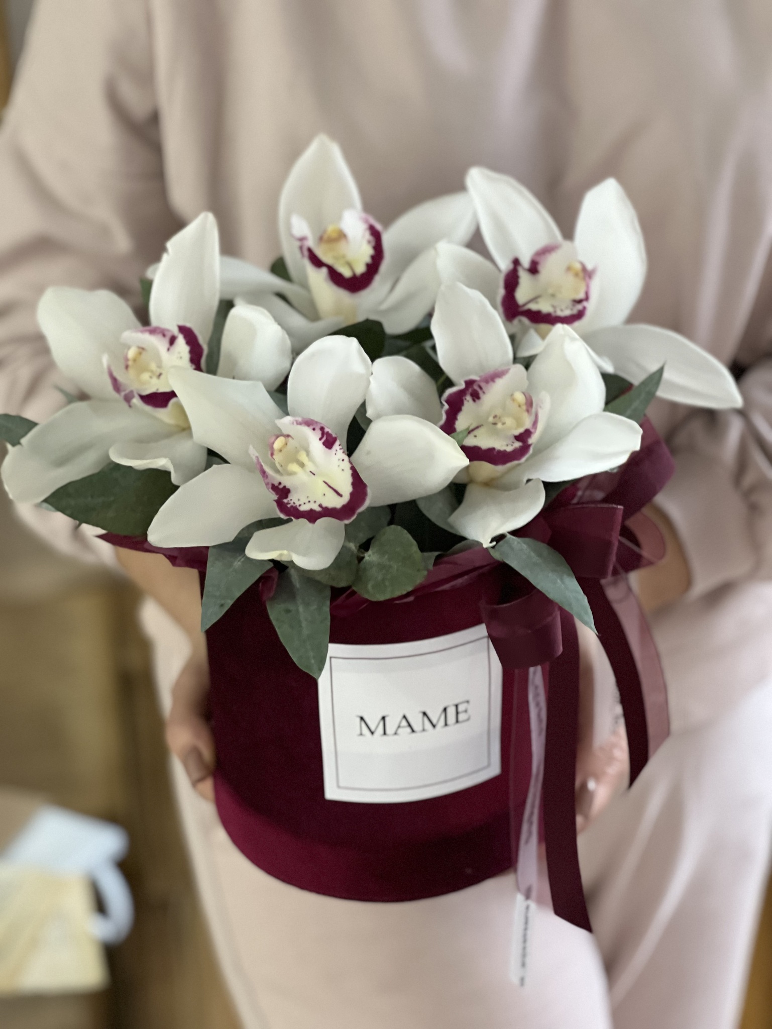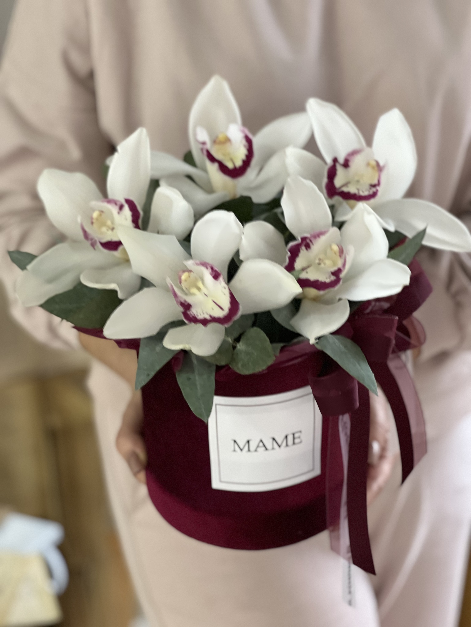 Подарите вашей маме в День Матери истинное произведение искусства — композицию из орхидеи цимбидиум и эвкалипта, оформленную в роскошную бархатную коробку винного оттенка! Эта элегантная композиция излучает утонченность и стиль, подчеркивая вашу любовь и заботу.