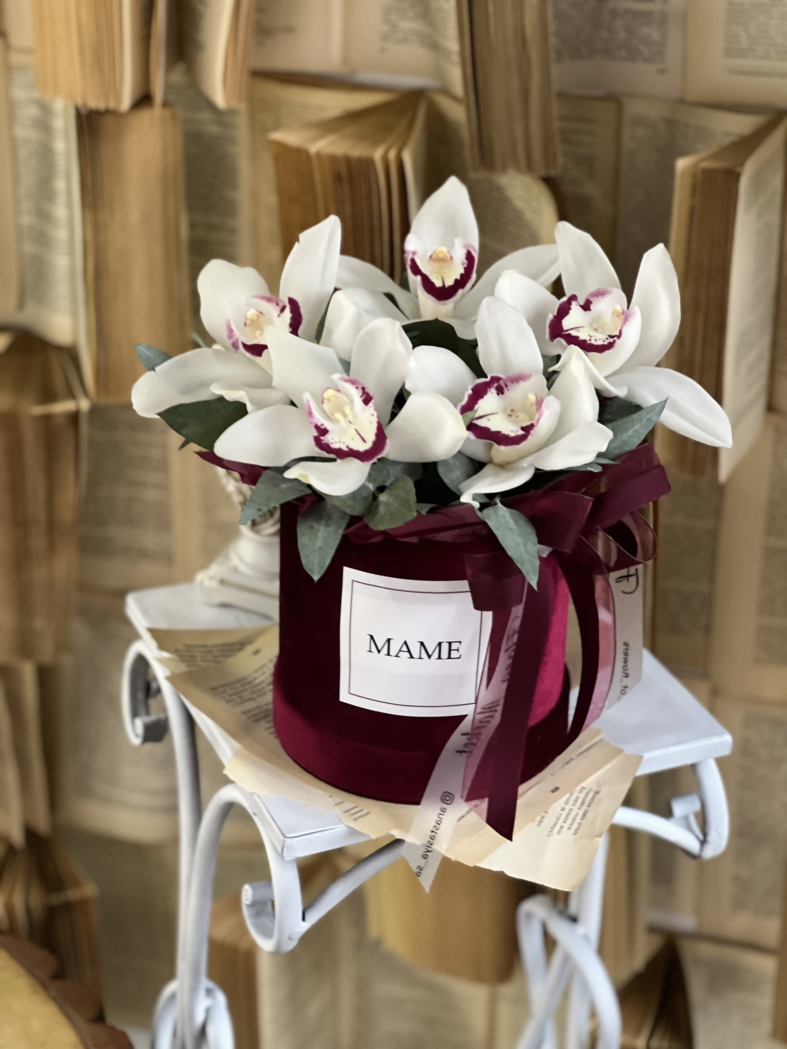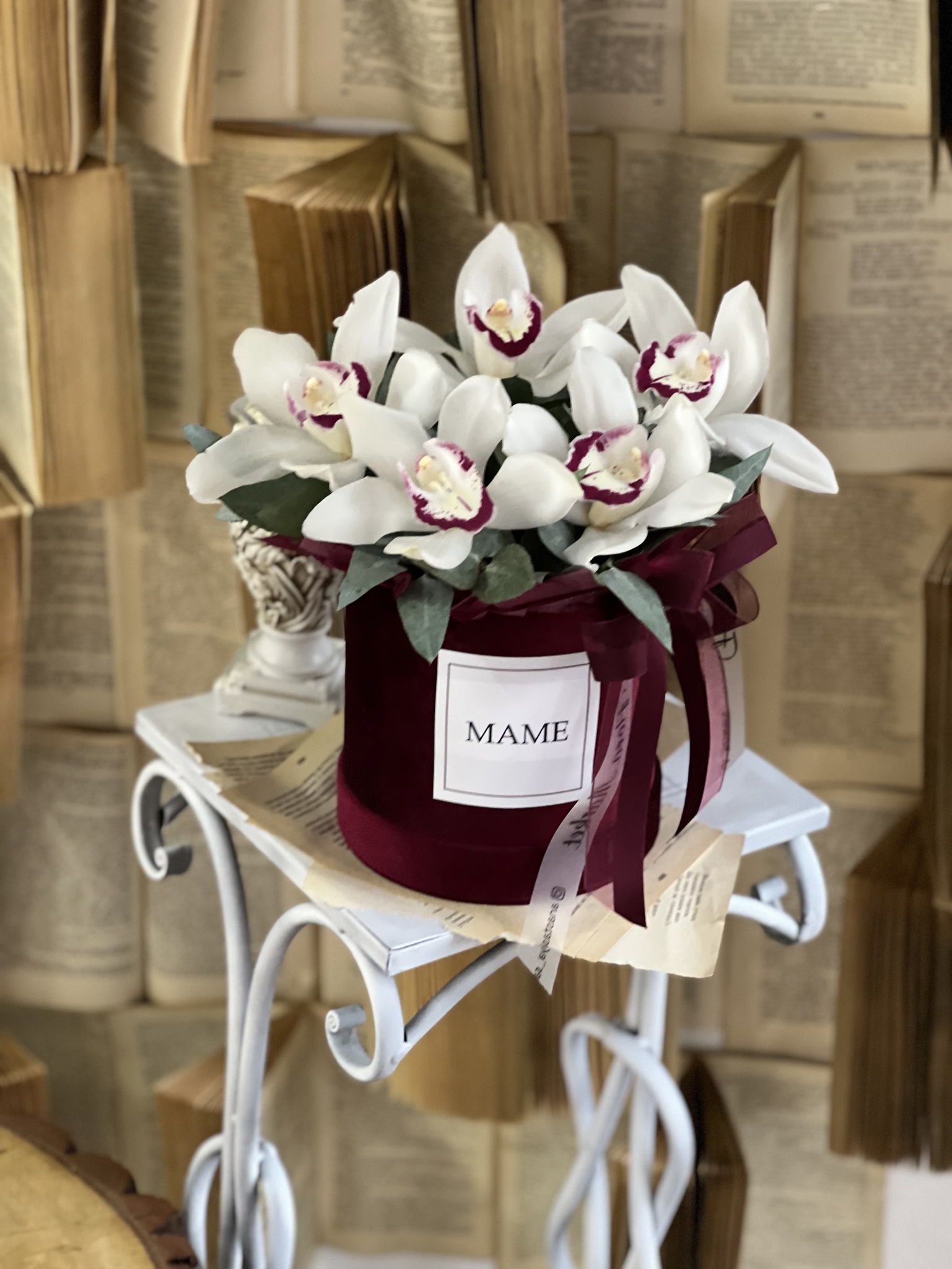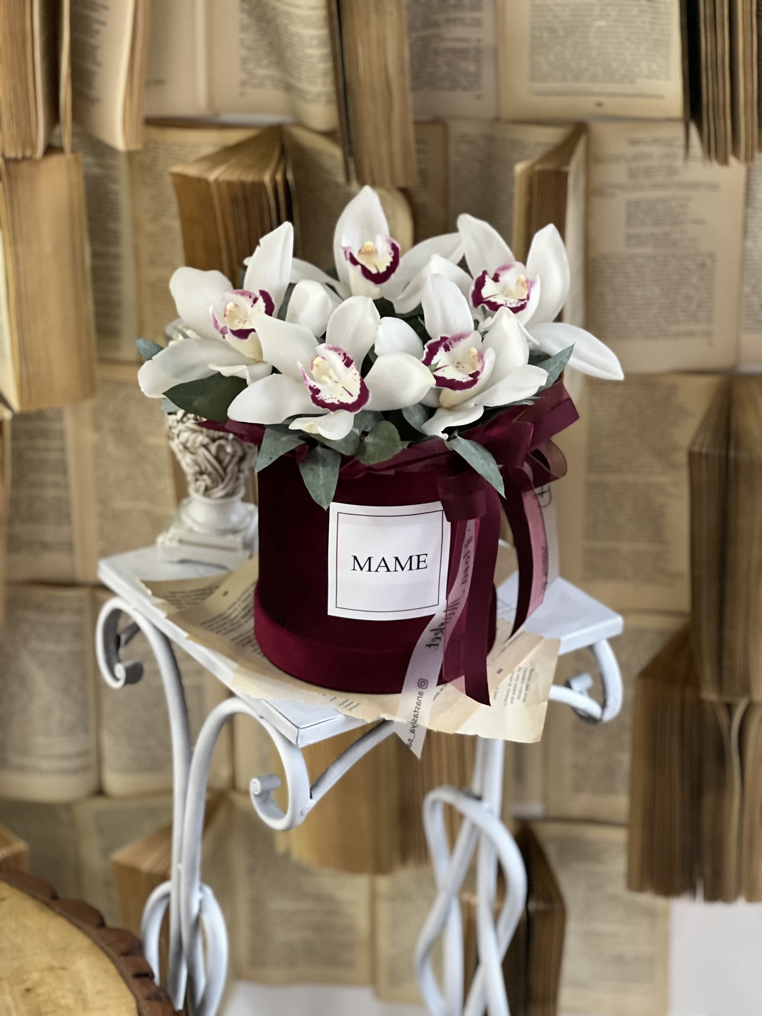 Орхидея Цимбидиум и эвкалипт в роскошной бархатной шляпной коробке.
