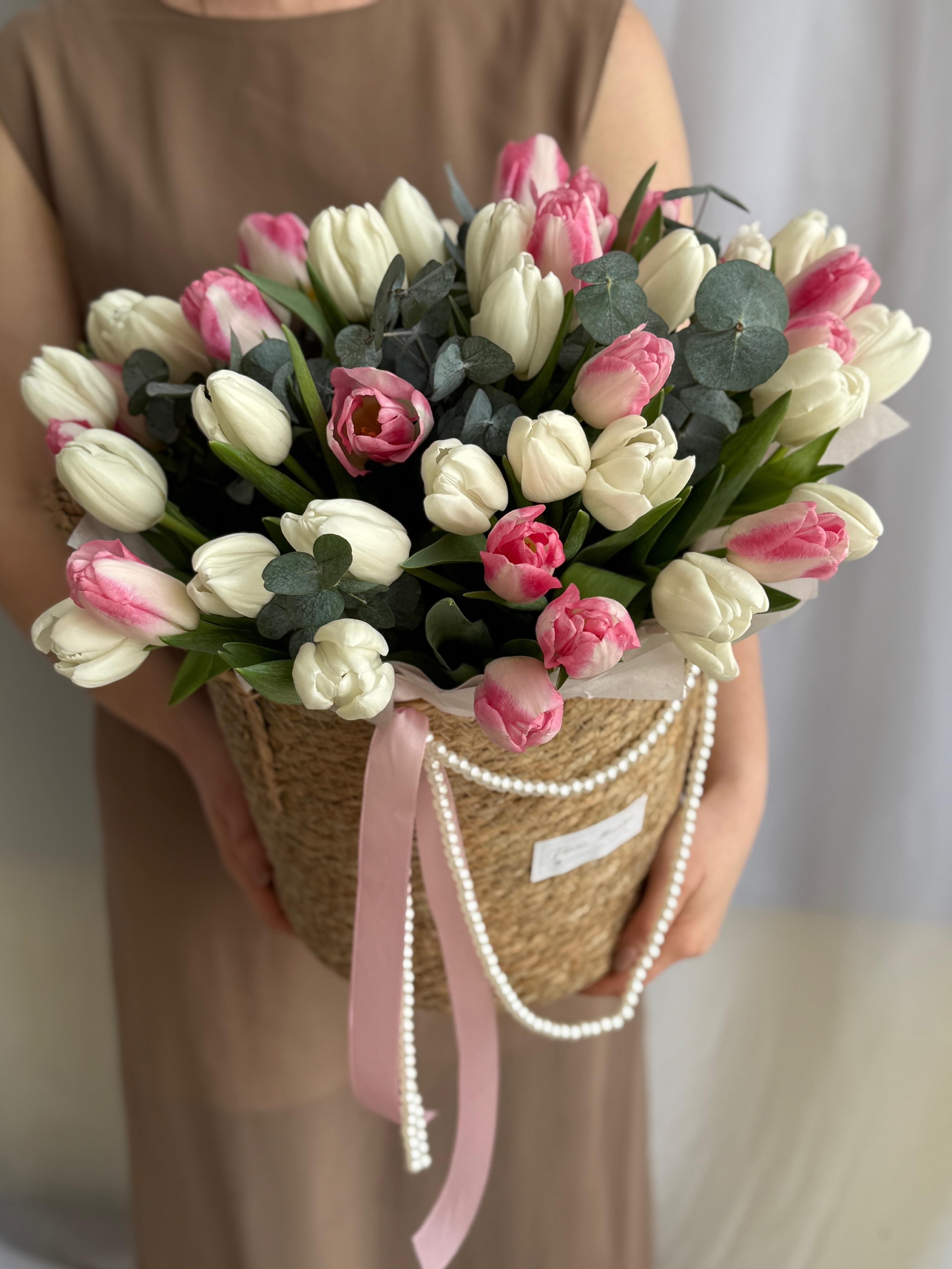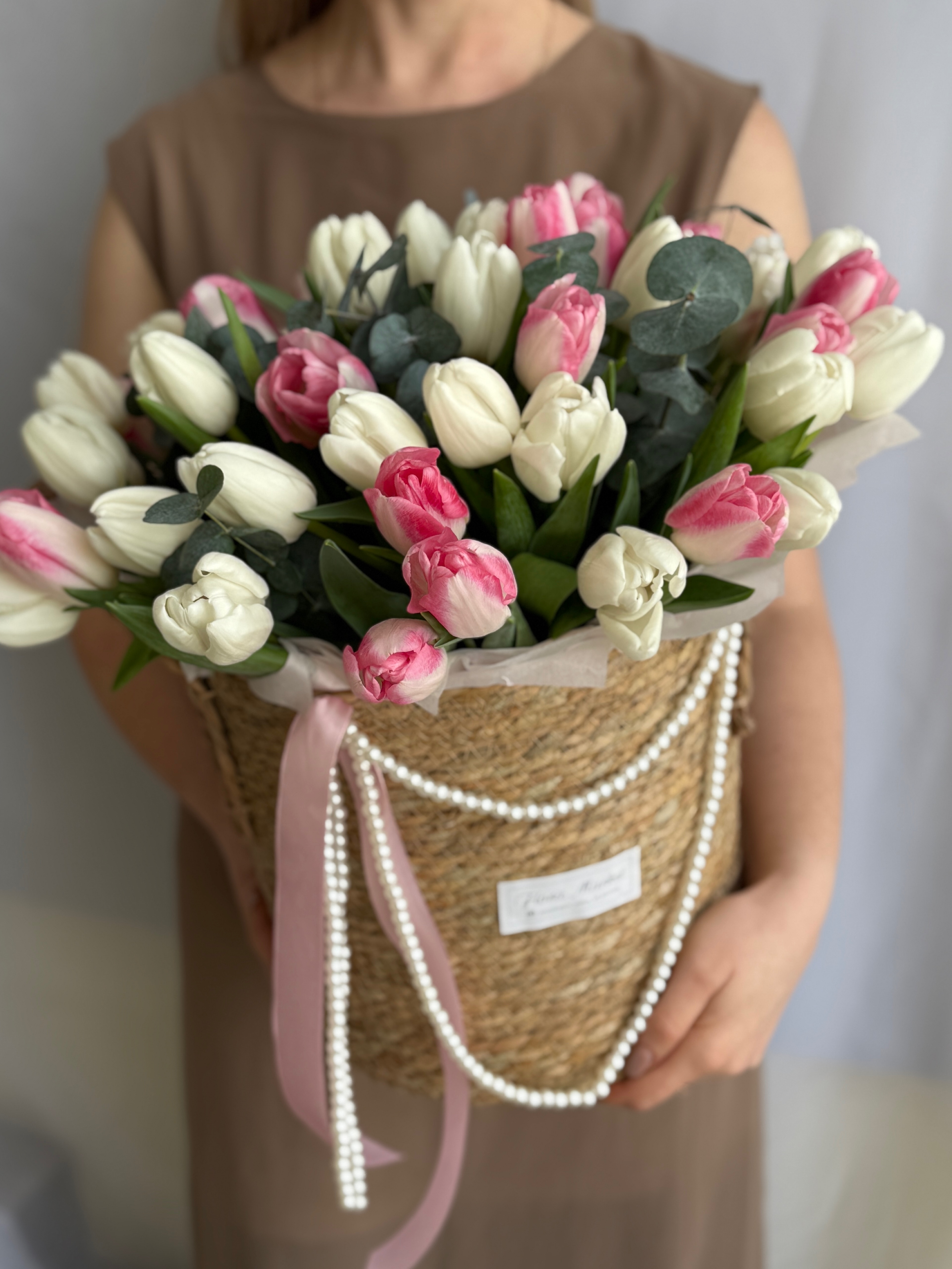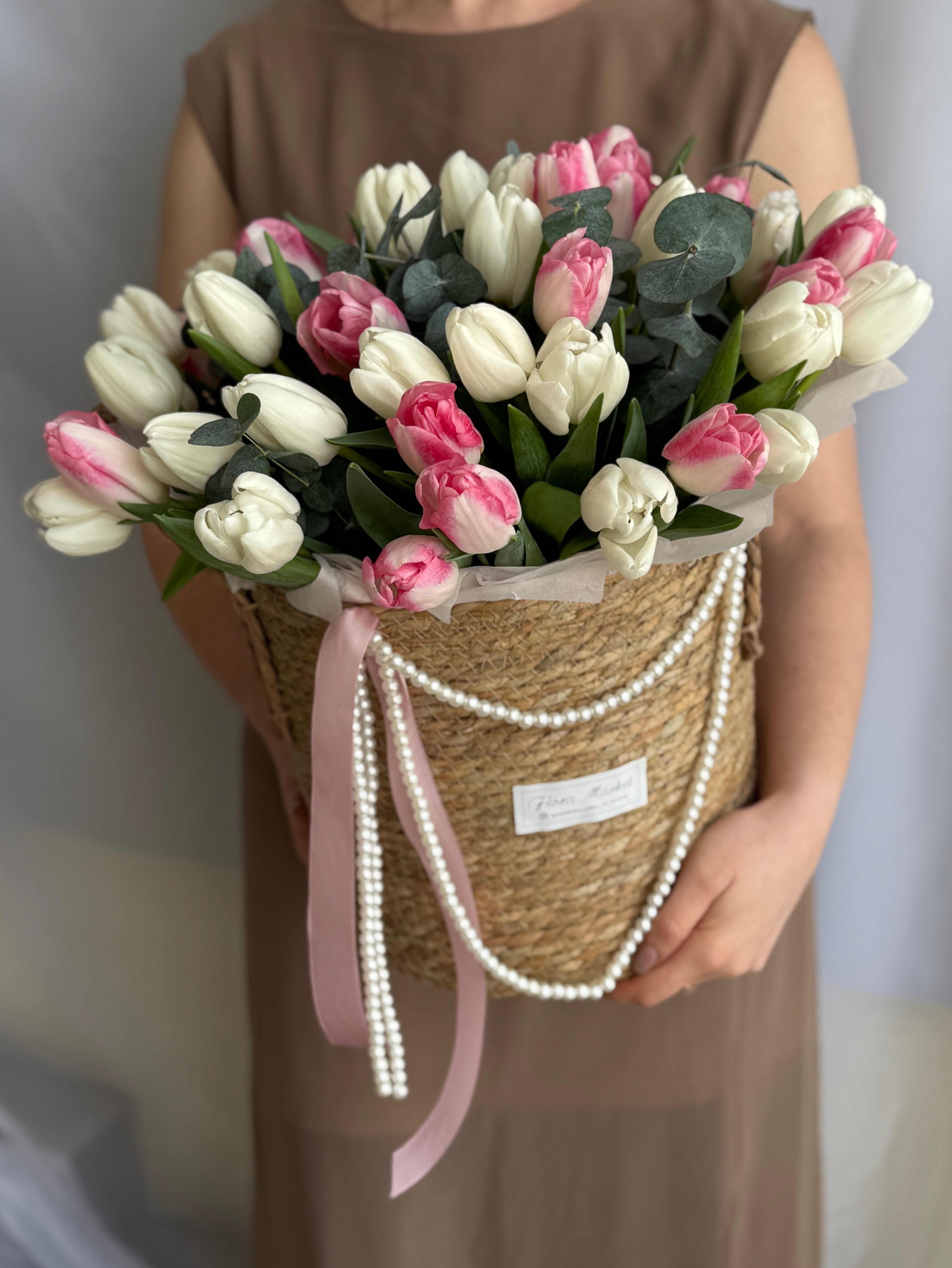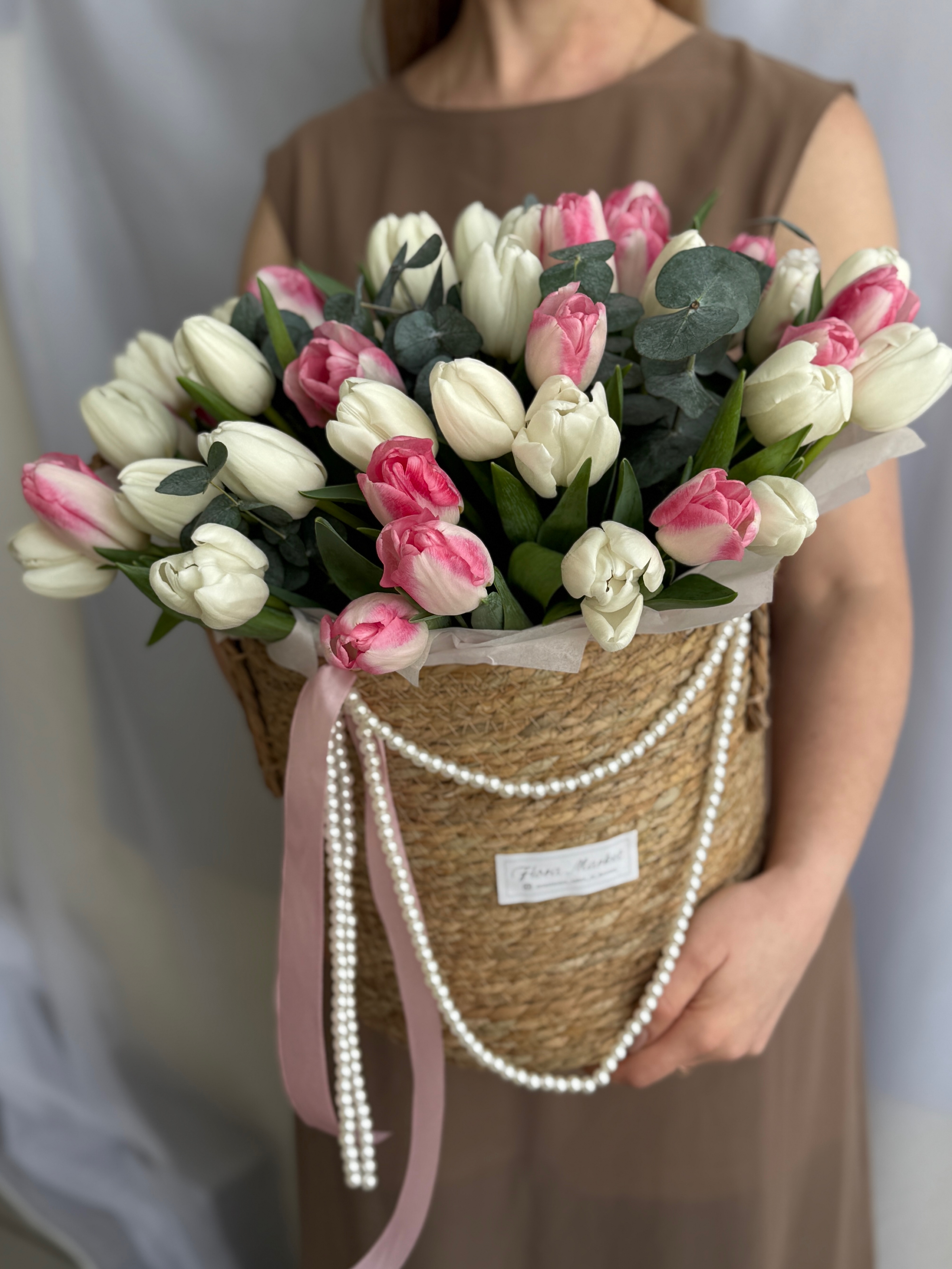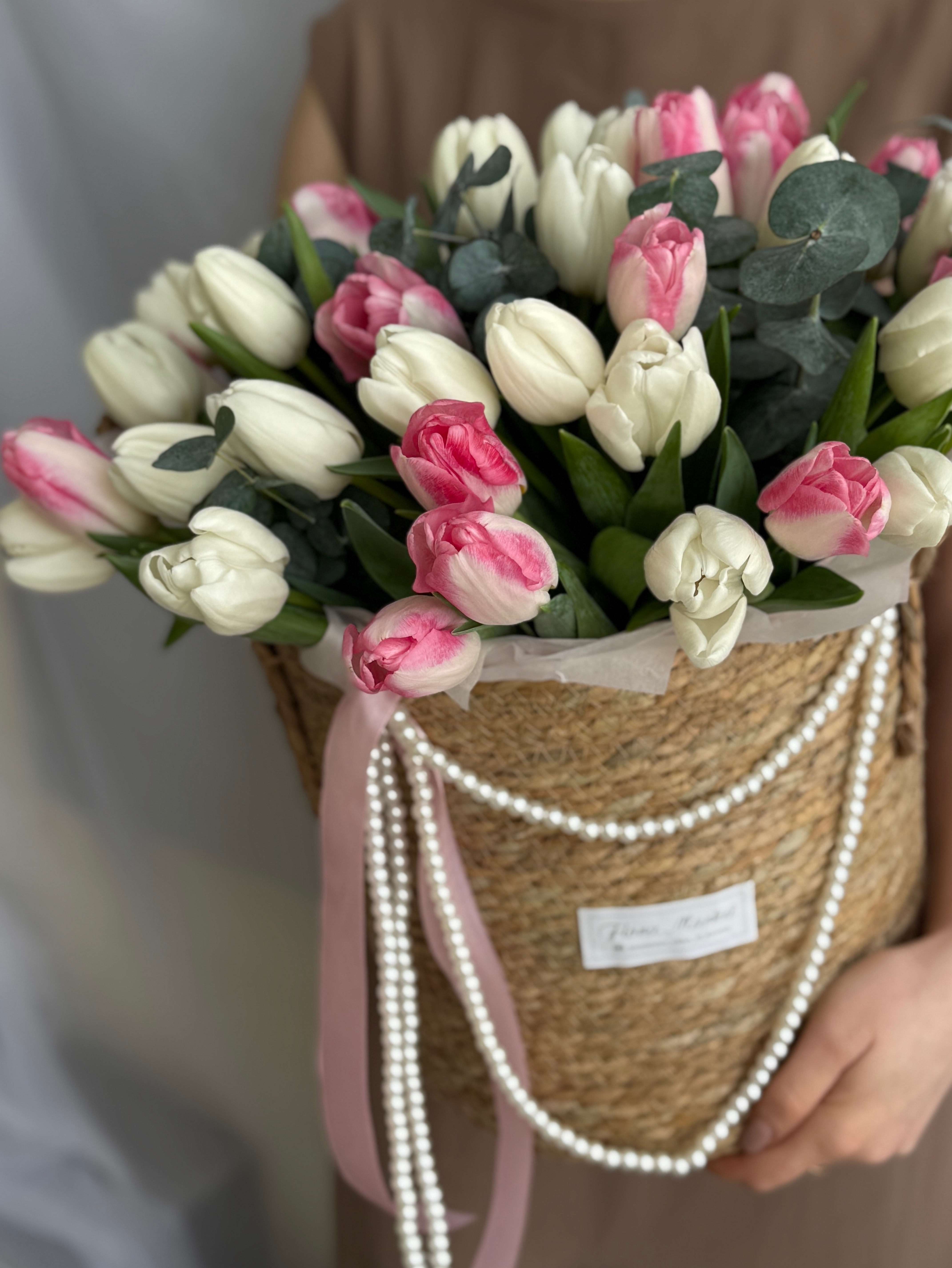 Утонченное сочетание белых и розовых тюльпанов в элегантной корзине от Флора Маркет.