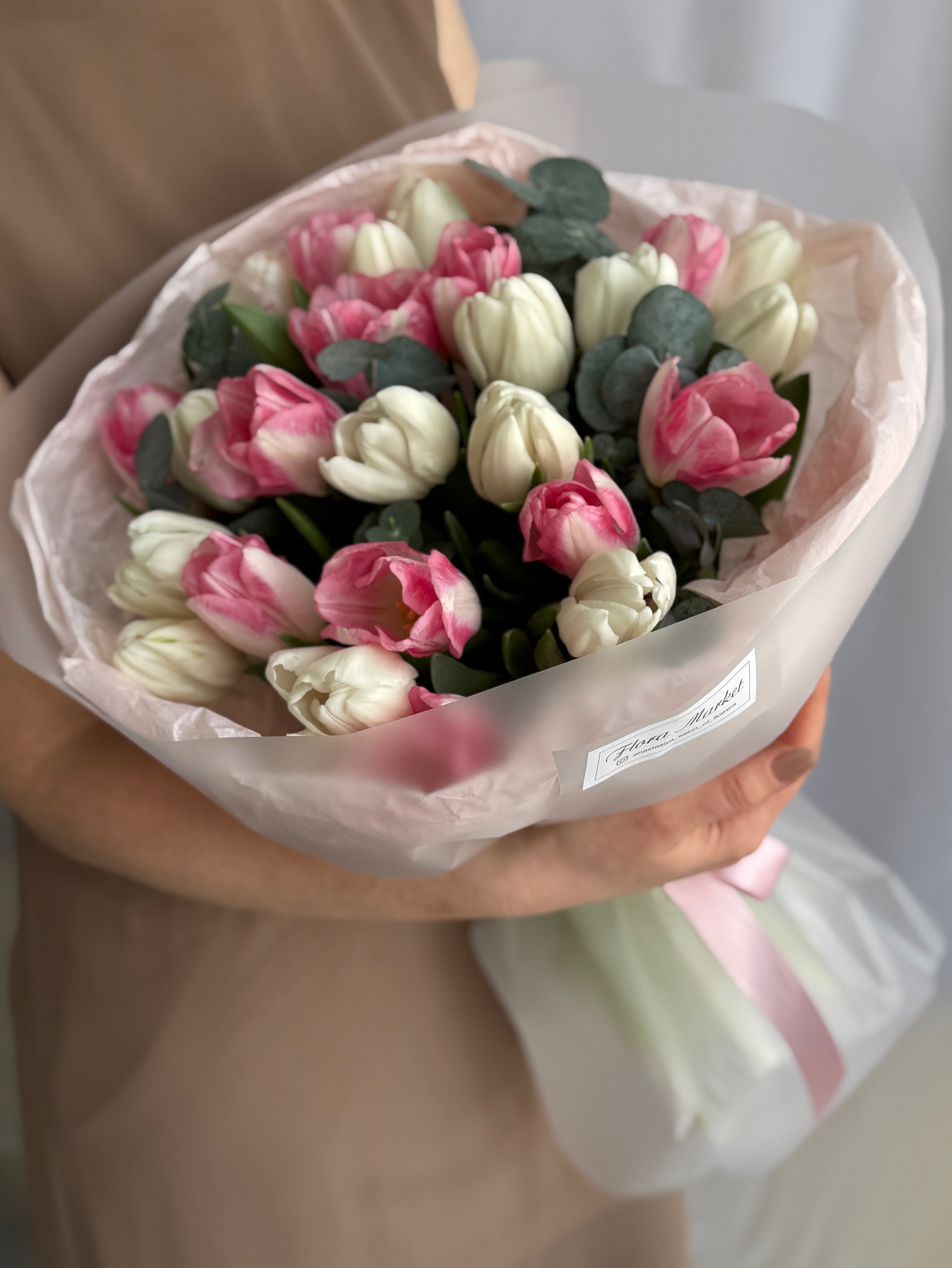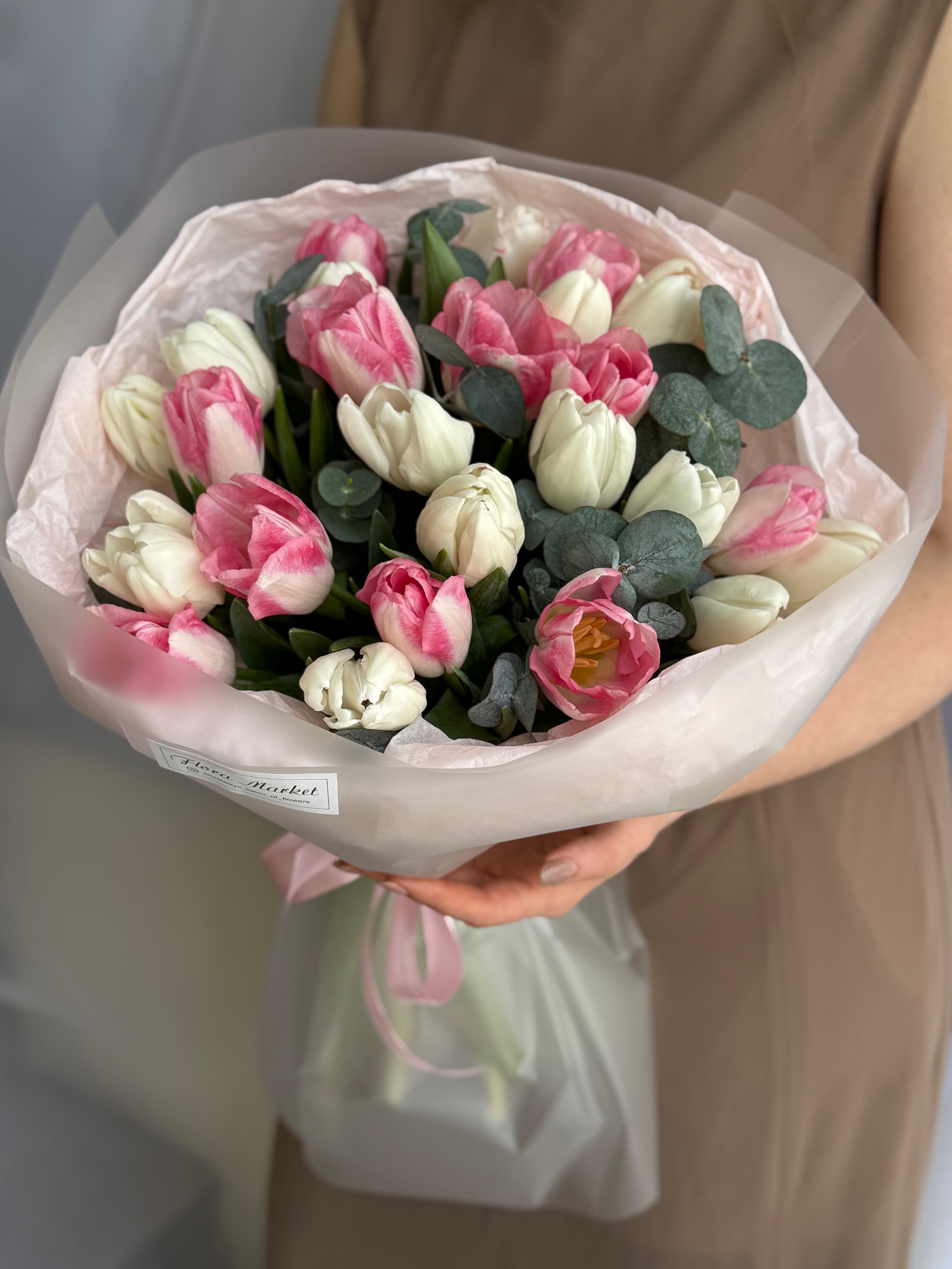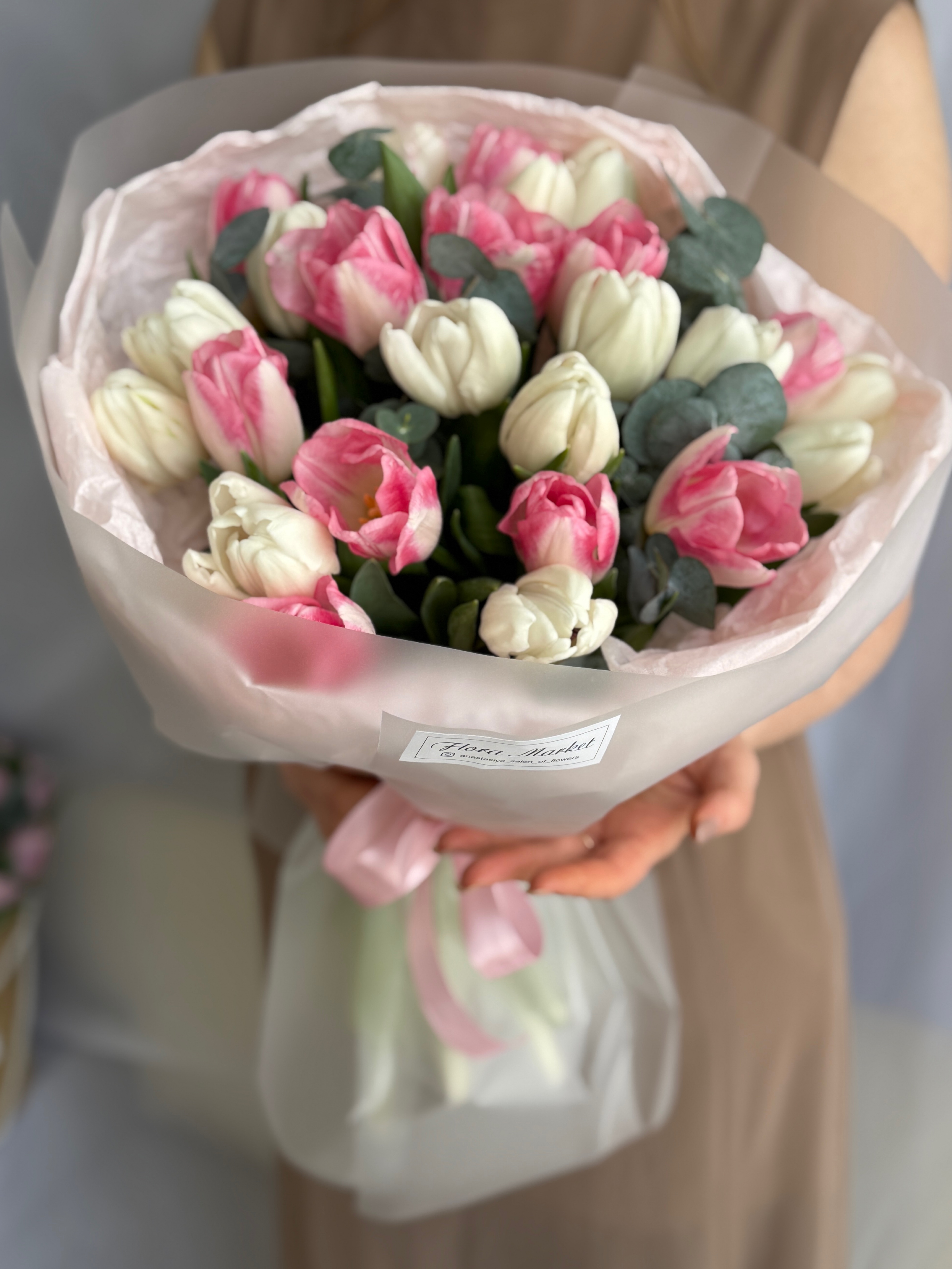 Весеннее сочетание белых, розовых тюльпанов и эвкалипта в объемном оформлении от Флора Маркет.