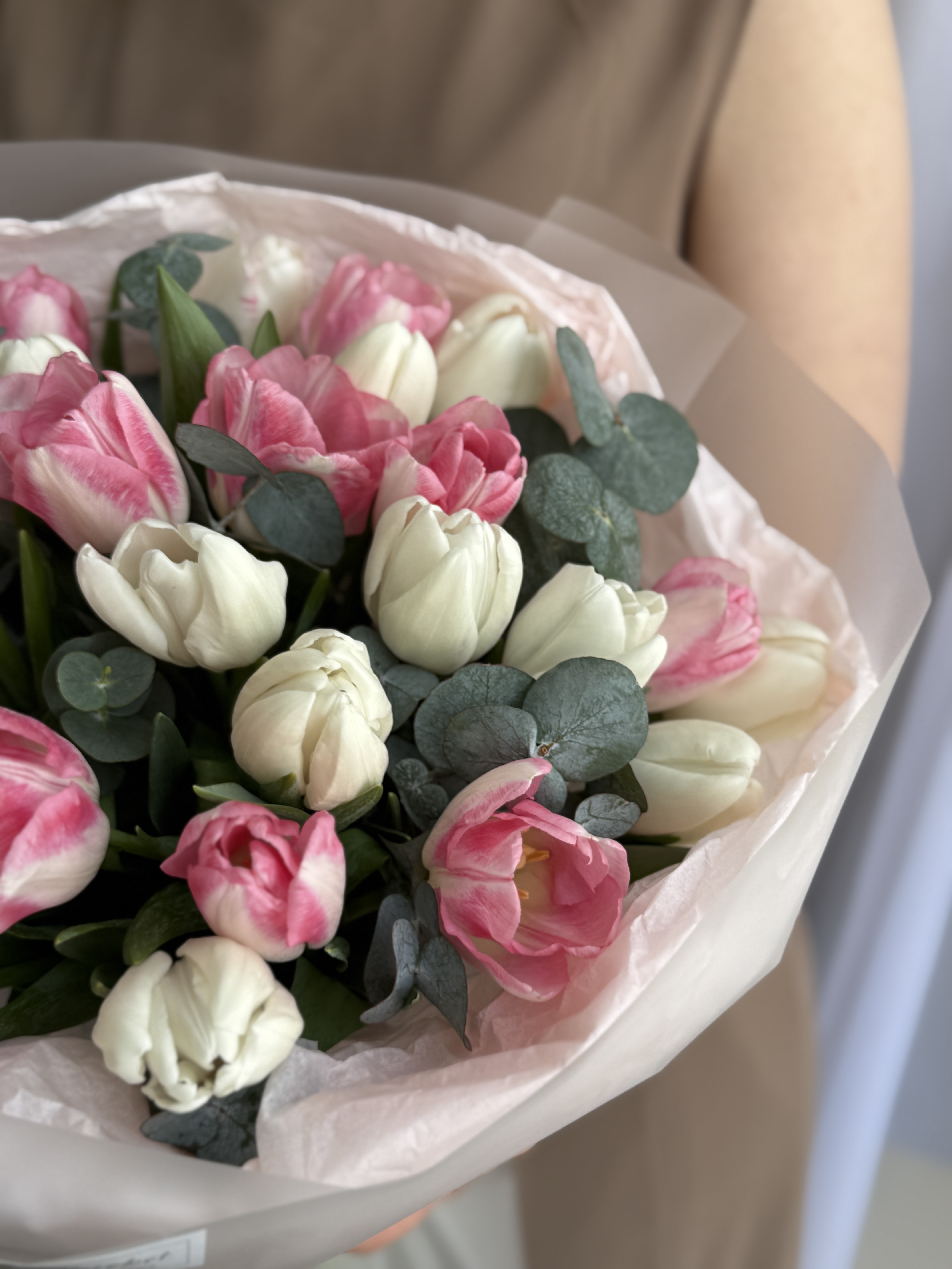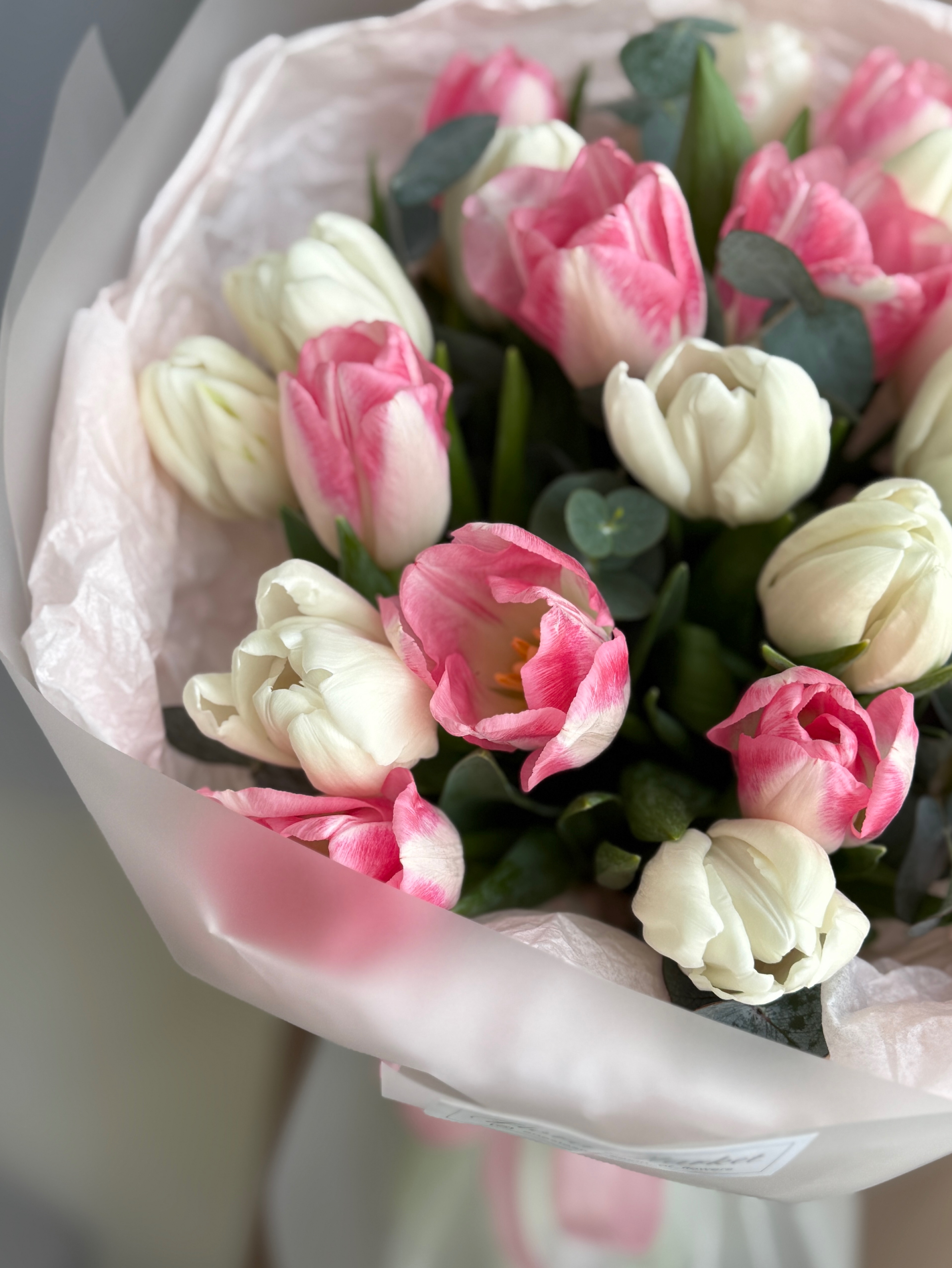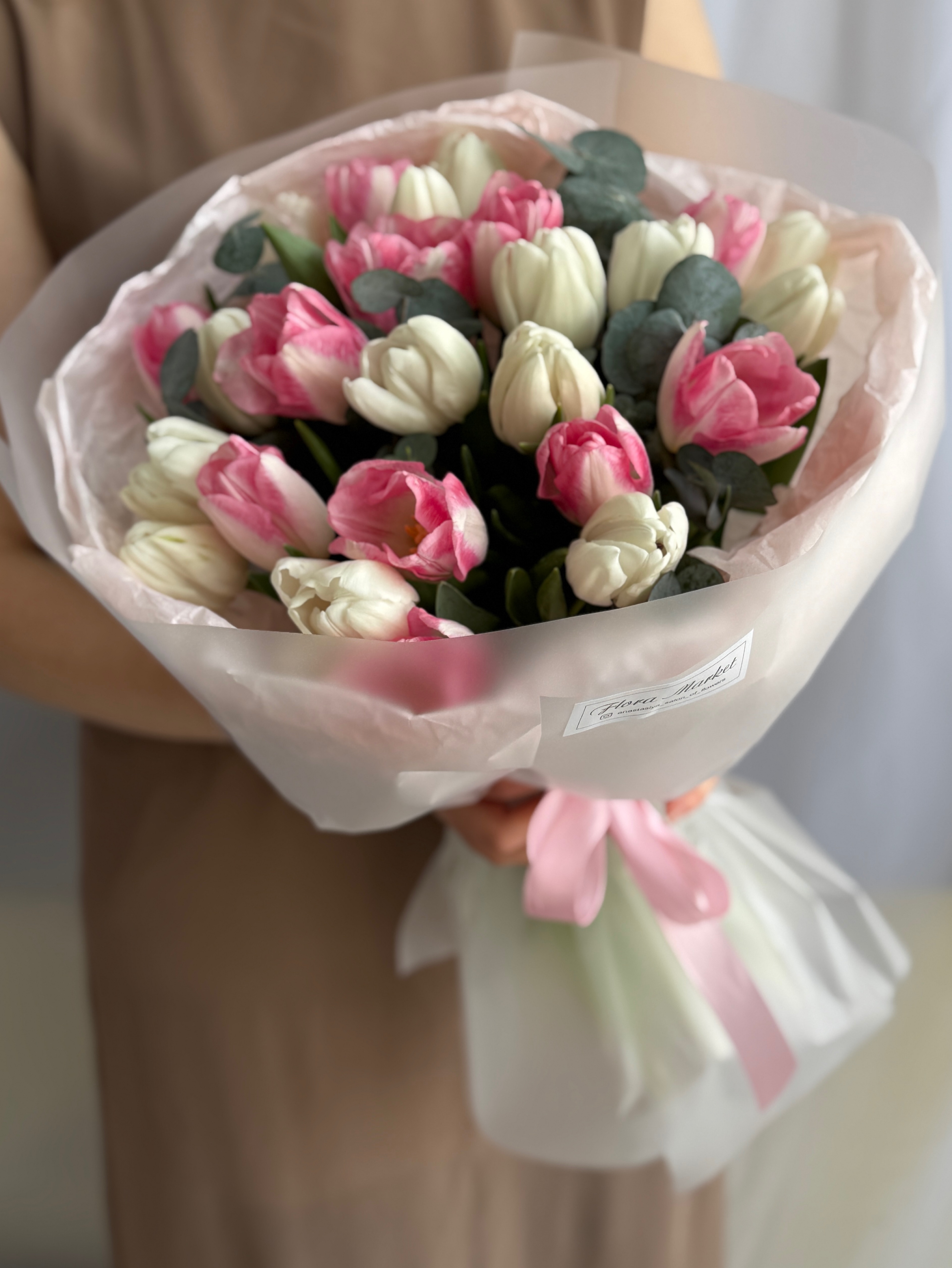 Весеннее сочетание белых, розовых тюльпанов и эвкалипта в объемном оформлении от Флора Маркет.