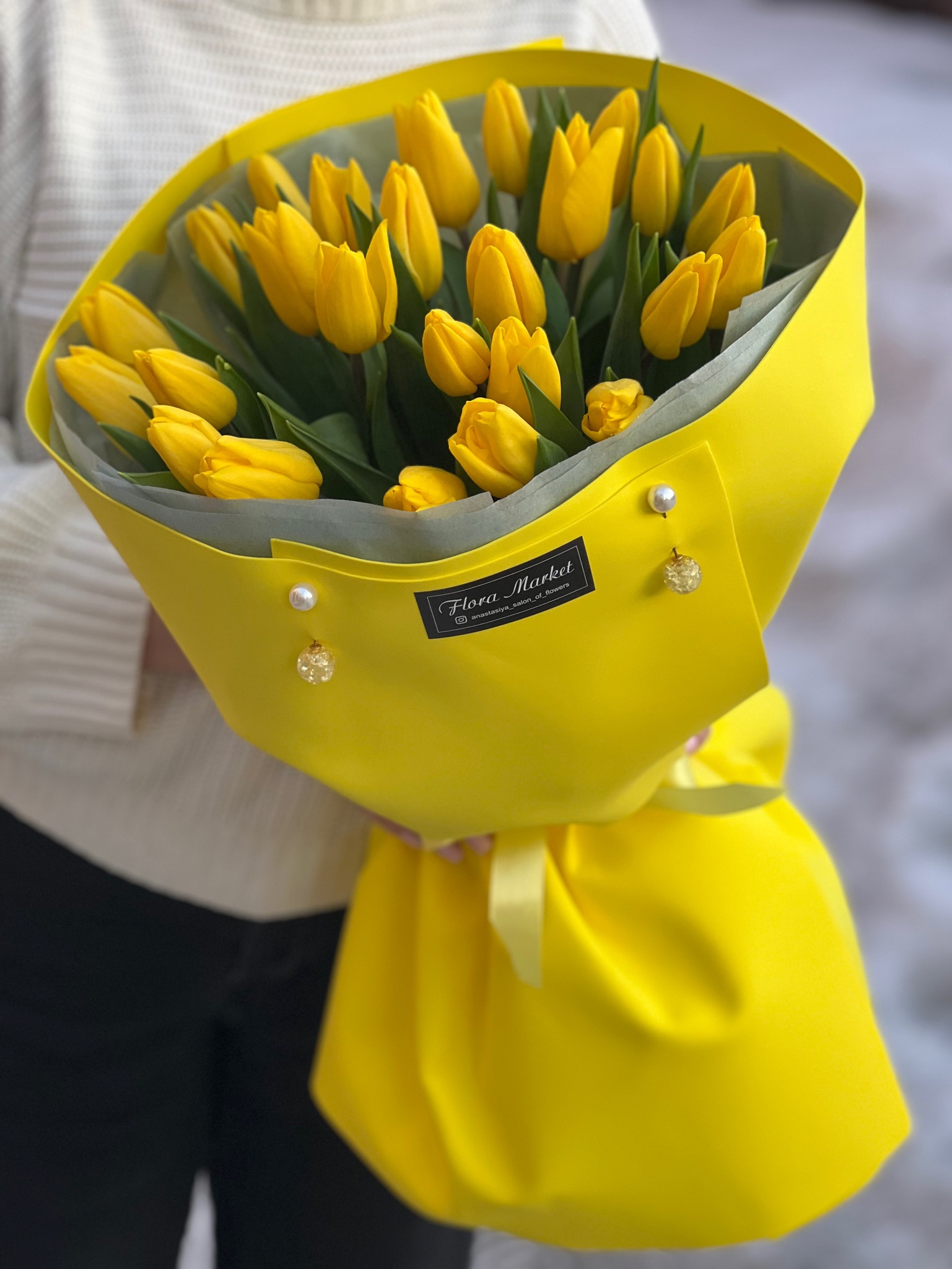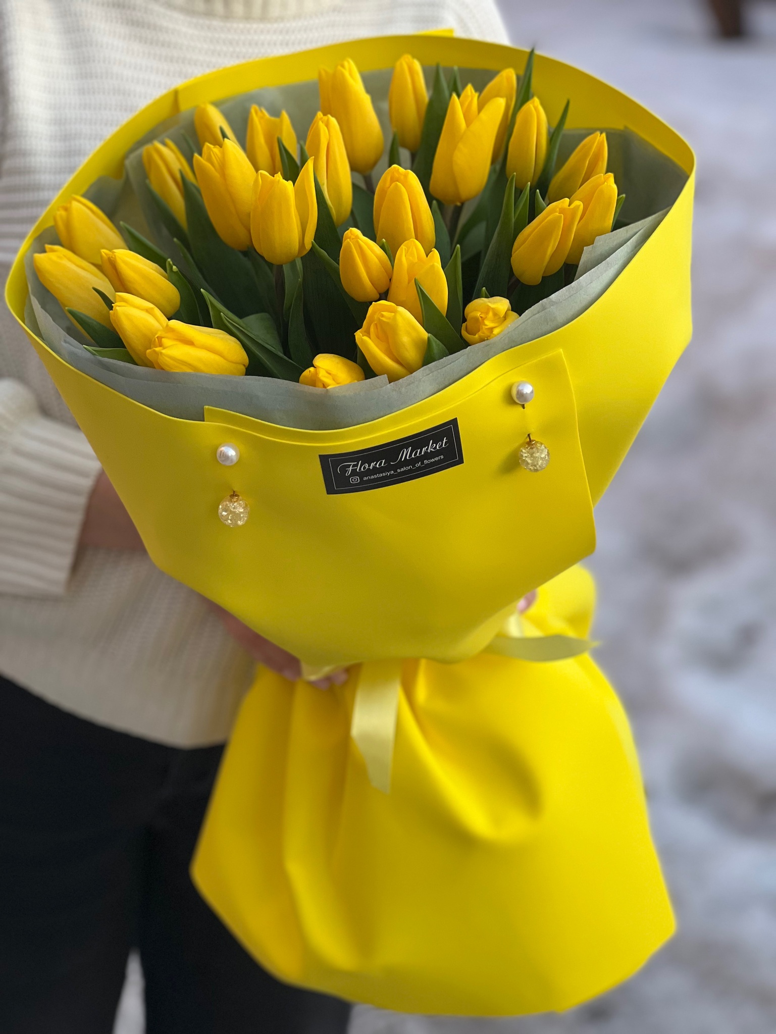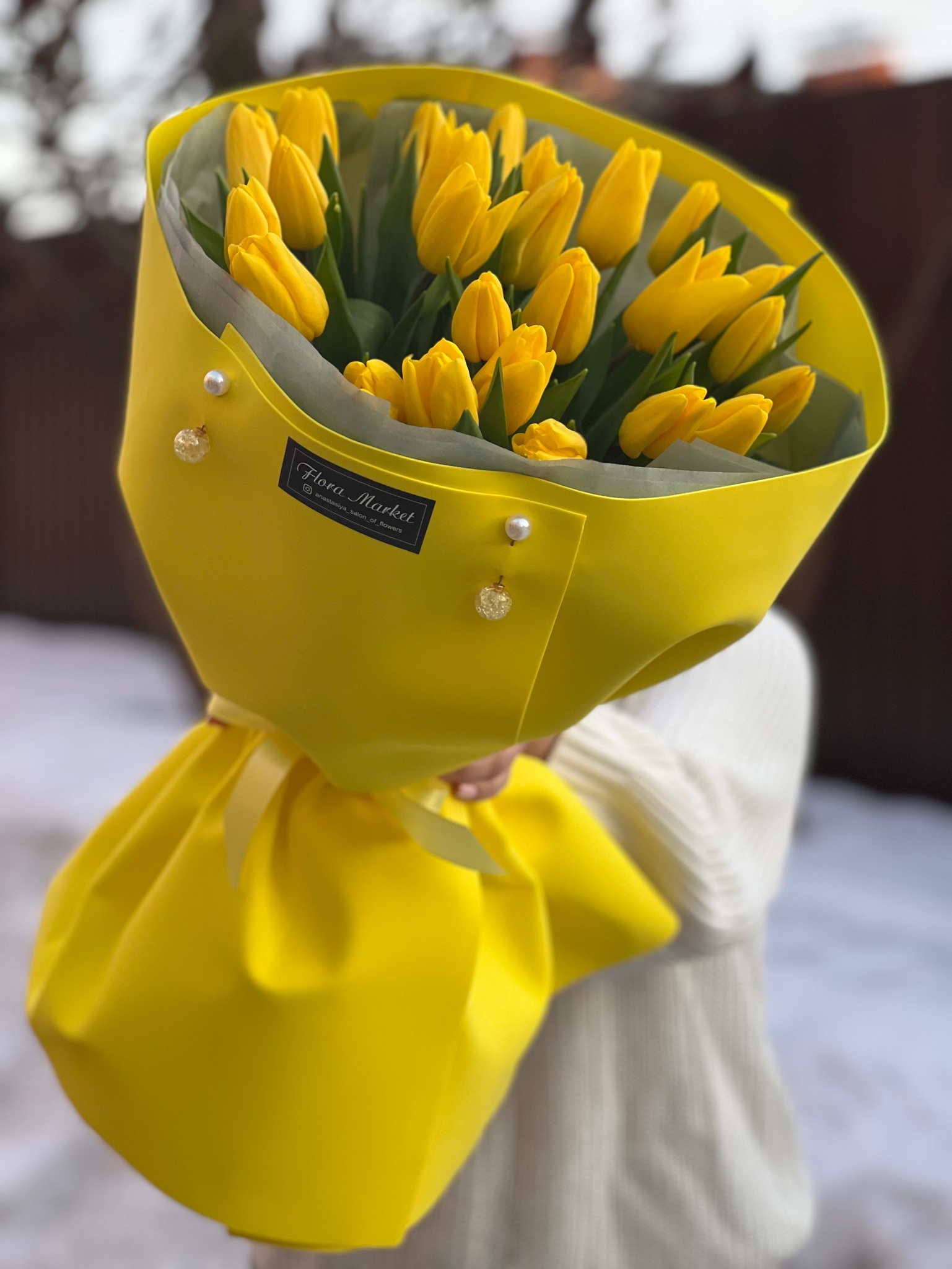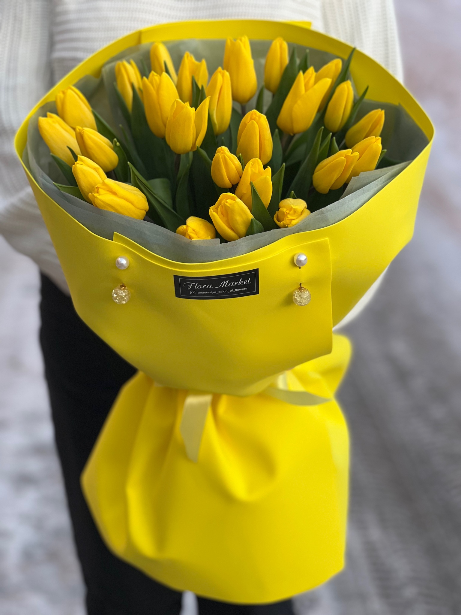Желтые тюльпаны в букете в авторском оформлении от Флора Маркет.
